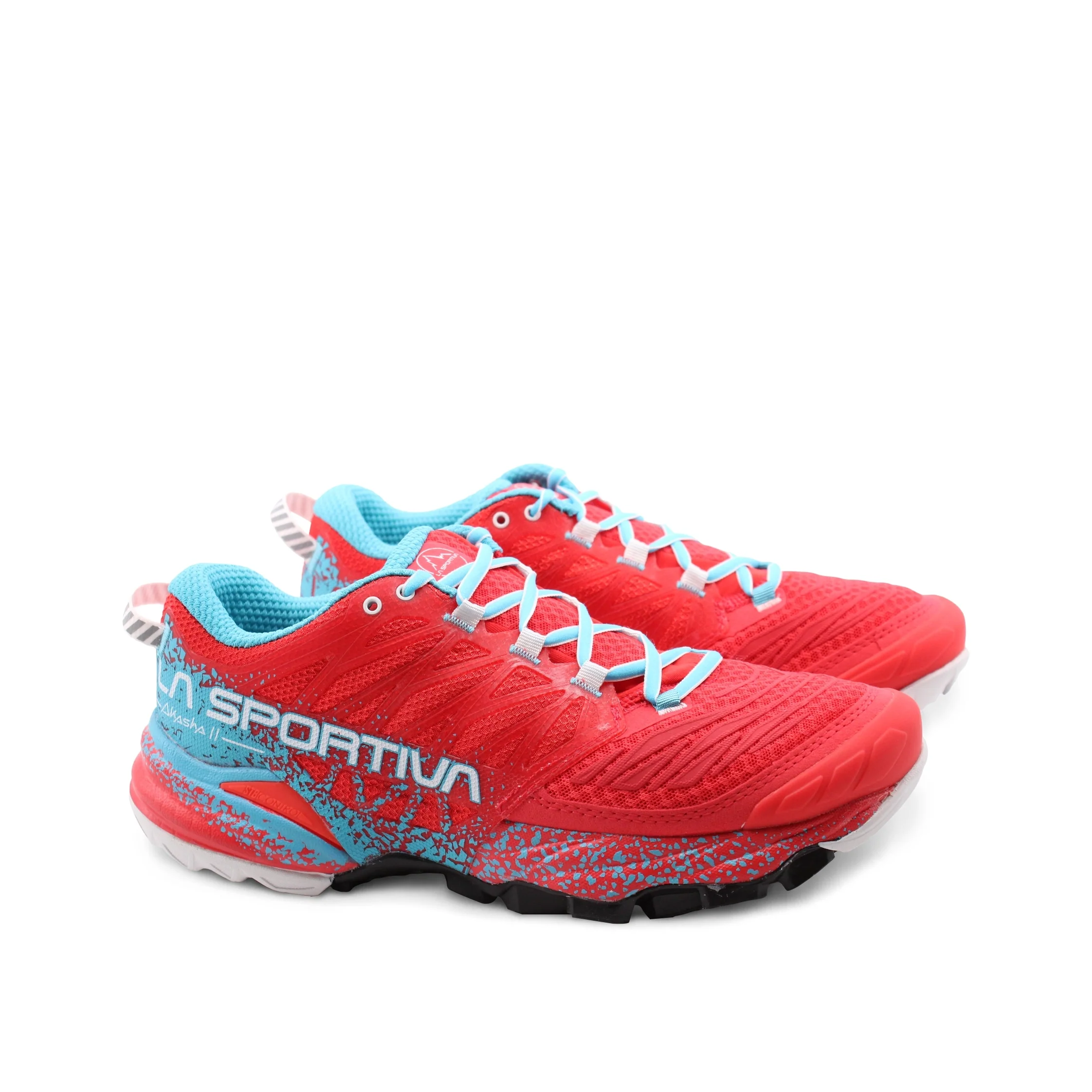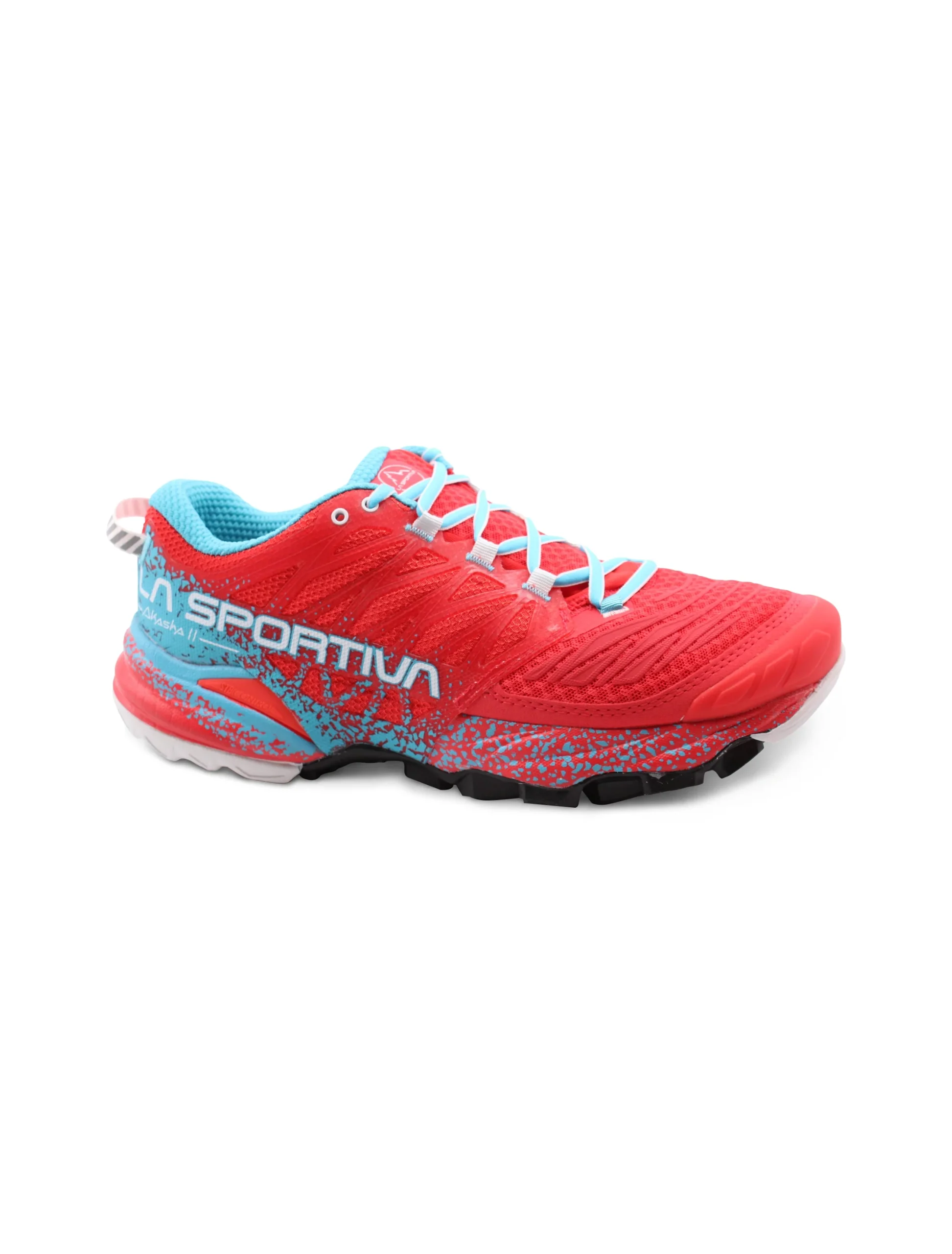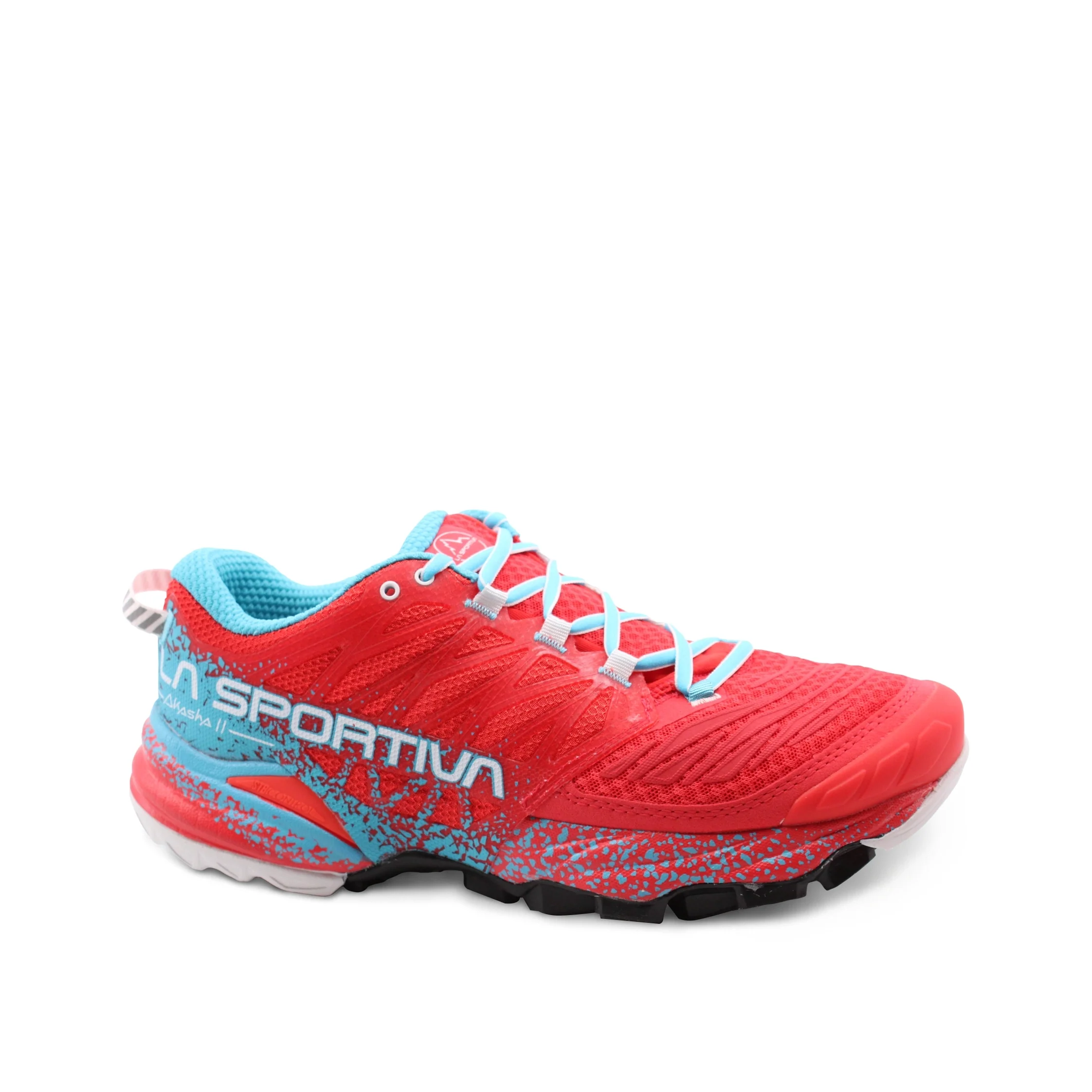 Scarpa da mountain running donna La Sportiva Akasha II in tessuto Air Mesh forato e PU con morbido sottopiede Ortholite, intersuola in EVA e suola FriXionยฎ Red, dotata dellโesclusiva soluzione Trail Rocker in grado di favorire il movimento naturale del piede durante la corsa. Comoda, leggera e traspirante: รจ perfetta per percorsi di lunga distanza e per utilizzi prolungati in allenamento.