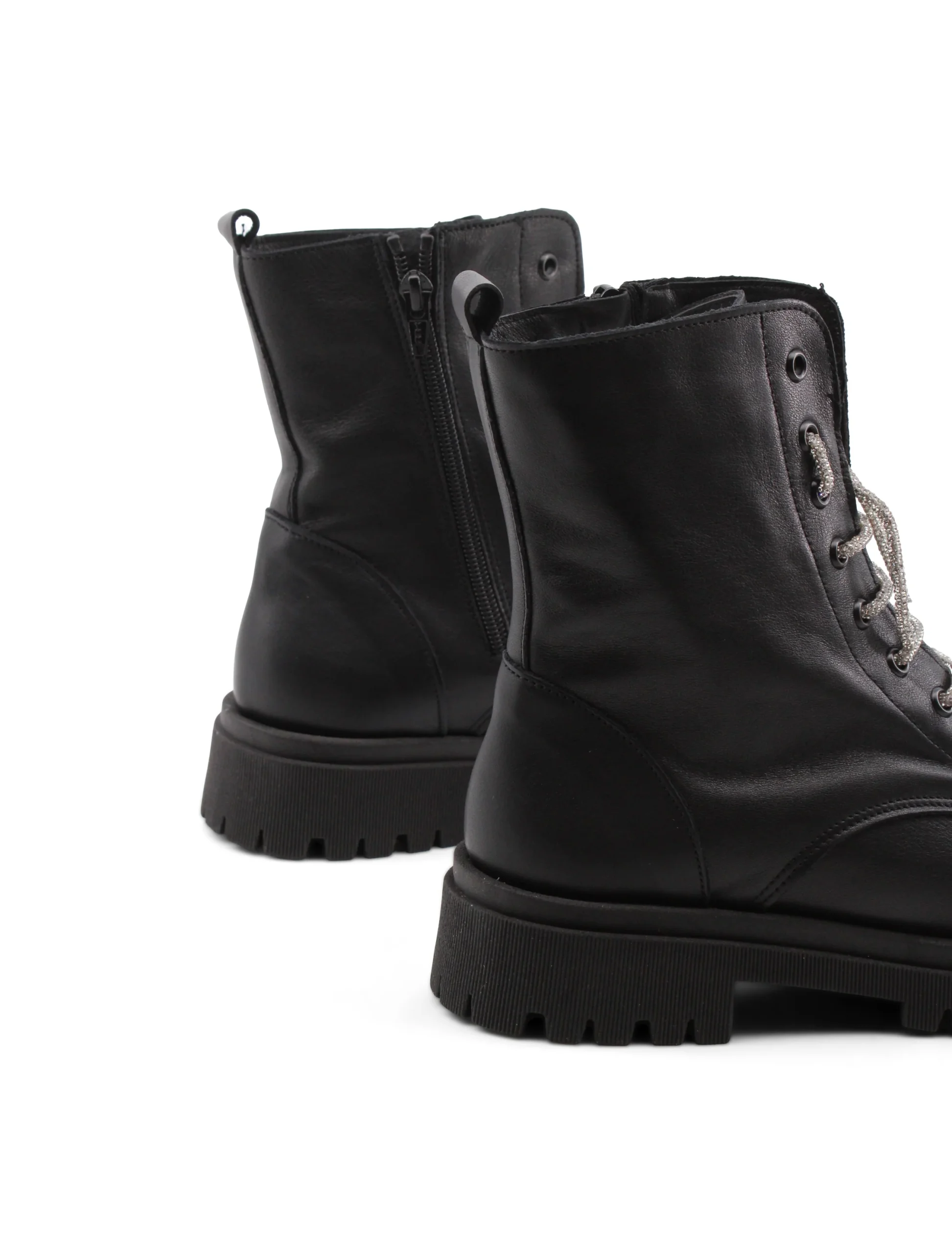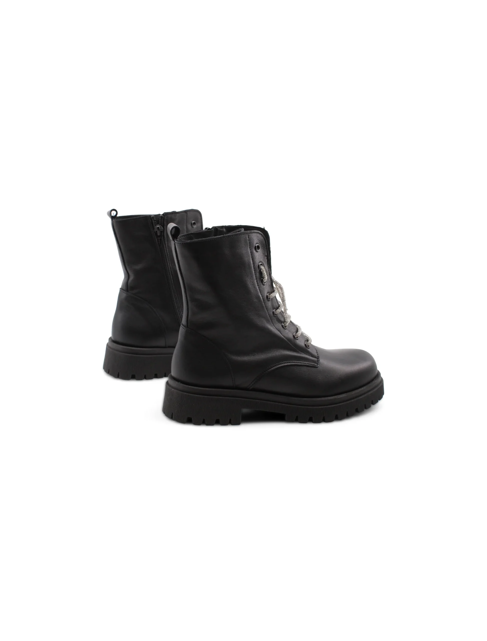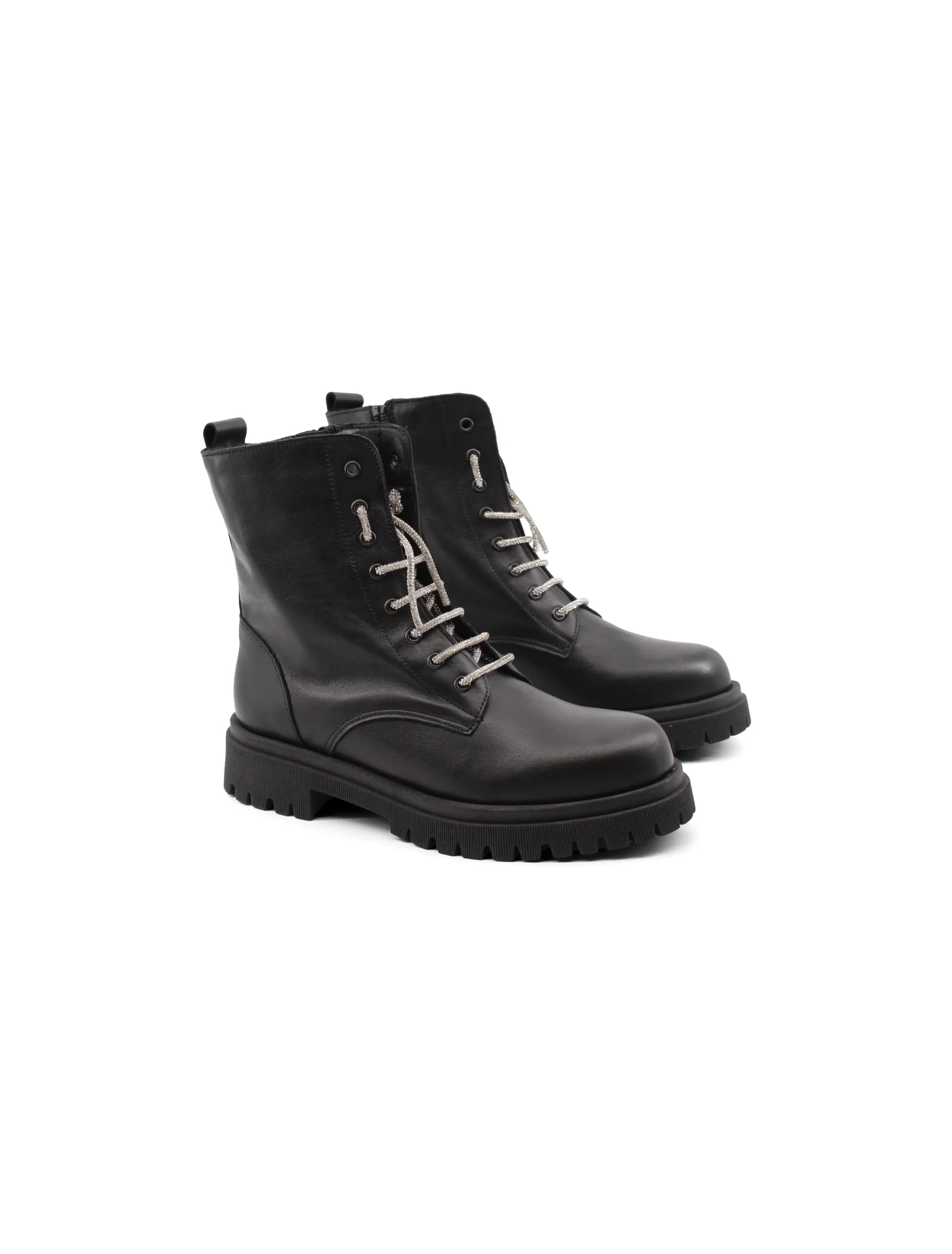 La suola in gomma assicura una buona aderenza, perfetta per affrontare qualsiasi terreno, mentre il tacco di 4,5 cm dona quel tocco di femminilitร senza rinunciare alla praticitร . Indossali per un look casual-chic o per dare un twist rock al tuo outfit, questi anfibi sono l’accessorio perfetto per ogni occasione. Con strass che brillano sui lacci, non passerai inosservata.