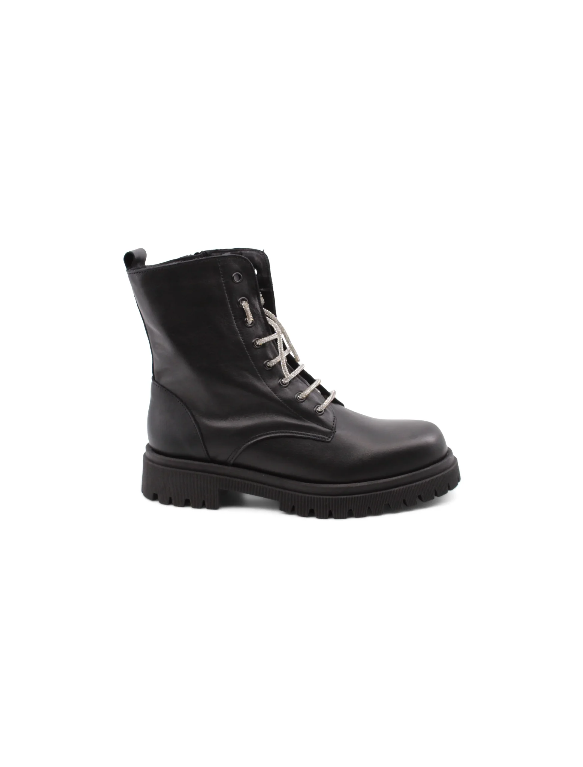 Presentiamo l’anfibio nero con strass sui lacci, un must-have per ogni donna che ama mescolare stile e comfort. Realizzato in Italia, questo anfibio non รจ solo un pezzo di moda, ma anche un esempio di qualitร artigianale. La tomaia in pelle offre una resistenza che si fa notare, mentre la fodera in pelle e tessuto garantisce una calzata comoda anche durante le giornate piรน lunghe.