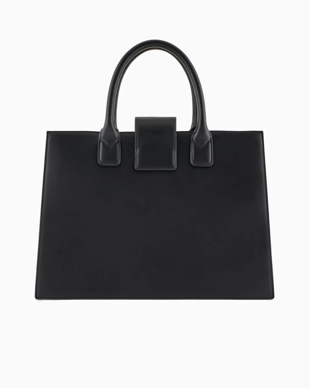 Borsa a mano dalla forma a trapezio, elegante e sofisticata. Il design strutturato dona un aspetto moderno e versatile, perfetto per ogni occasione. La tracolla removibile permette di trasformarla facilmente in una borsa a mano o a tracolla, offrendo praticità e stile. La chiusura ad incastro assicura sicurezza e facilità d’uso, mentre la decorazione con logo aggiunge un tocco distintivo e raffinato. Un accessorio chic e funzionale, ideale per completare qualsiasi outfit con eleganza.