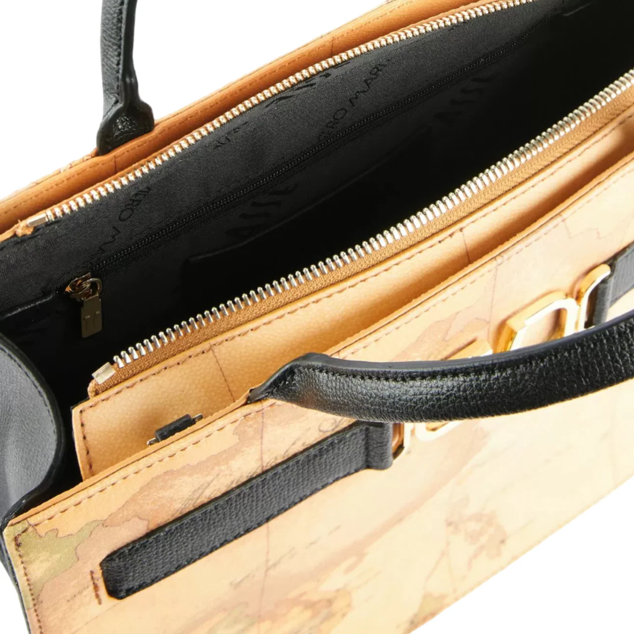 La borsa a mano Alviero Martini Geo Classic da donna รจ un accessorio elegante e versatile, caratterizzato dalla stampa iconica e dai dettagli neri a contrasto. Dotata di una tracolla regolabile e rimovibile, si adatta sia a uno stile casual che formale. Il design interno offre tre tasche pratiche, di cui una con chiusura a zip per tenere al sicuro piccoli oggetti, e il logo frontale aggiunge un tocco distintivo al look.