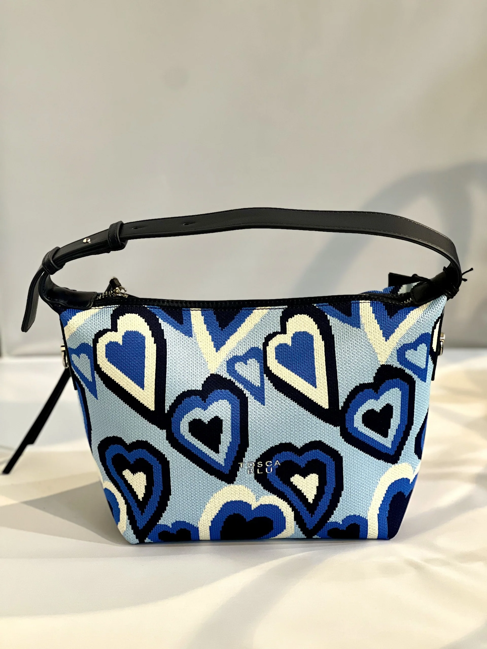 Lasciati conquistare da questa borsa sacca declinata nelle varie gradazioni di blu e azzurro. Nonostante la dimensione compatta, sarà in grado di contenere tutto l’essenziale per le tue serate fuori. La romantica fantasia a cuori all over dona un tocco dinamico a questo accessorio da indossare sia a spalla che crossbody grazie alla tracolla in dotazione. Completa questa borsa sacca una zip metallica che regola la chiusura e il logo sulla parte frontale.