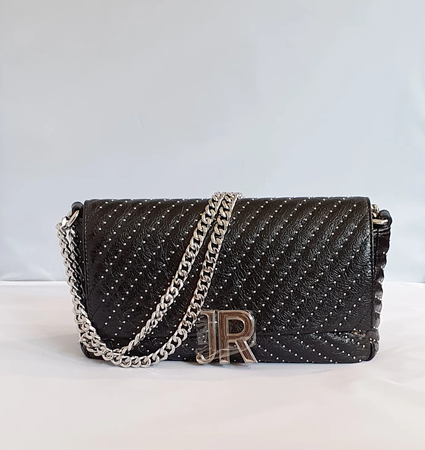 Tracolla con effetto trapuntato impreziosita da borchie silver, chiusura con bottone a pressione, tracolla scorrevole a catena, placca con logo. Dimensioni: 27x14x9cm