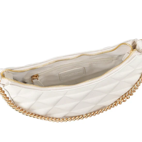 La borsa a tracolla dalla forma a mezzaluna รจ un gioiello di stile e praticitร firmato Tosca Blu. Presenta una fine lavorazione a rombi color avorio e una chiusura con zip che garantisce sicurezza. La tracolla in metallo dorato รจ regolabile e removibile, cosรฌ da poter personalizzare il tuo look e adattarlo ad ogni occasione. L’interno, con un compatto scomparto e una tasca con zip, offre tutto lo spazio necessario per i tuoi effetti personali. La borsa a tracolla firmata Tosca Blu รจ ideale per un’uscita speciale o per completare il tuo look casual-chic.