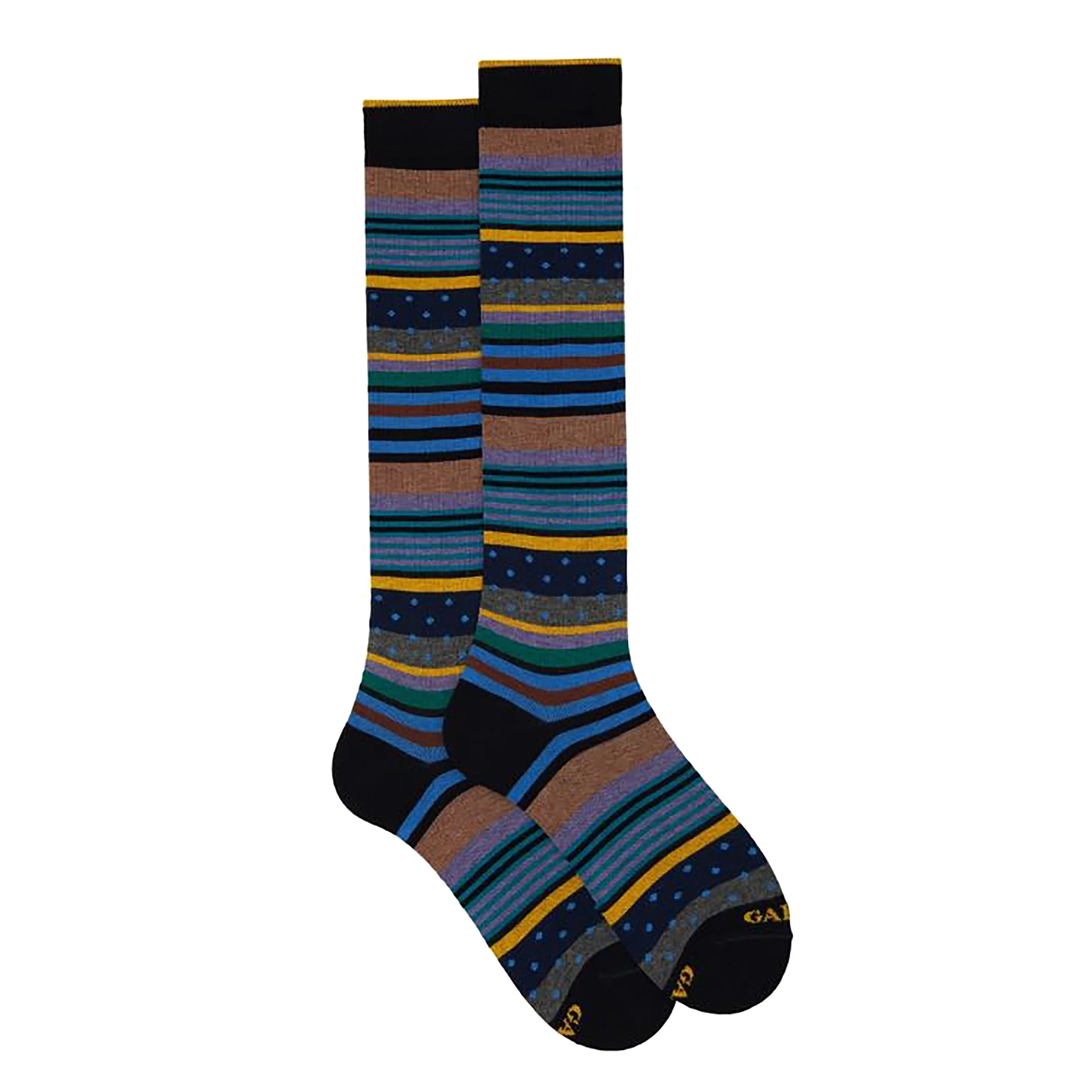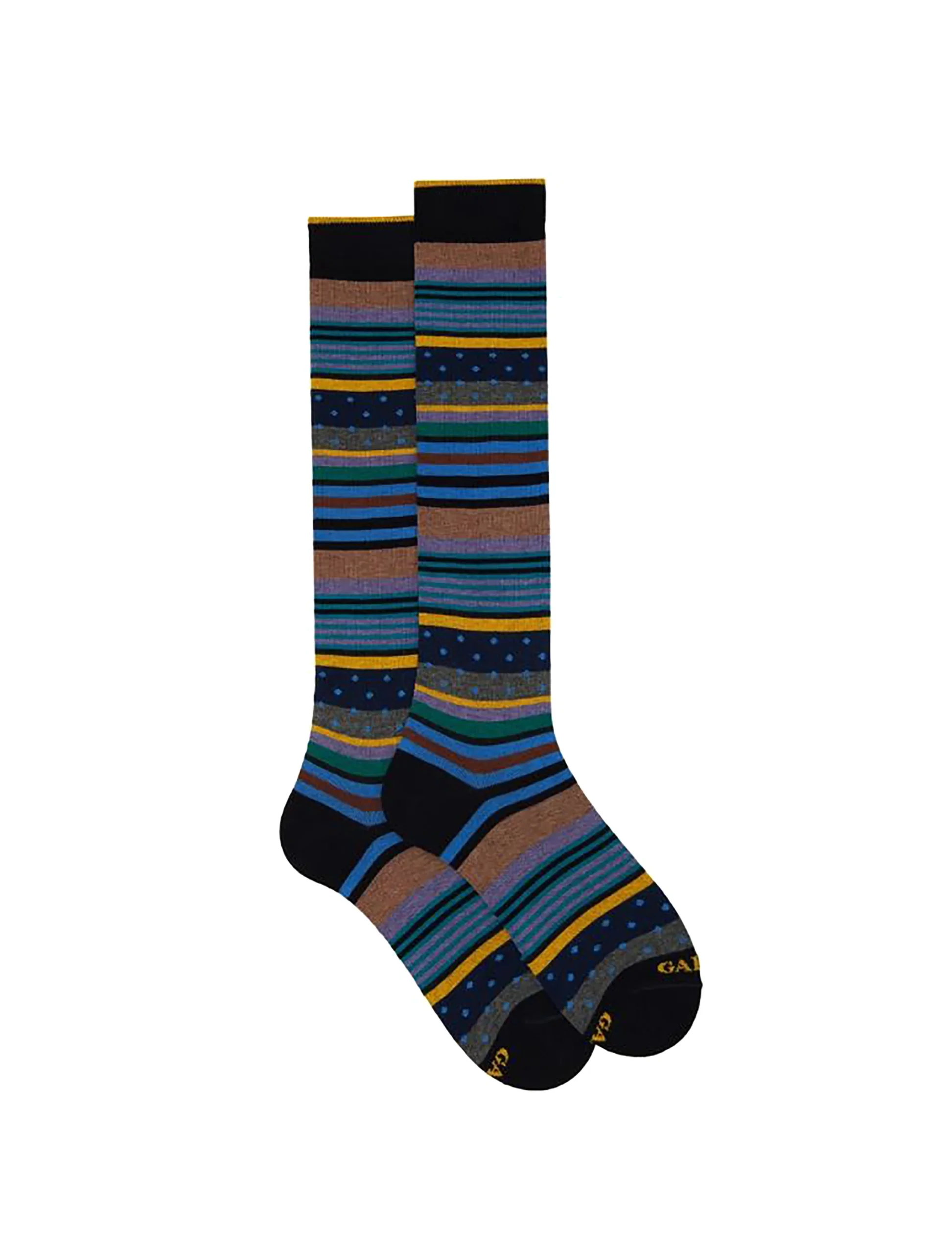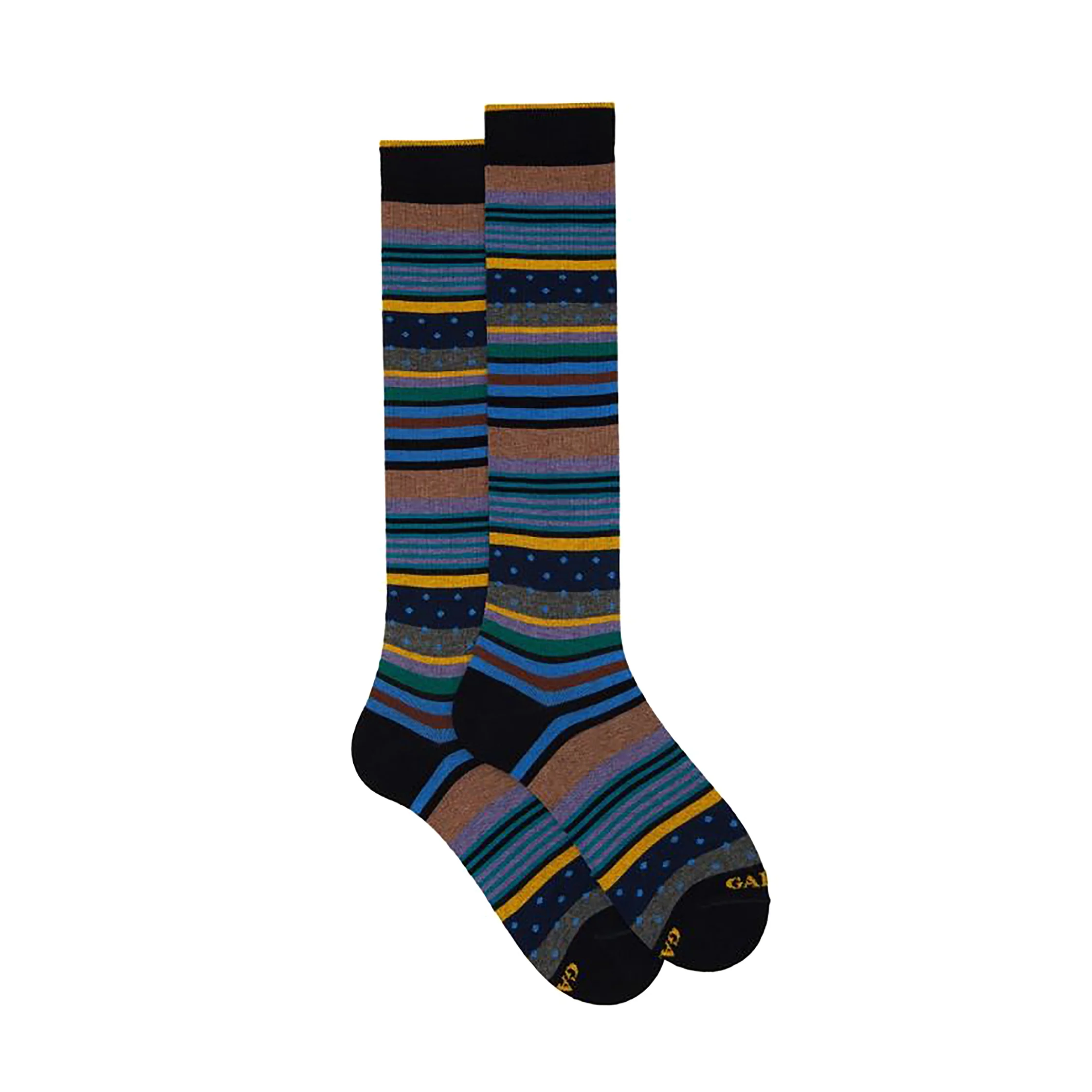 Calza lunga a fantasia mix righe e pois da uomo in cotone del marchio Gallo. Made in Italy. Taglia unica 40/45.