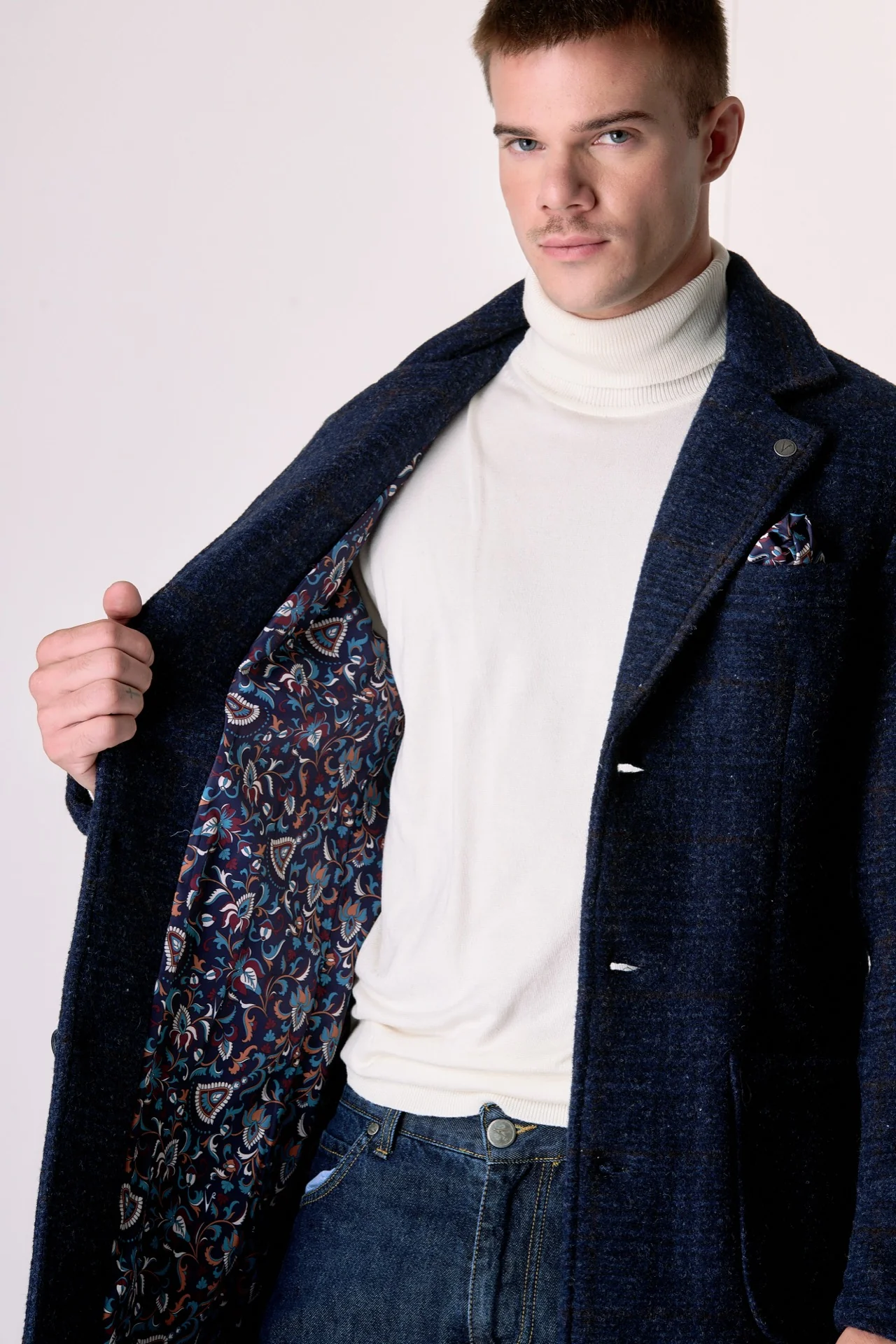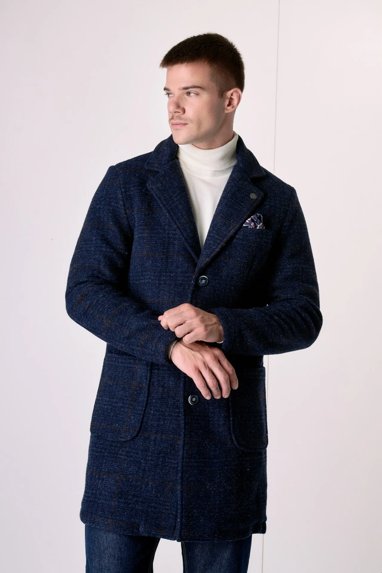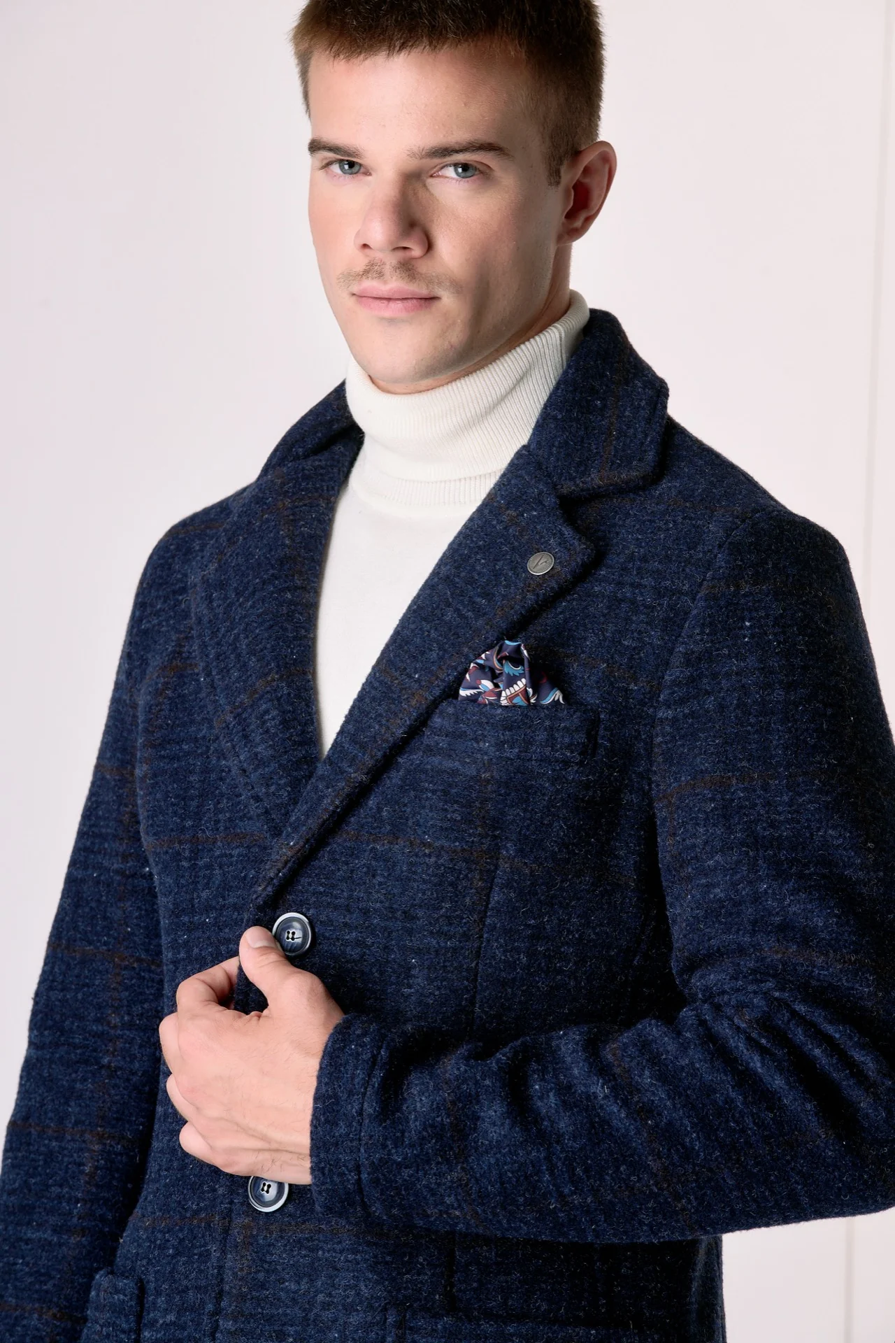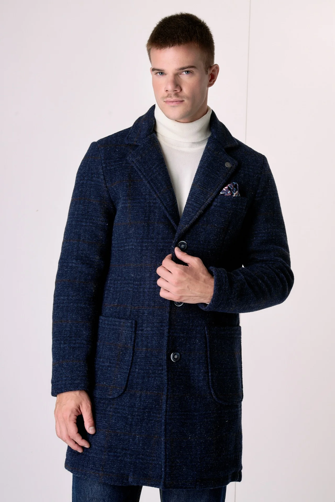 Cappotto Monopetto in lana cotta Principe di Galles Blu con fodera interna e pochette in tessuto V2