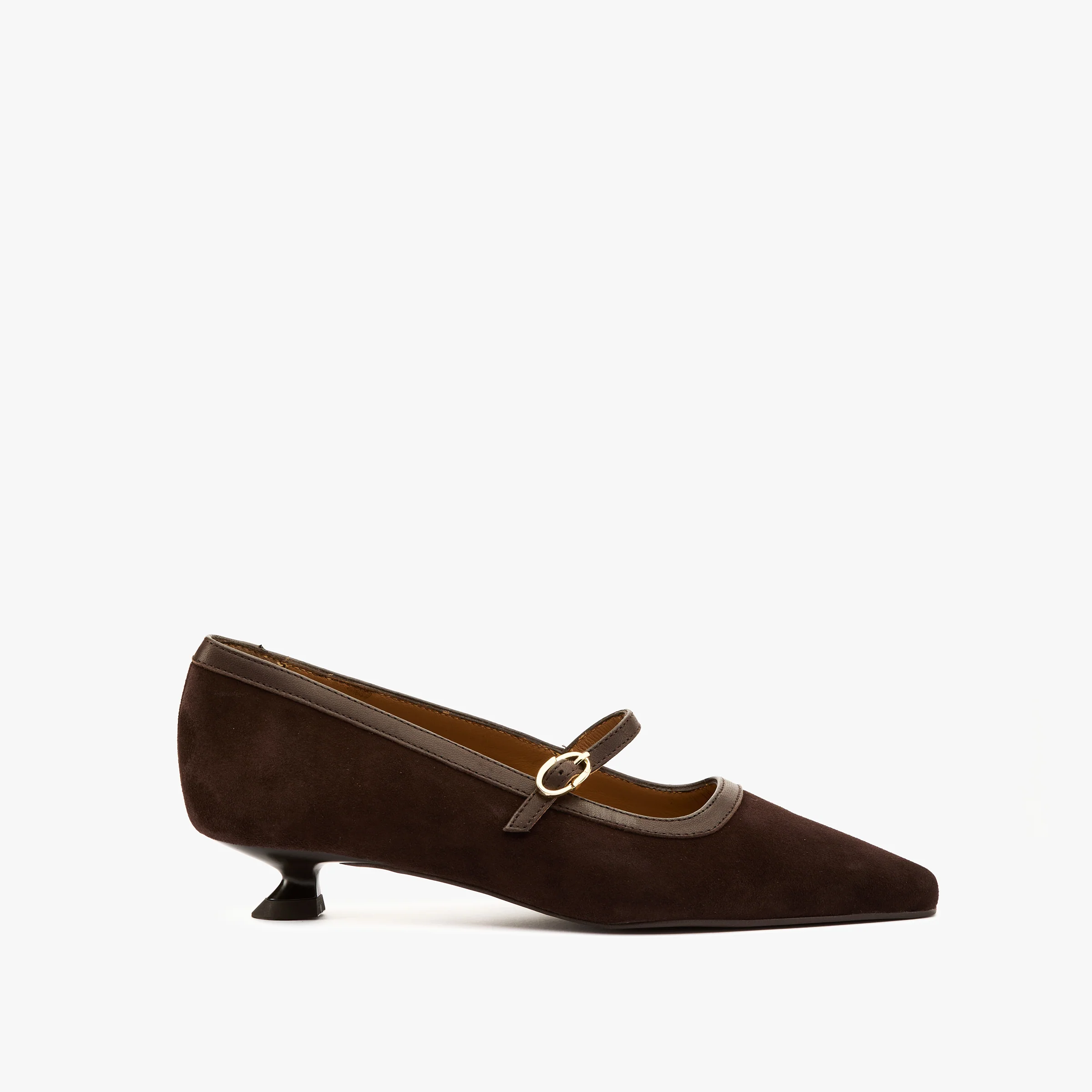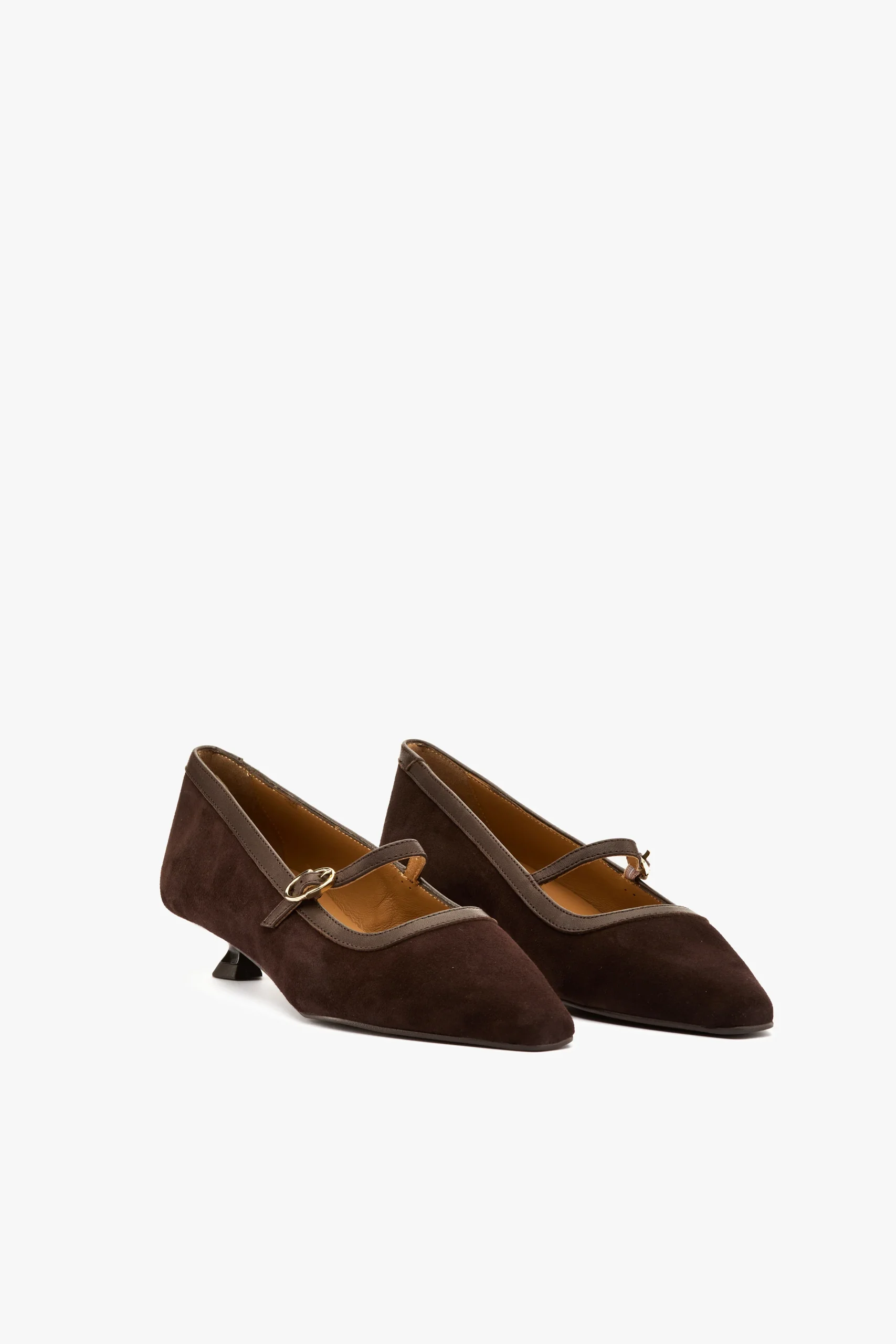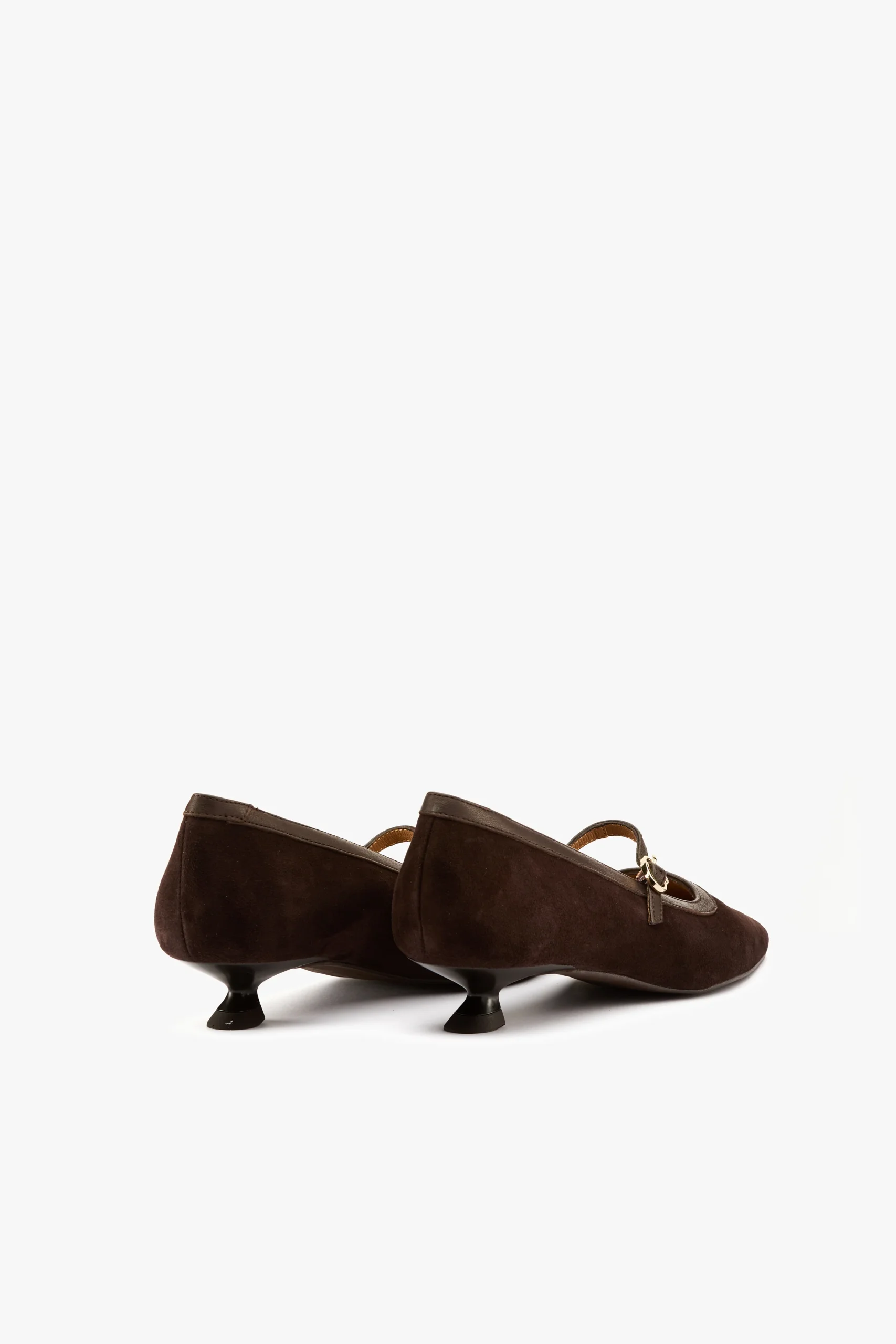 Décolleté in camoscio testa moro con dettagli in pelle e cinturino Sottopiede e fodera in pelle, suola in gomma Altezza tacco 3 cm Calzata regolare