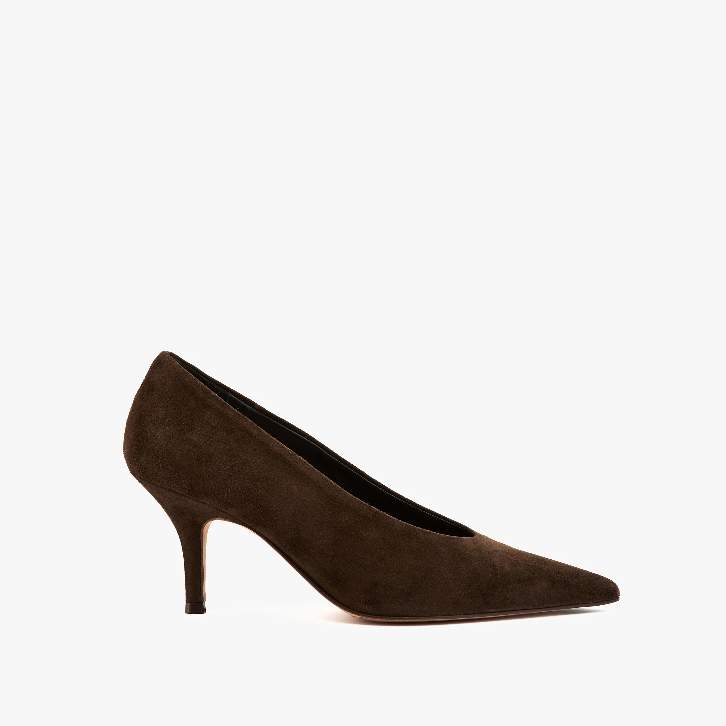 Décolleté in camoscio testa moro Sottopiede e fodera in pelle, suola in cuoio Altezza tacco 7.5 cm Made in Italy Calzata regolare