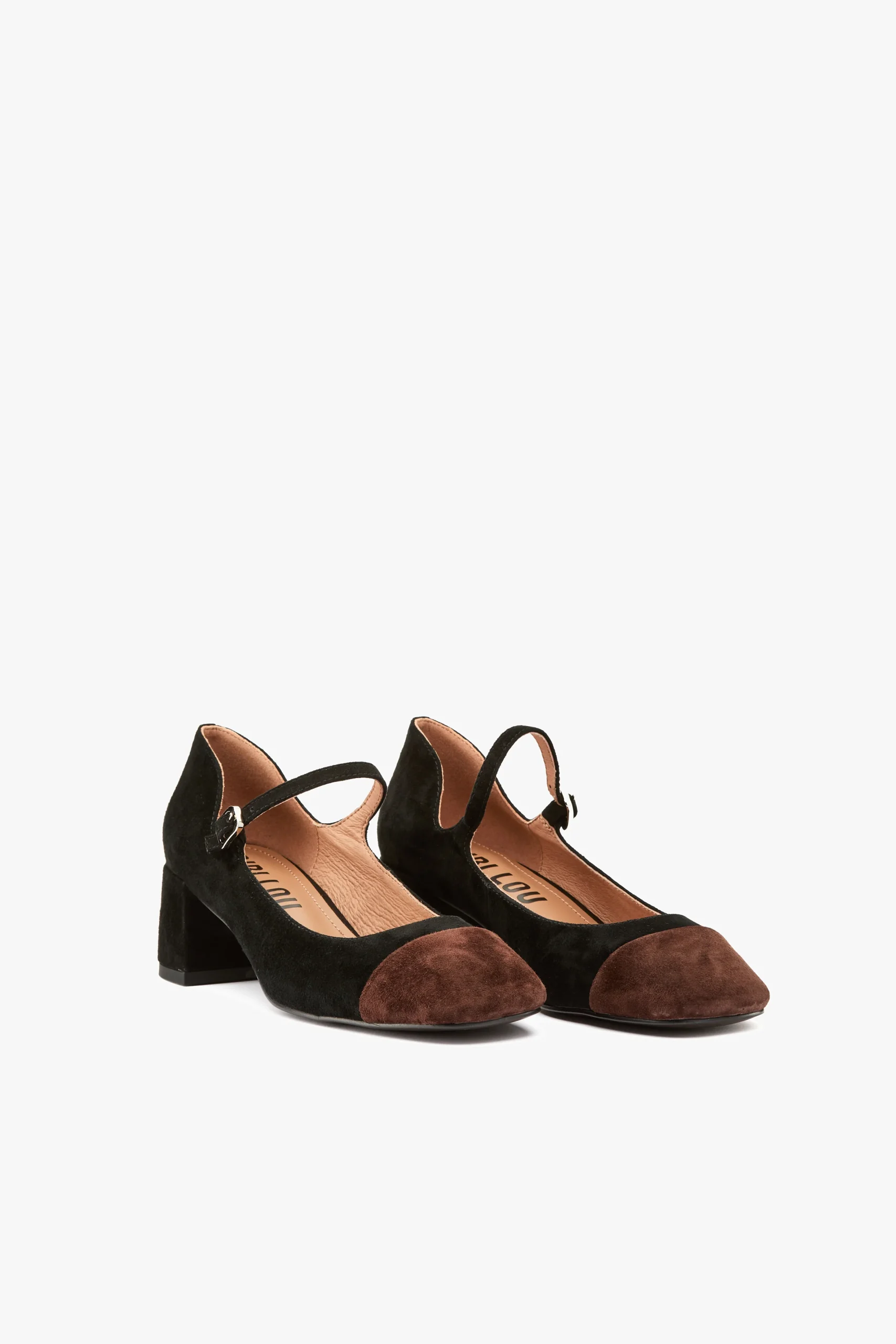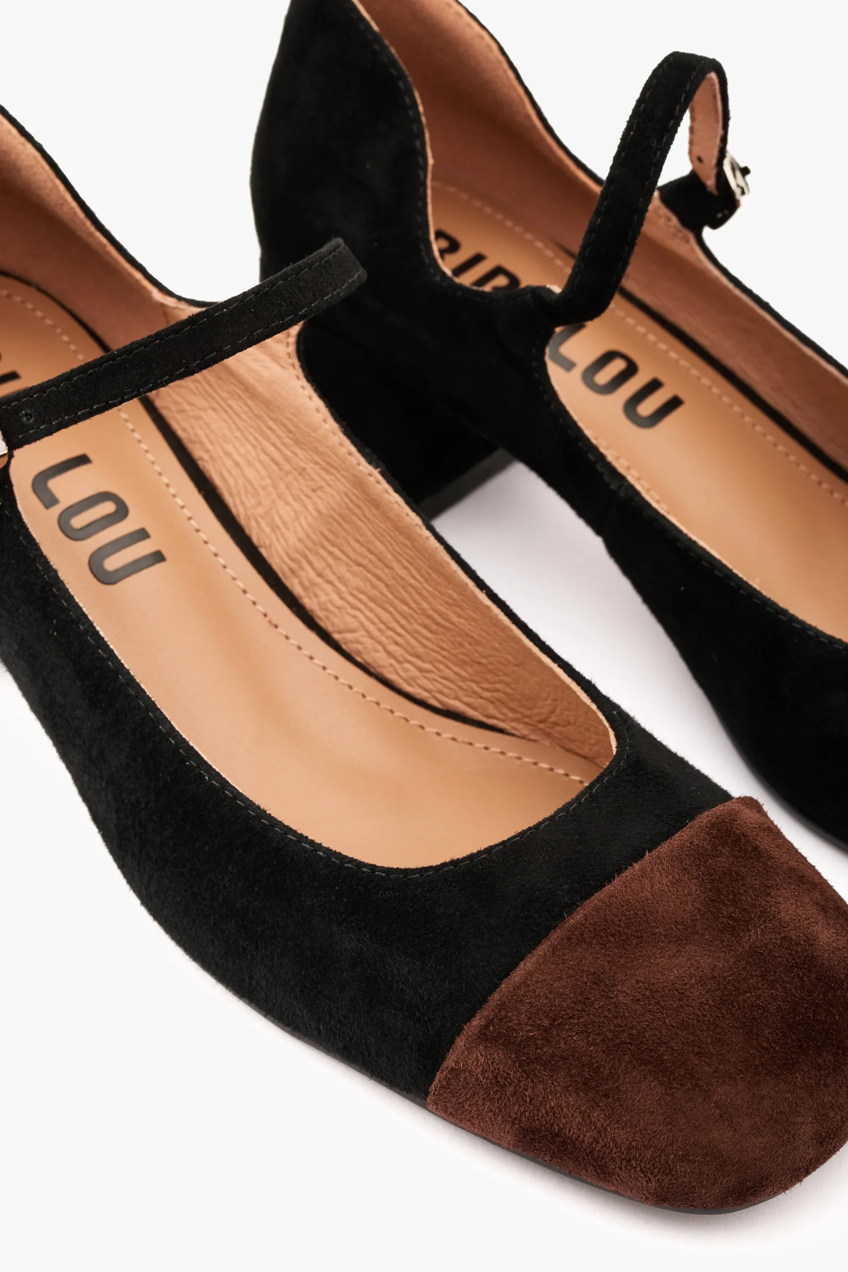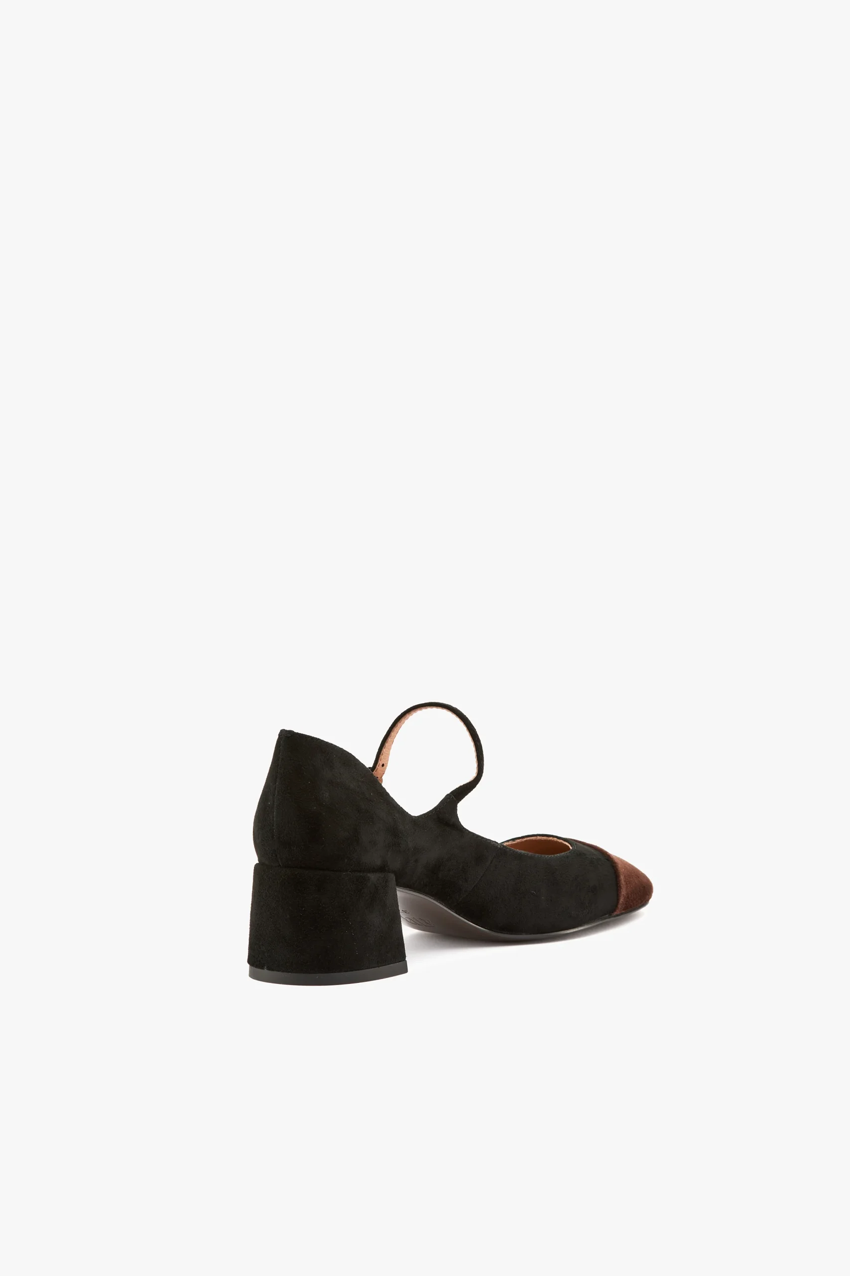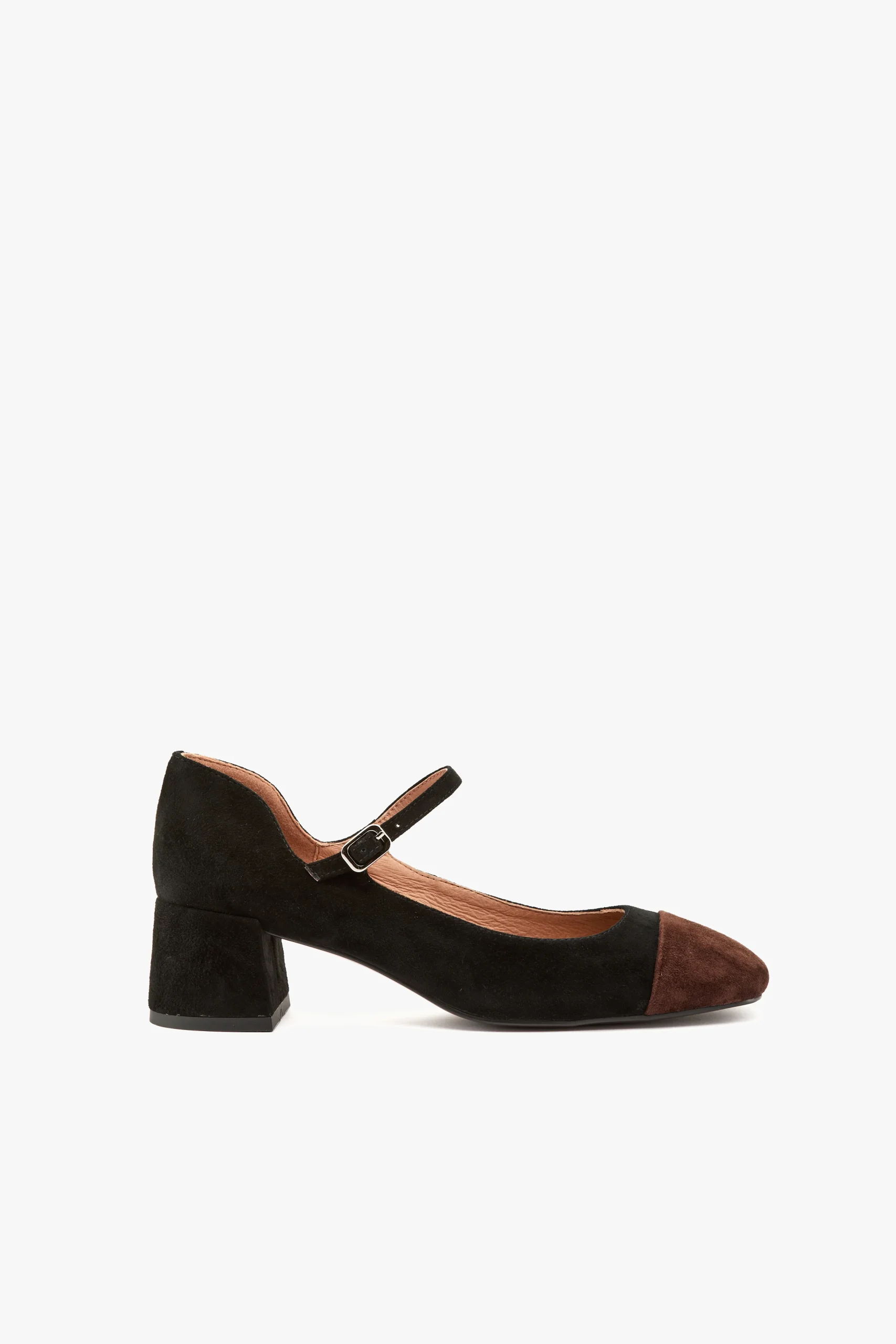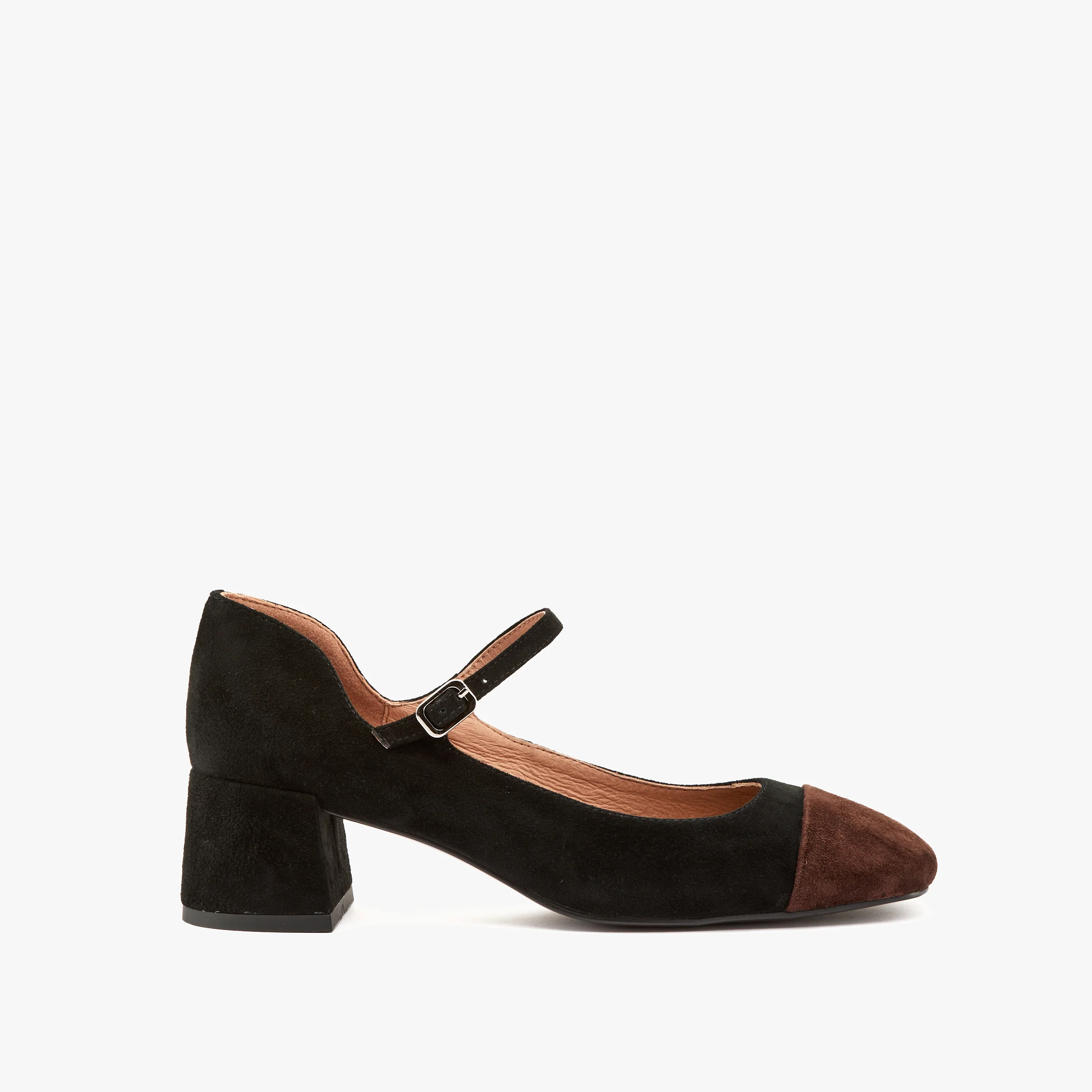 Décolleté in camoscio nero con punta a contrasto testa moro cinturino