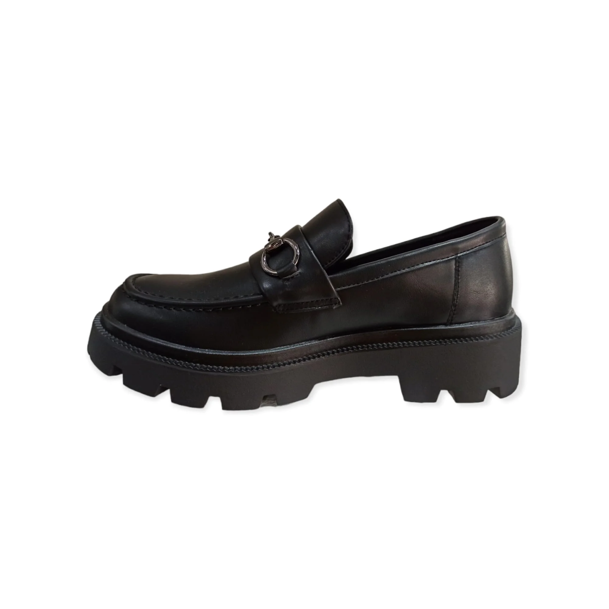 Mocassino da donna in materiale sintetico effetto pelle con punta tonda, morsetto metallico applicato sulla parte frontale. Suola alta a carrarmato in gomma sintetica. Altezza suola 5 cm