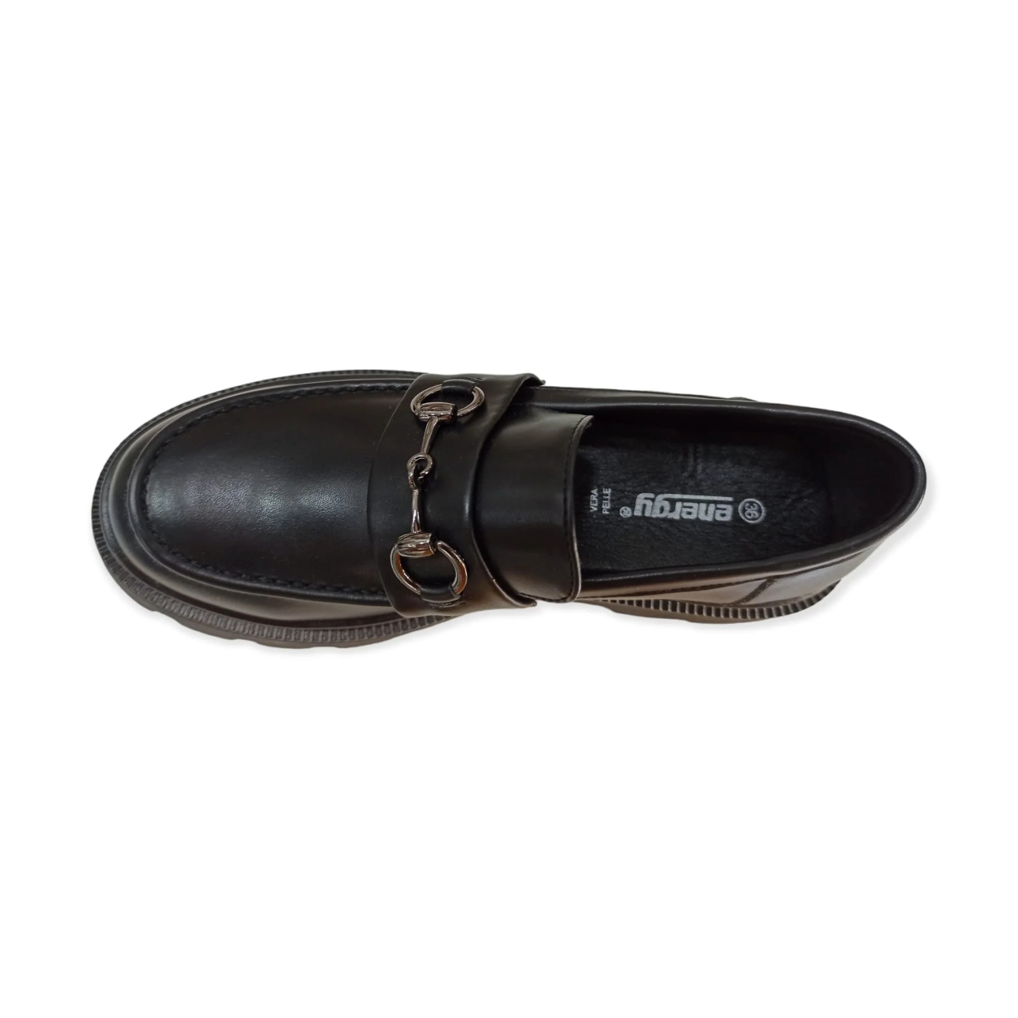 MOCASSINO DONNA ENERGY I442 Mocassino da donna in materiale sintetico effetto pelle con punta tonda, morsetto metallico applicato sulla parte frontale. Suola alta a carrarmato in gomma sintetica. Altezza suola 5 cm
