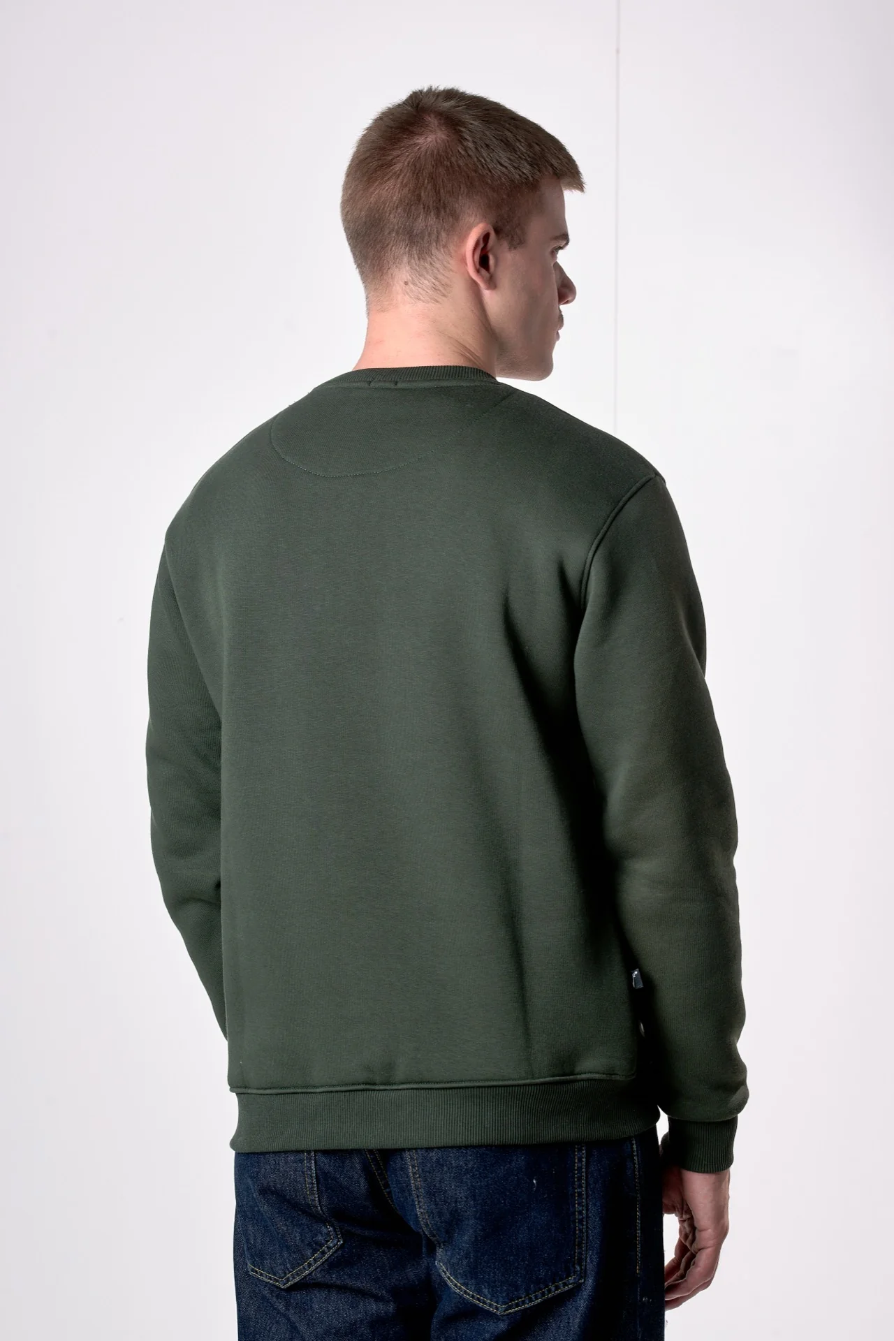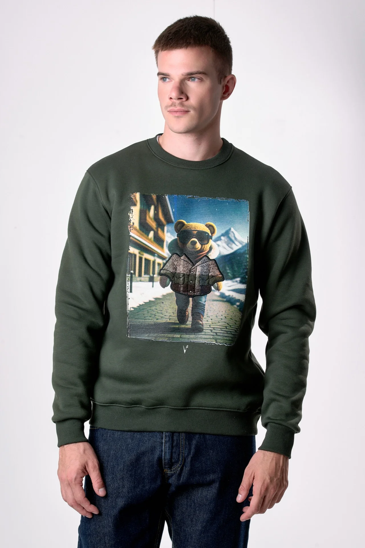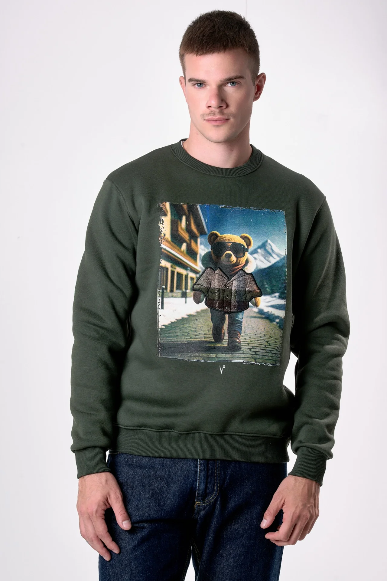 Felpa Girocollo Verde Militare con stampa Teddy e ricamo in tessuto V2