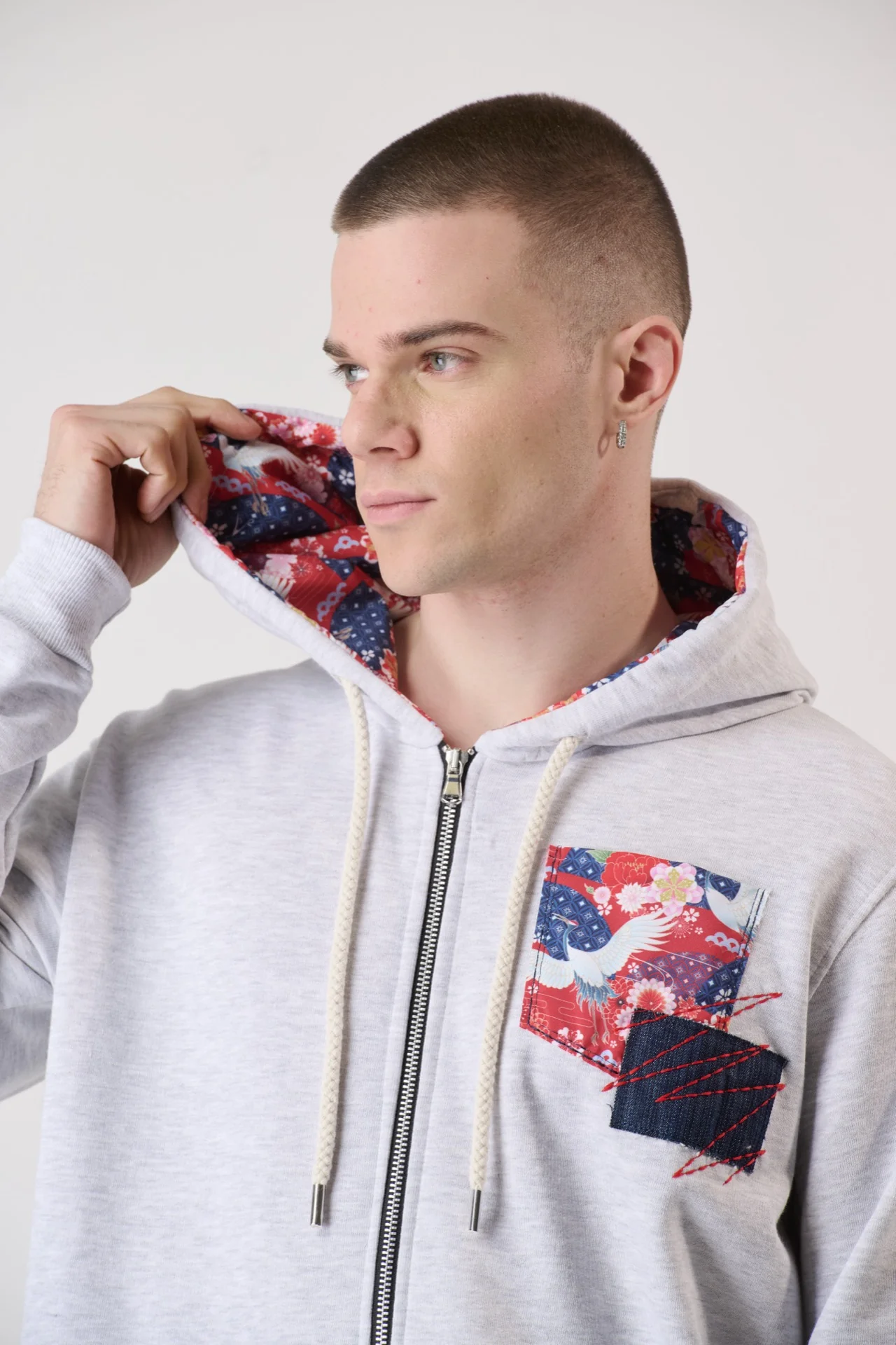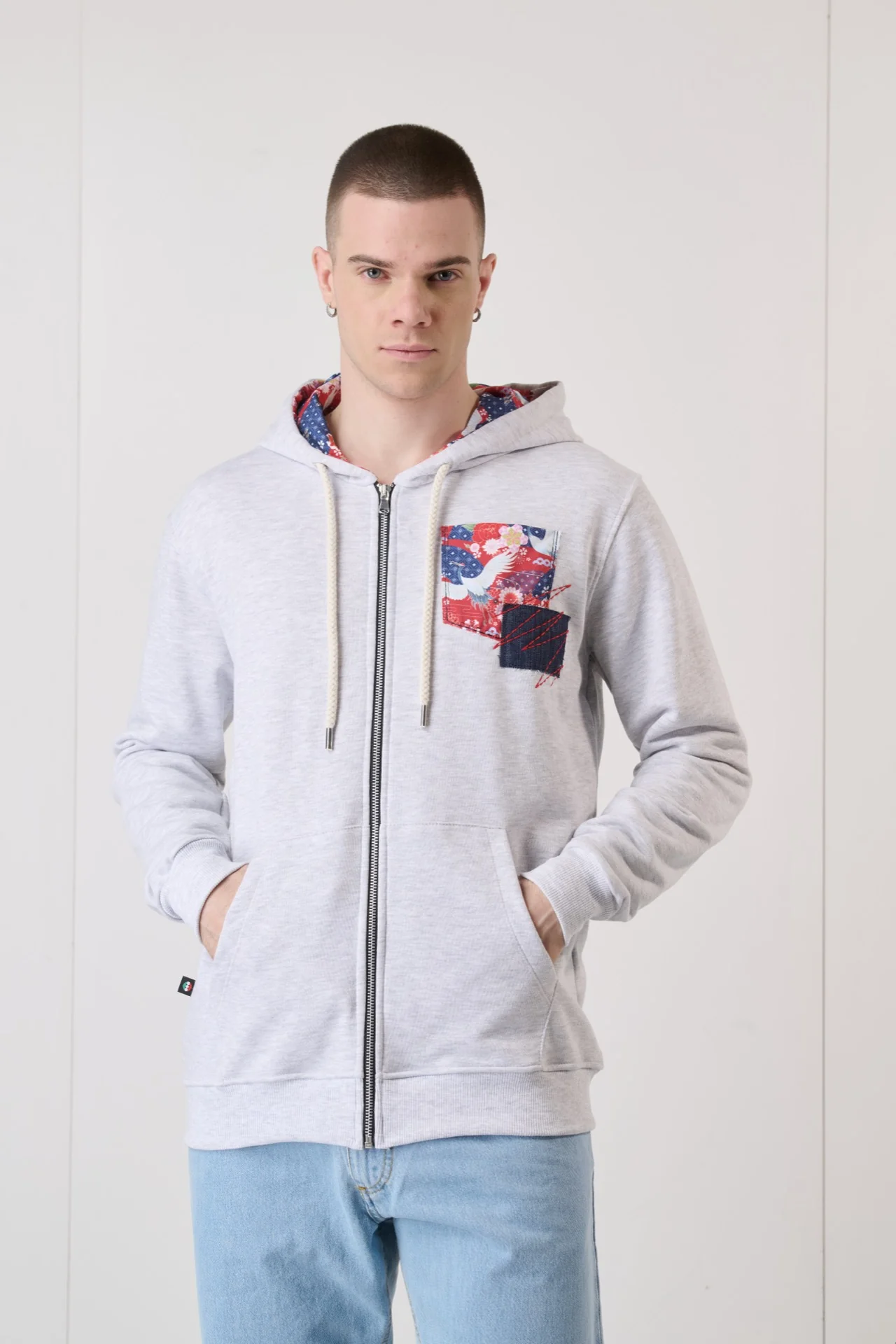 Felpa Zip Grigia con Taschino Patch e interno cappuccio in tessuto V2