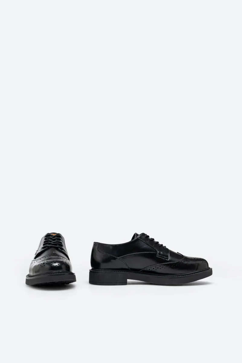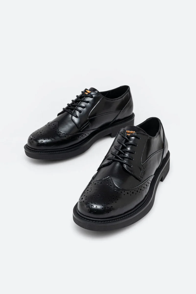 Questa scarpa รจ una derby stringata da donna in pelle sintetica spazzolata con lavorazione brogue sulla tomaia e suola bold in gomma. Lโaspetto lucido e i dettagli a coda di rondine (brogue) le conferiscono uno stile anglosassone, elegante ma con attitudine contemporanea e urban.