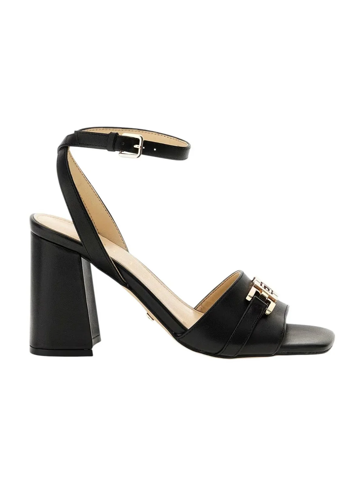 GUESS SANDALI TACCO DONNA FLJGRT NERO Sandalo con cinturino regolabile, fascia davanti, logo al centro dorato, tacco alto 8,5 cm