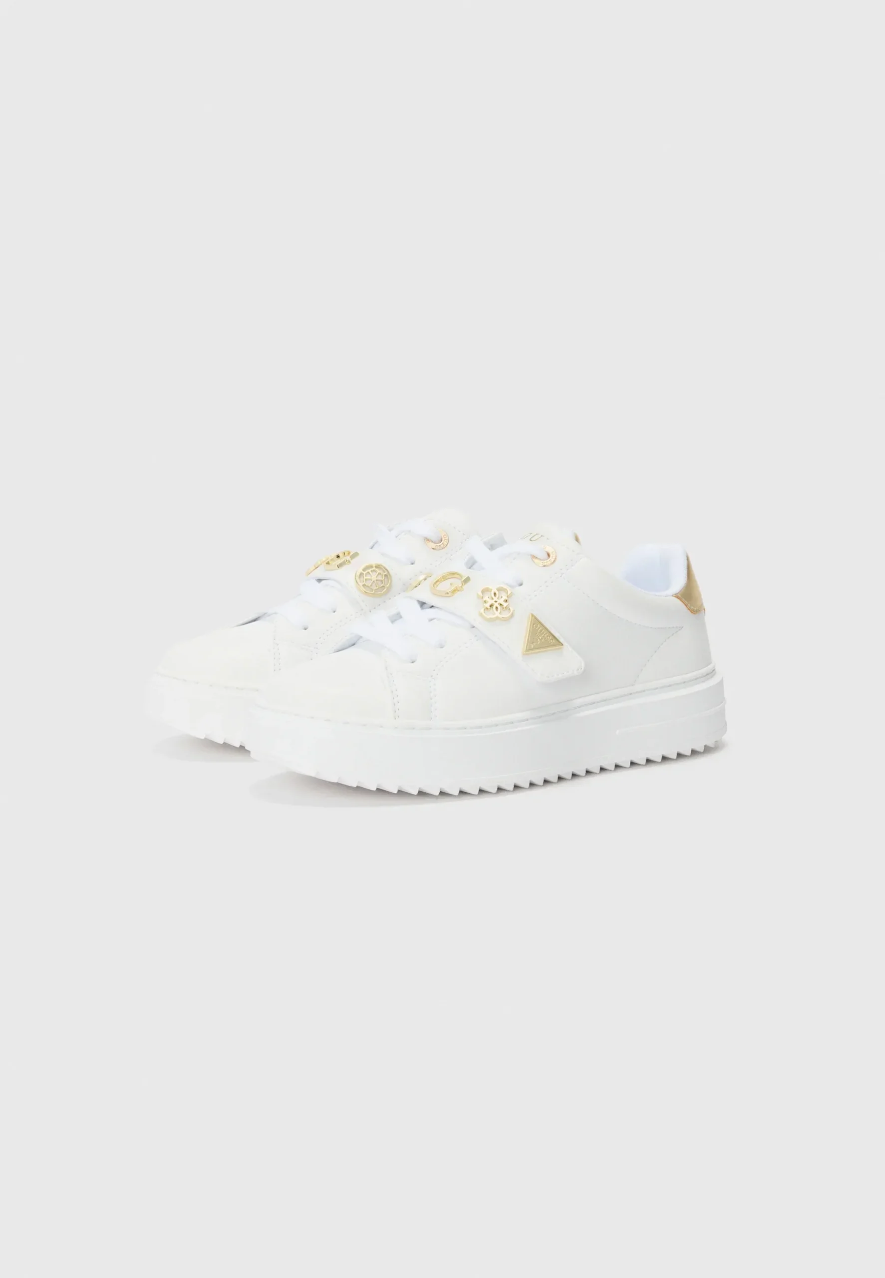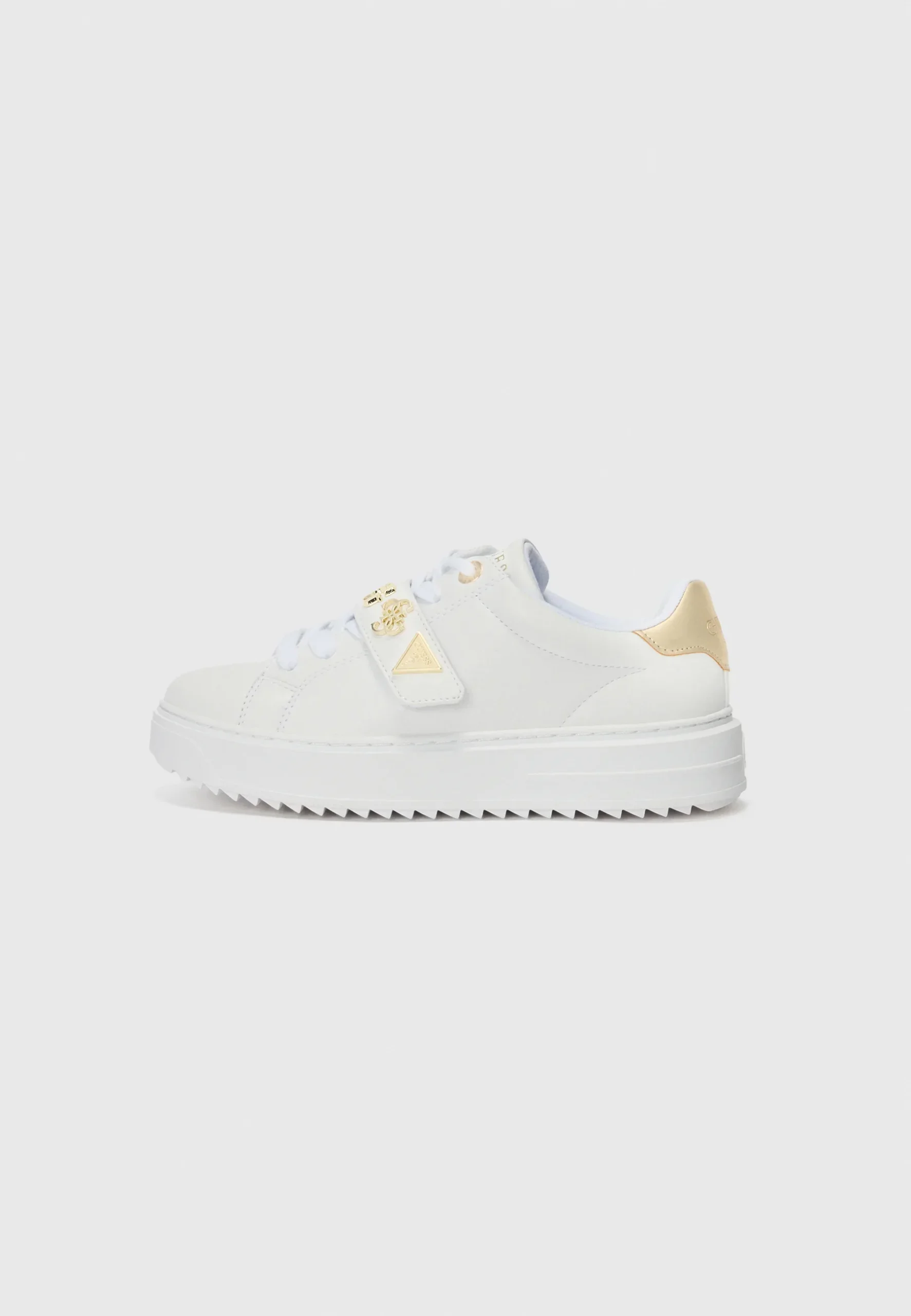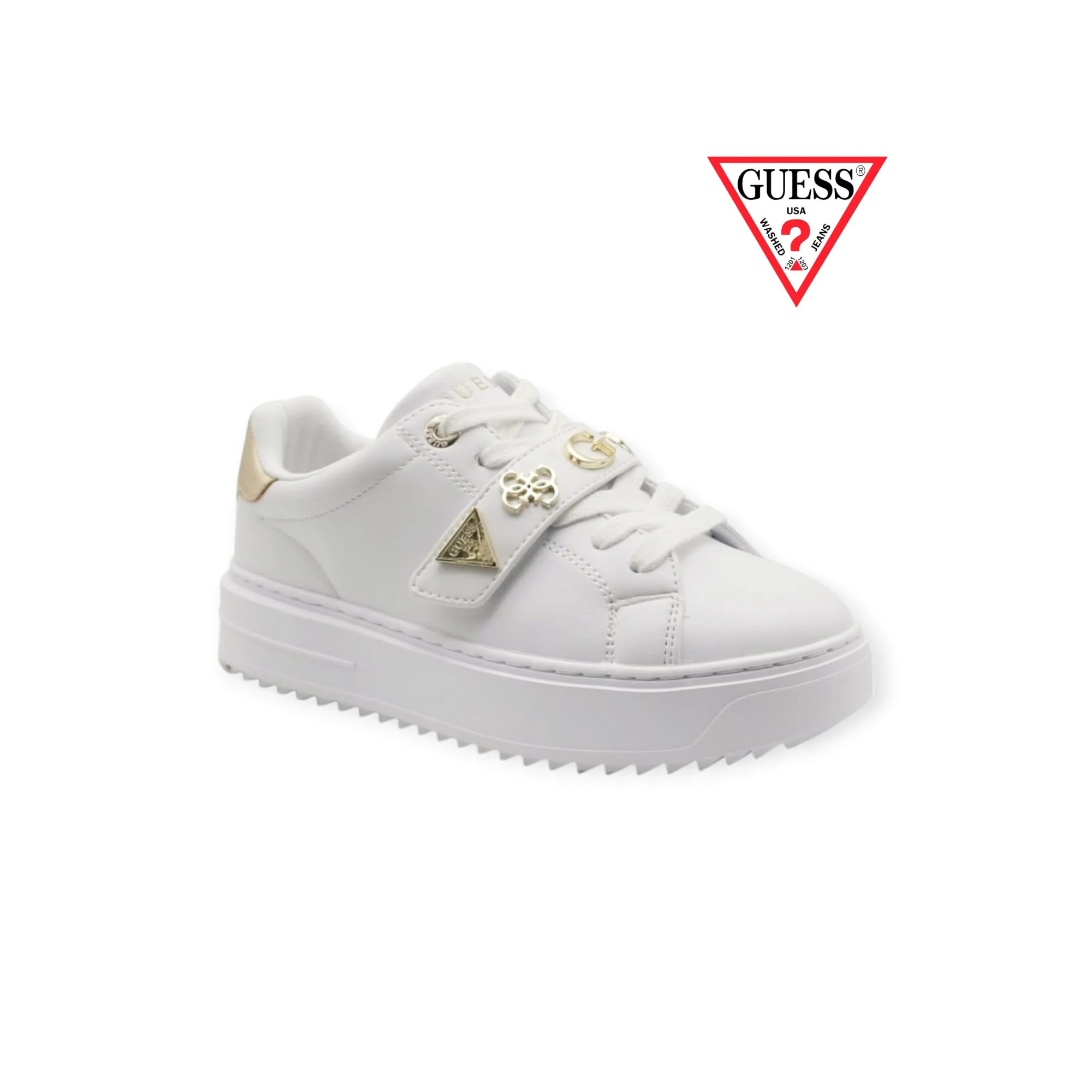 Bellissima sneakers Drift di Guess arricchita con dettagli in oro Inserti frontali triangolo e scritta logo e 4G logo.Inserto in vernice sul retro.Scritta logo frontale, sul retro e suola.Composizione tomaia: 100% Poliuretano.Sottopiede e fodera interna in cotone.Suola in gomma. Sneaker in simil pelle. Punta tonda. Altezza para 4 cm. Chiusura con stringhe. Code: