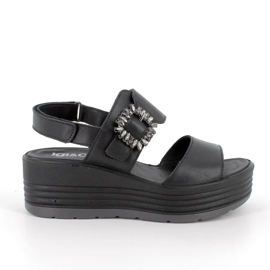 IGI&CO SANDALO CON 2 FASCE DONNA 7667300 NERO Sandalo con zeppa alta 6 cm impreziosito da una fibbia gioiello, realizzato in pelle, chiusura a strappo