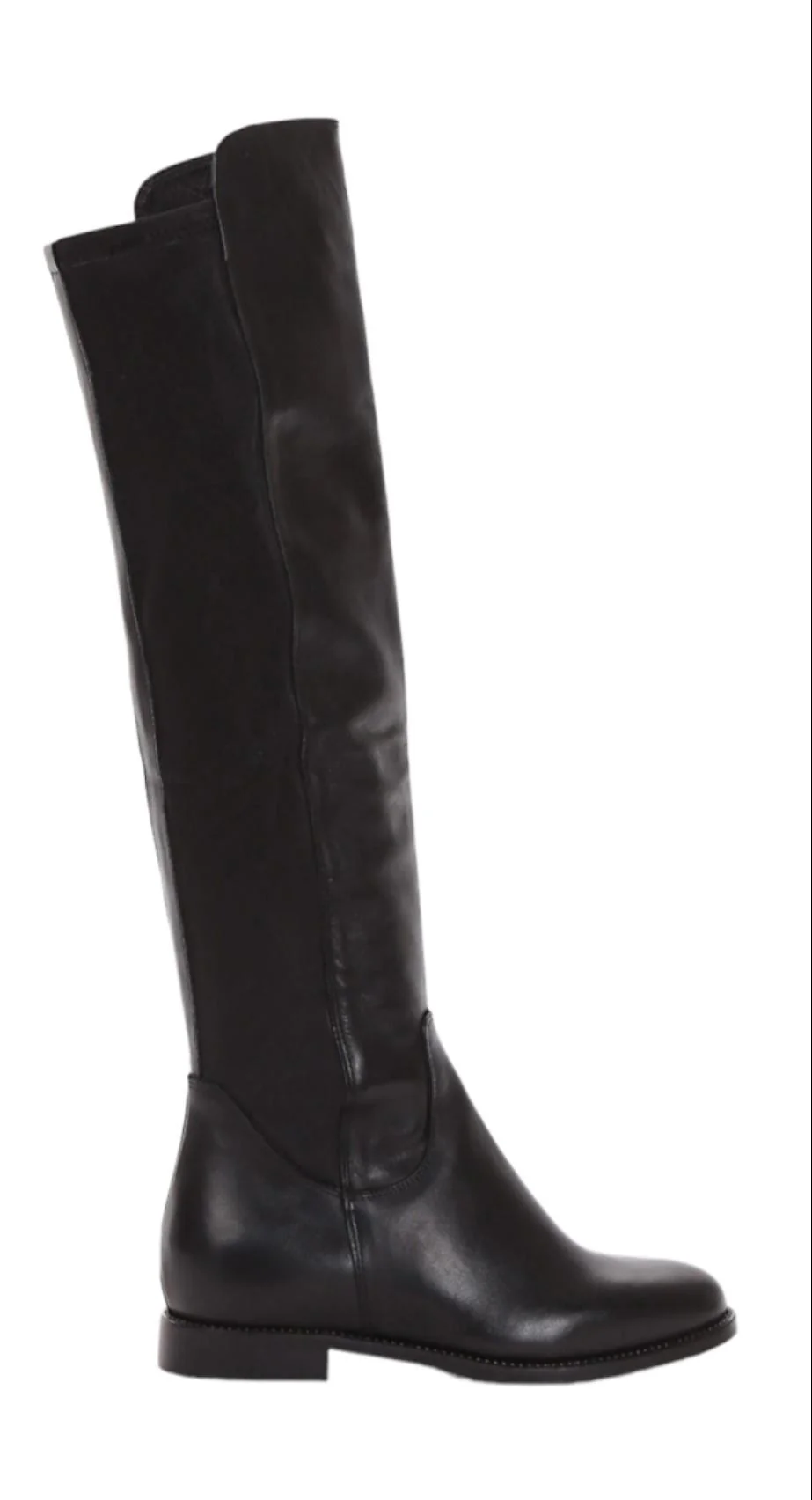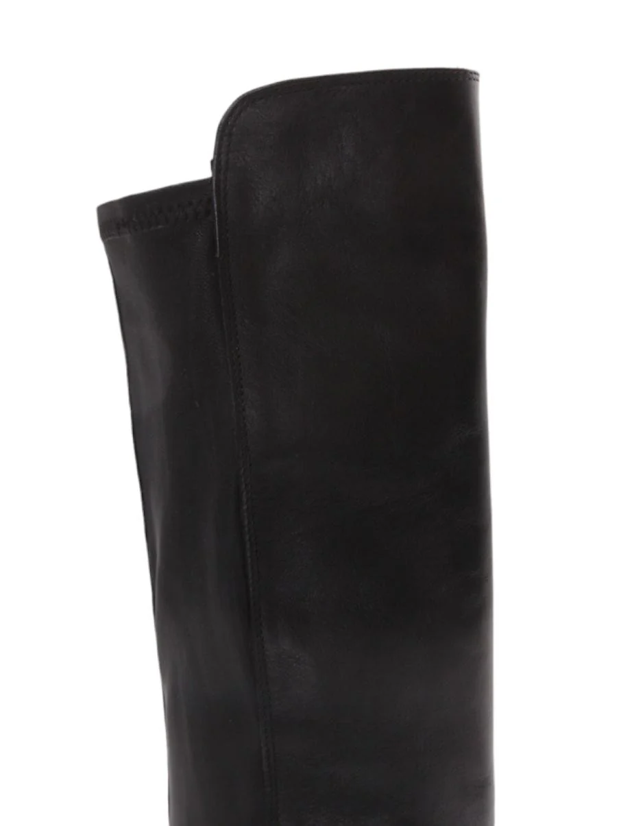 Stivale con tacco alto 3 cm, tomaia in morbidissima pelle nappata, punta arrotondata e fondo abbellito da piccolissime borchie, gambale in pelle elasticizzato alto 53 cm