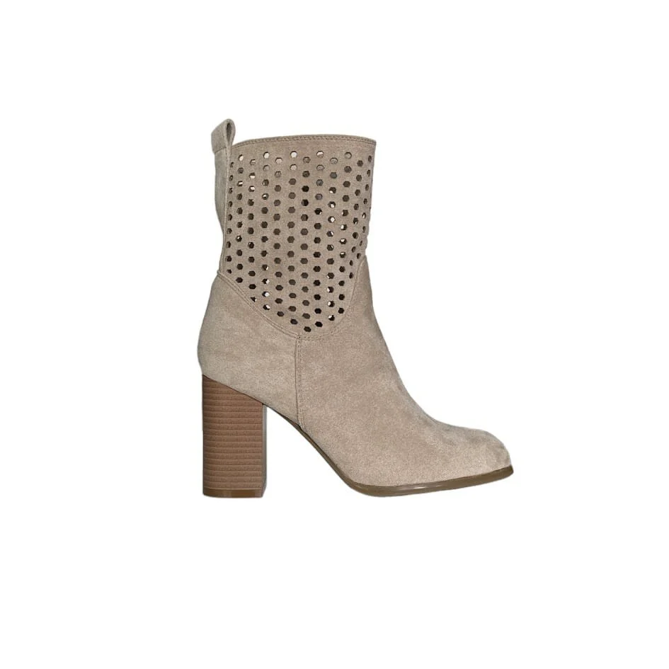 Stivaletti in camoscio con gambale traforato, chiusura con cerniera laterale e tacco largo di 8,5 cm