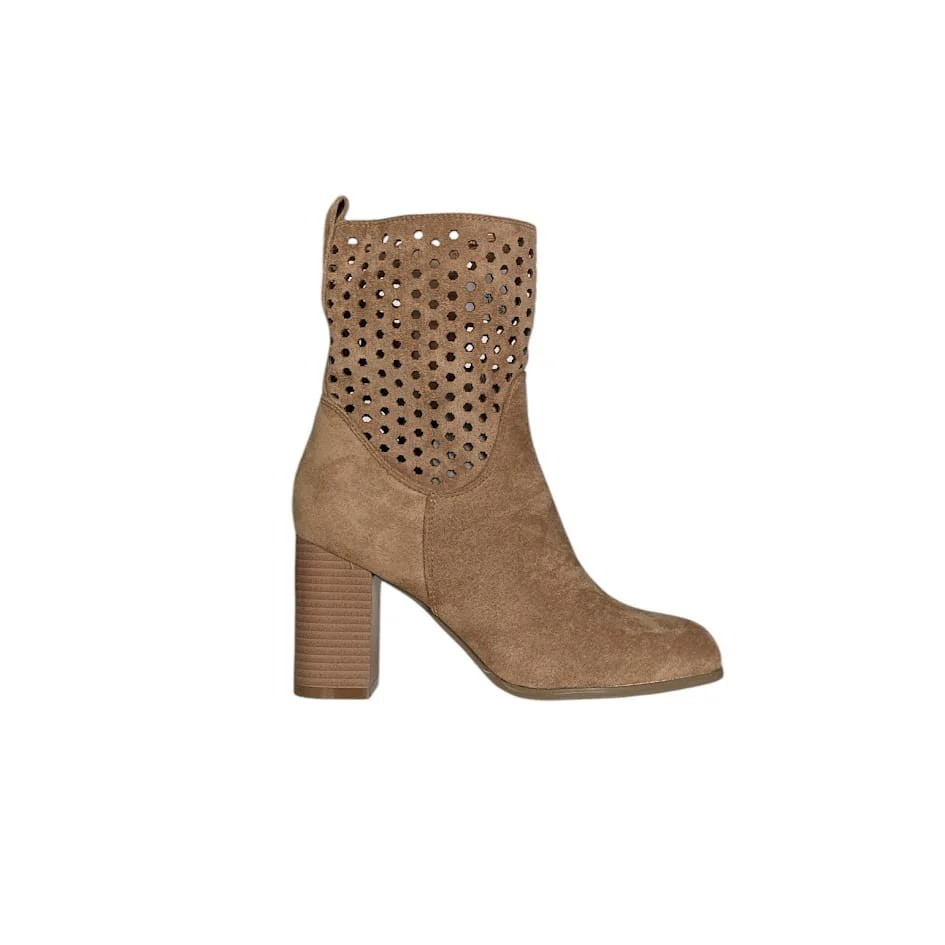 TRONCHETTO IN CAMOSCIO YL203 BEIGE CAMEL Stivaletti in camoscio con gambale traforato, chiusura con cerniera laterale e tacco largo di 8,5 cm