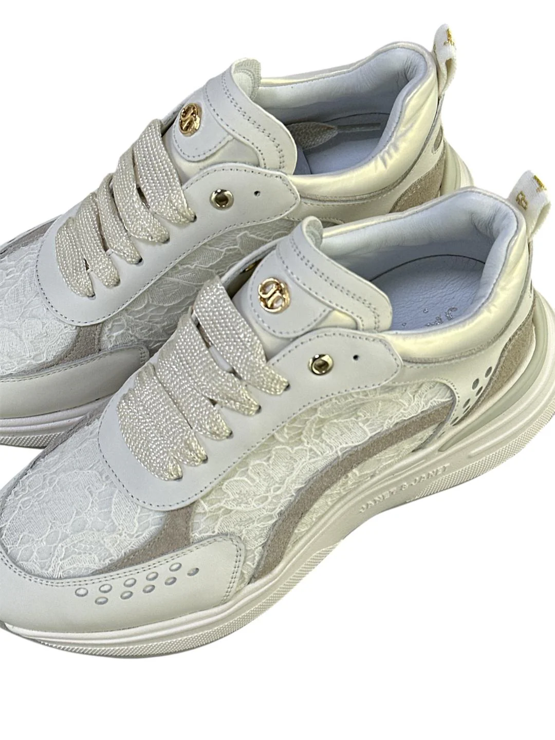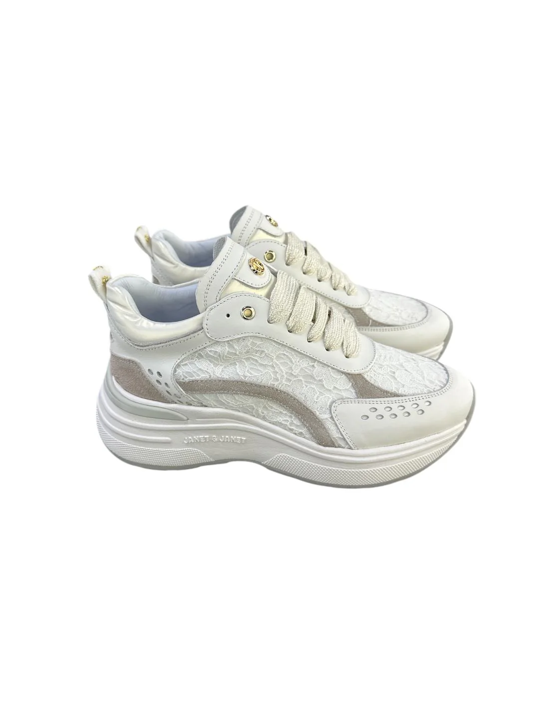 Janet & Janet sneakers in morbida pelle con inserti in pizzo ricamati e scritta logo sul tallone. Sottopiede estraibile rivestito in Memory Foam e suola monoblocco running con battistrada a contrasto di cm 5 realizzata in EVA ultra leggera.