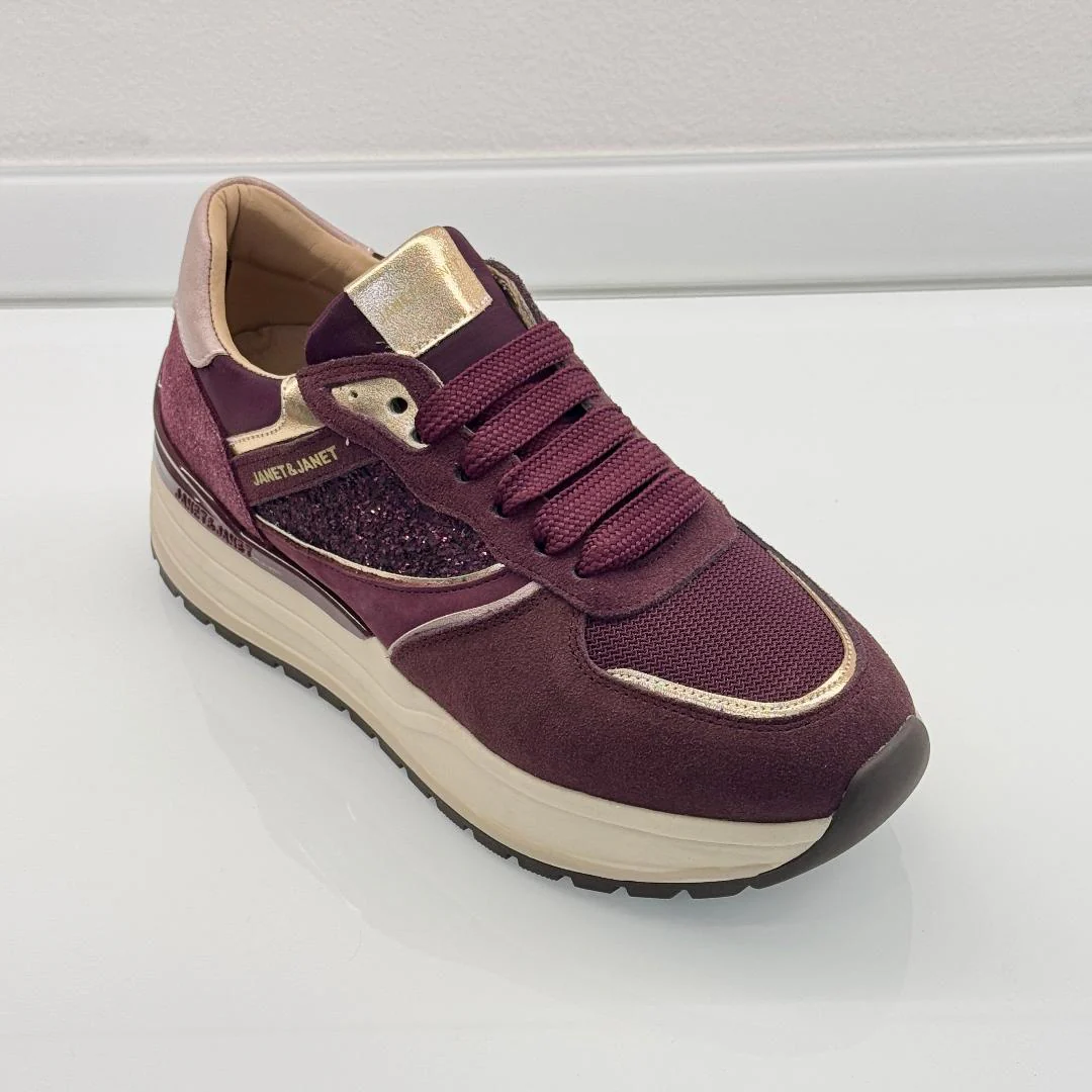 Sneaker Janet & Janet in camoscio bordeaux con dettagli glitter e inserti dorati, elegante e grintosa.