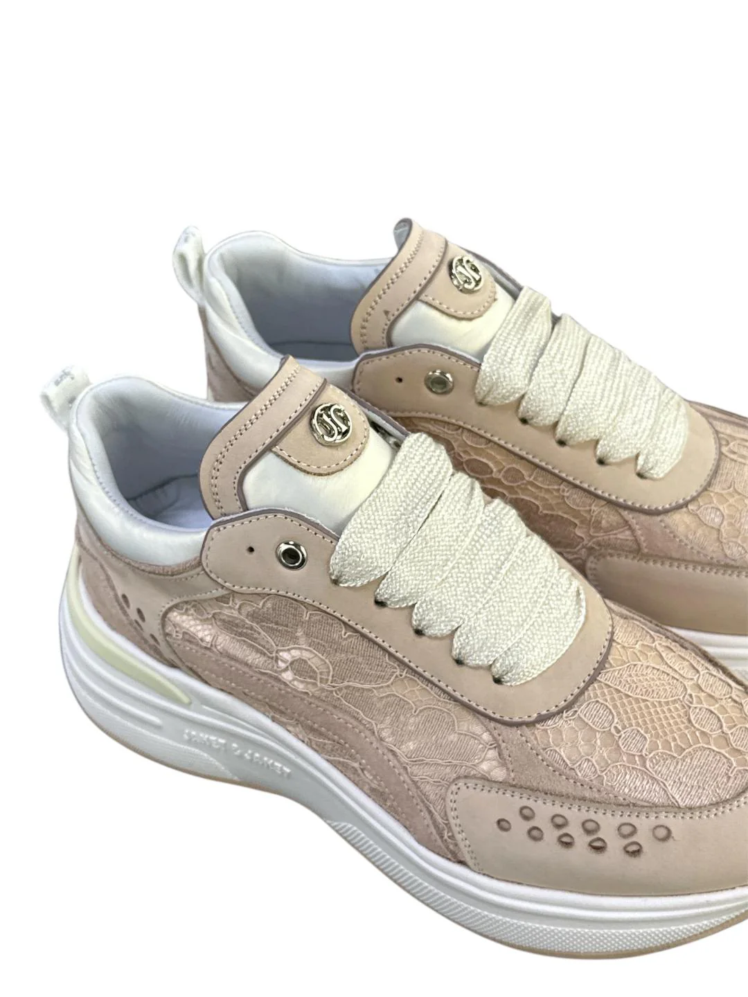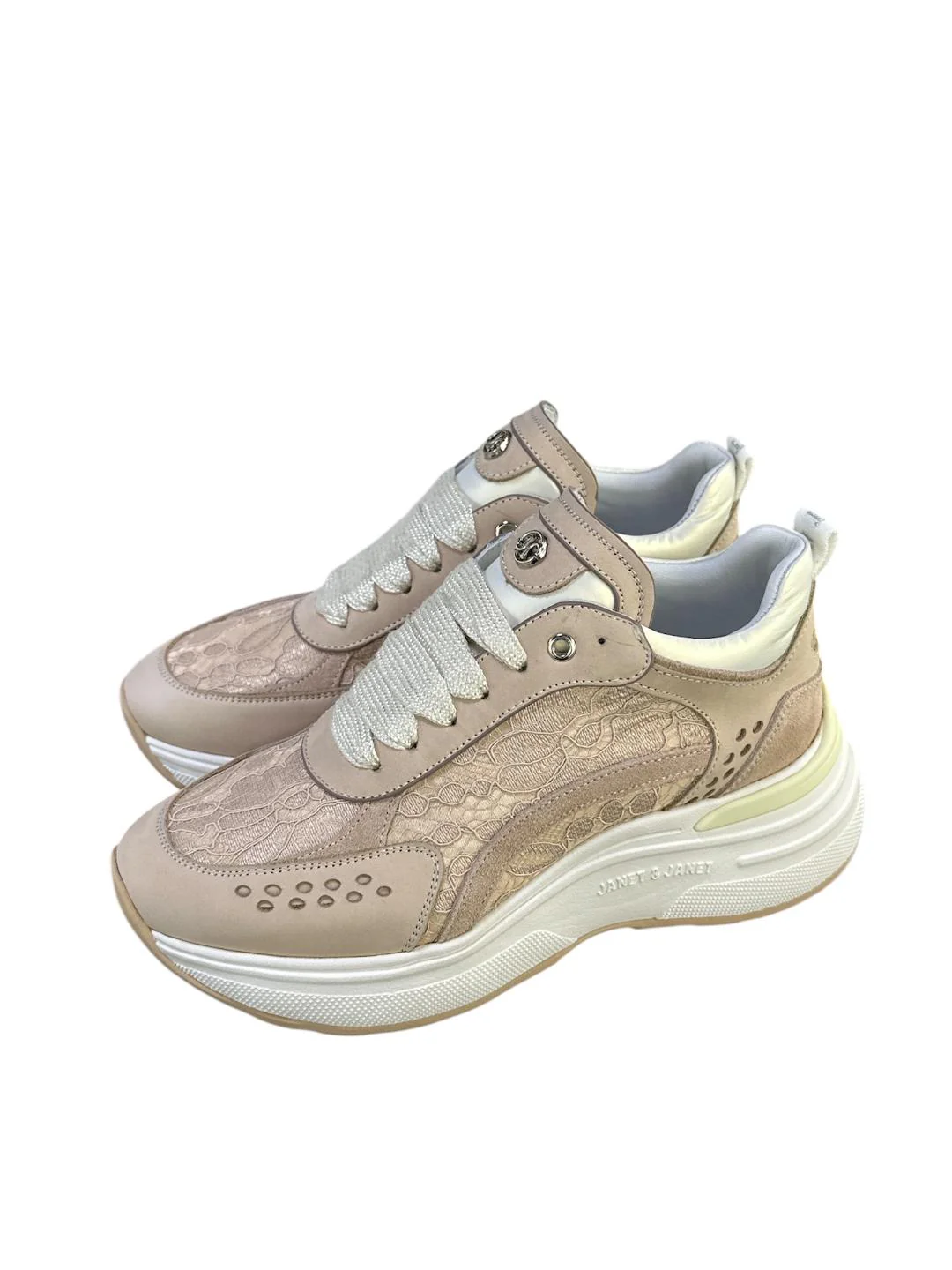 Janet & Janet sneakers in morbida pelle con inserti in pizzo ricamati e scritta logo sul tallone. Sottopiede estraibile rivestito in Memory Foam e suola monoblocco running con battistrada a contrasto di cm 5 realizzata in EVA ultra leggera.