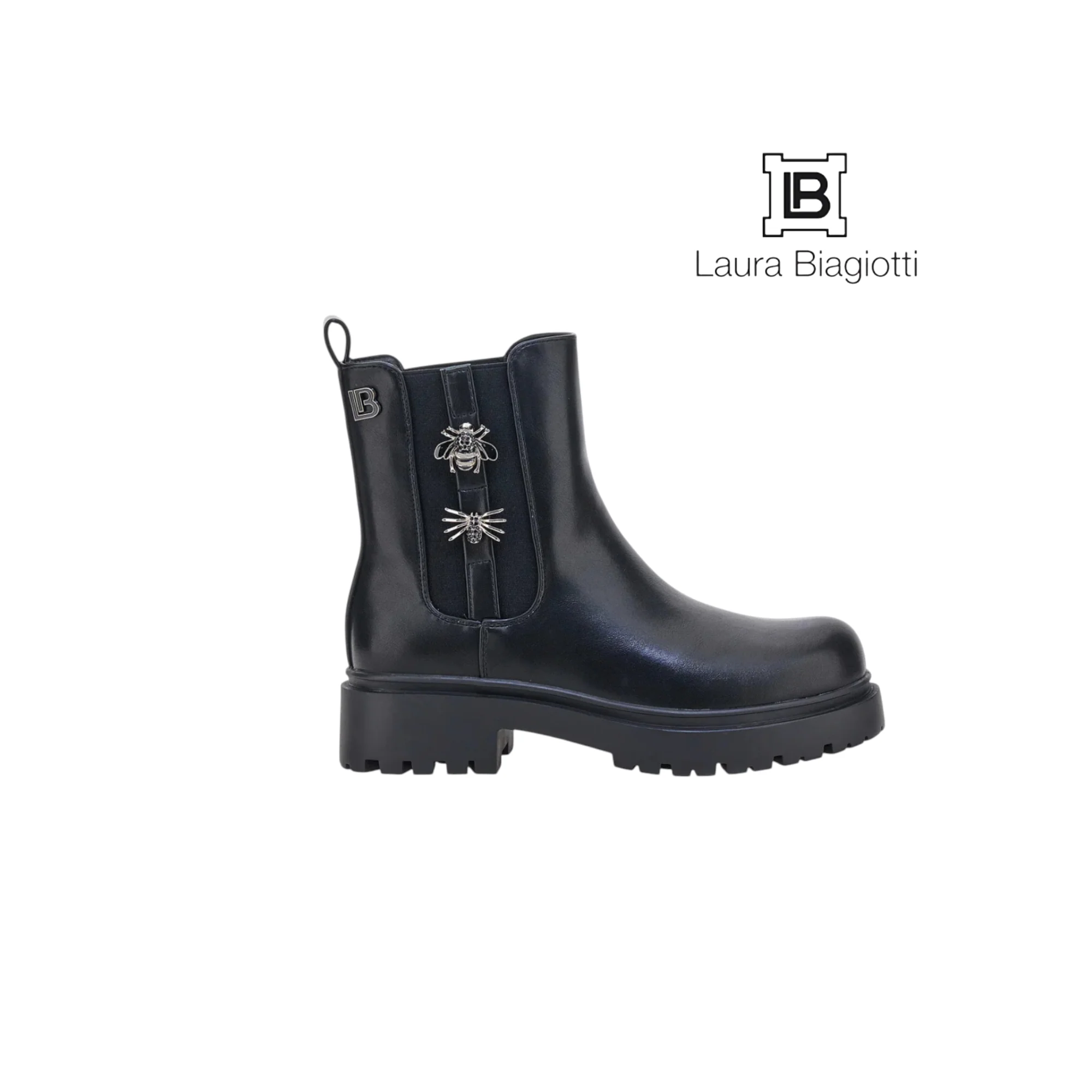 I beatles Laura Biagiotti aggiungono un tocco originale al tuo stile con dettagli gioiello a forma di insetto applicati sullโelastico laterale. La tomaia nera liscia si abbina a una suola carrarmato per un look grintoso e contemporaneo. Facili da indossare e perfetti per distinguersi ogni giorno.