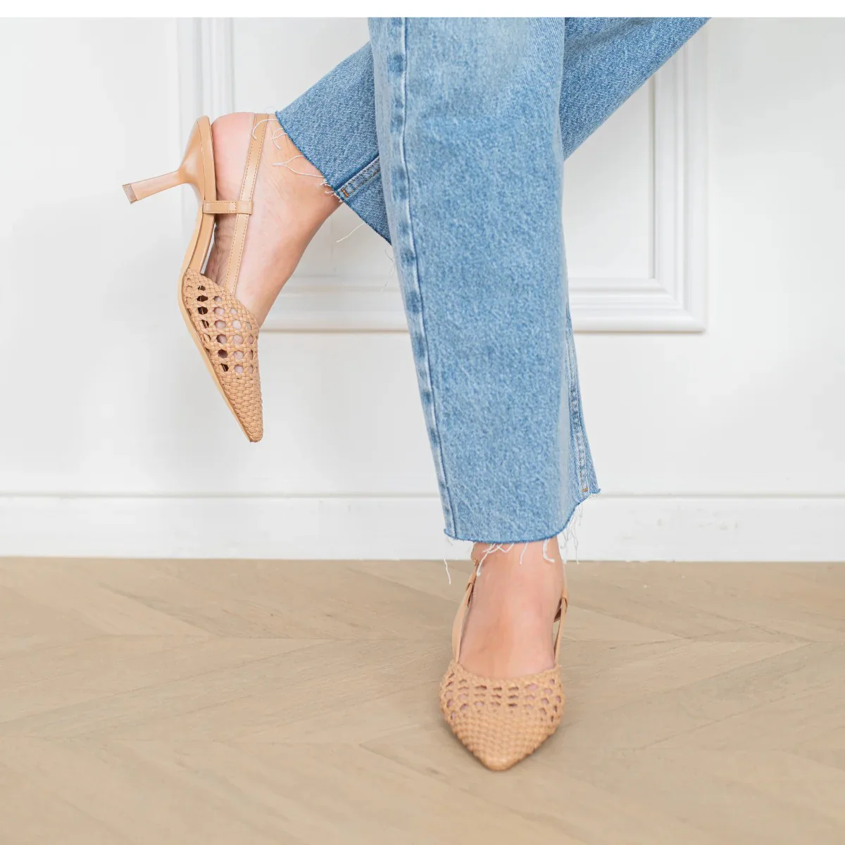 Chanel intrecciata “effetto vimini”, sottopiede in morbida pelle, cinturino alla caviglia regolabile, tacco alto 7 cm