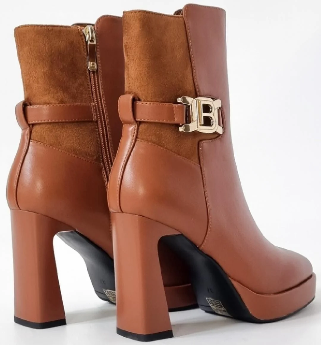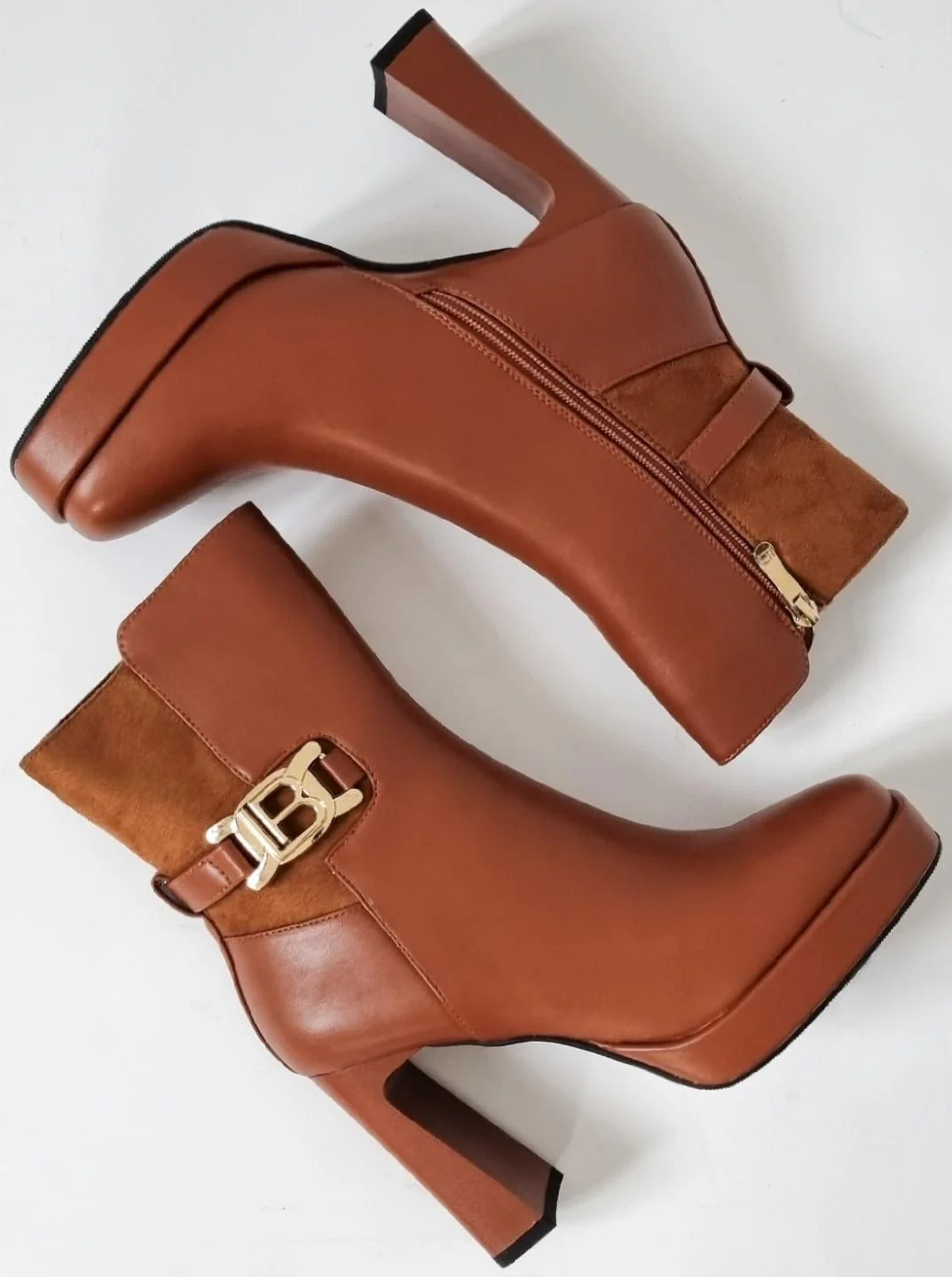 Tronchetto con tacco e plateaux, modello al polpaccio, chiusura con cerniera laterale, tomaia in similpelle, soletta in tessuto, marchio LAURA BIAGIOTTI laterale in metallo, suola in gomma antiscivolo, altezza tacco 10 cm e plateau 2 cm, inserto posteriore in similcamoscio