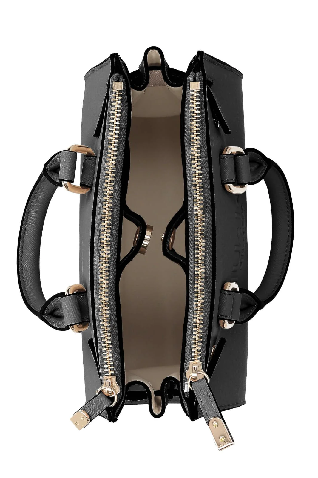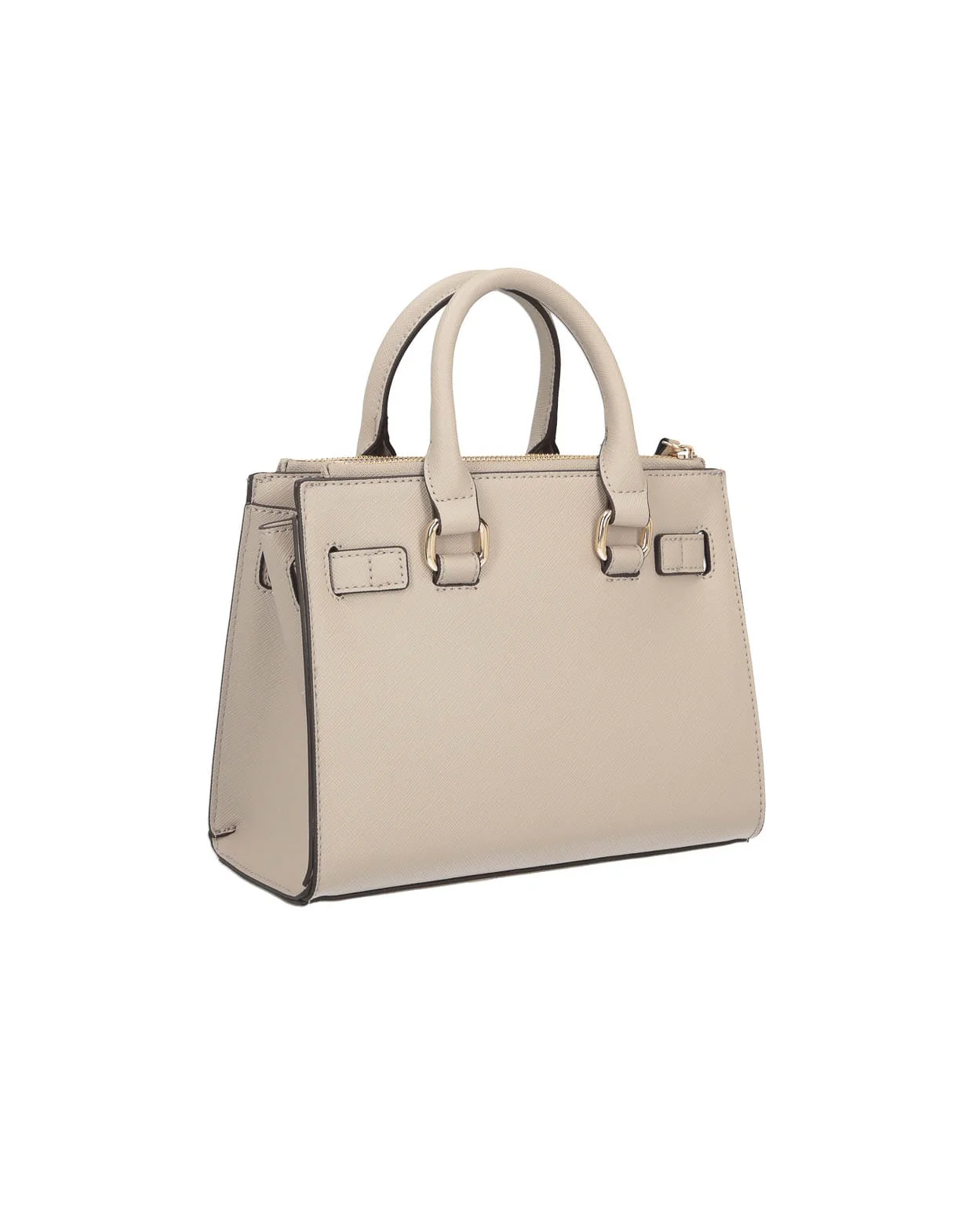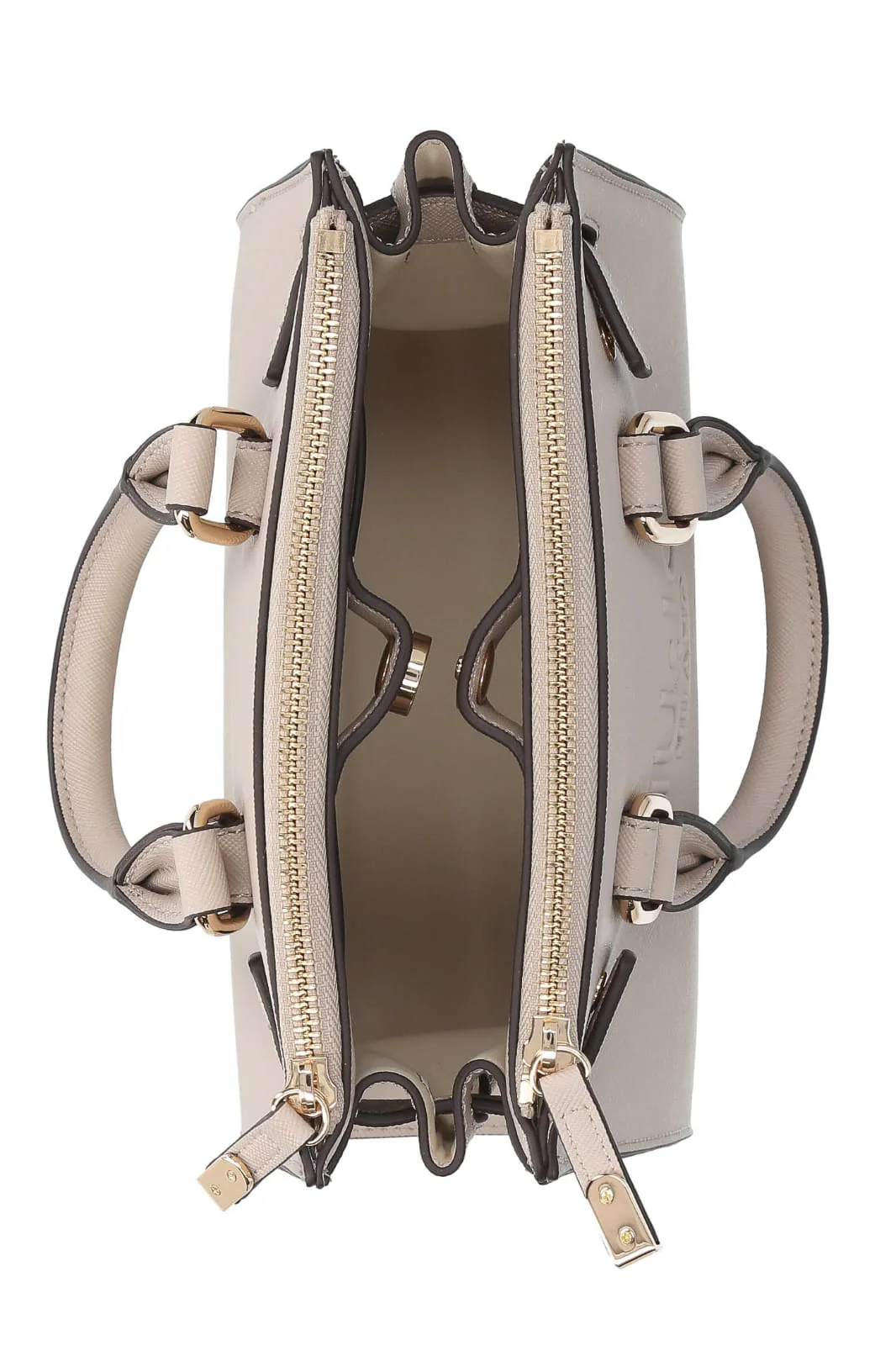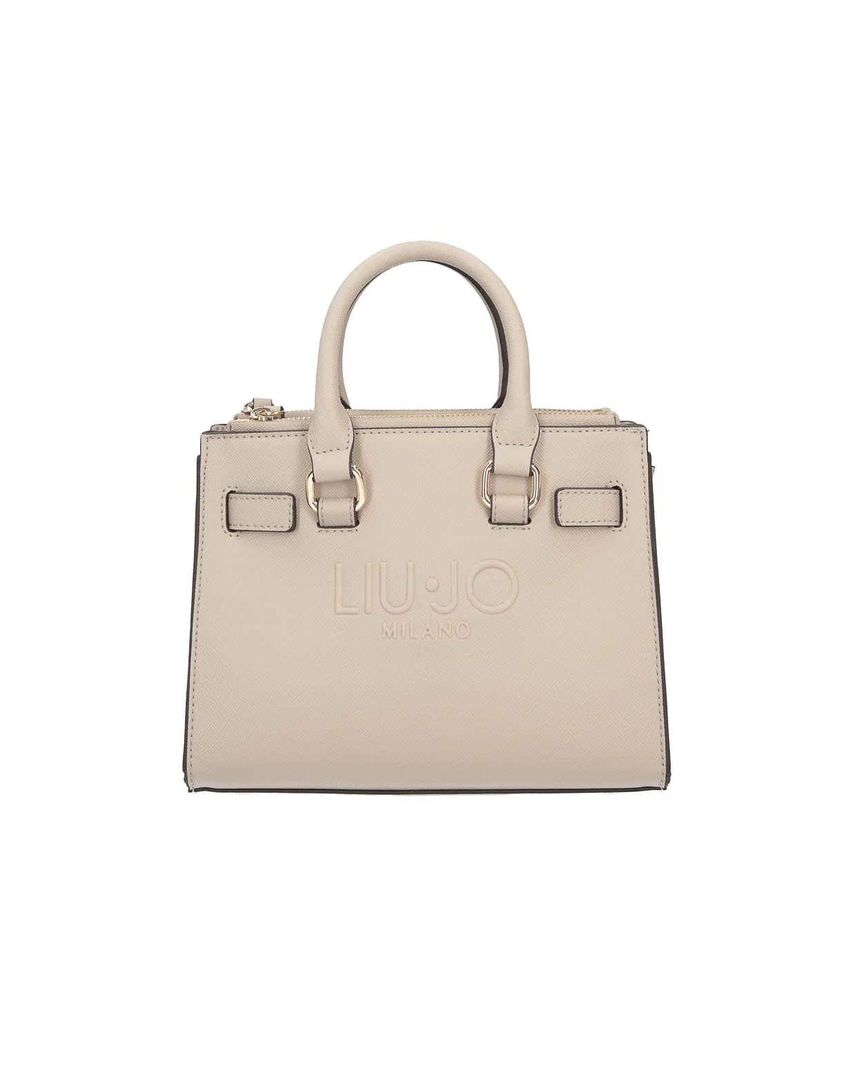 Borsa a mano in similpelle effetto saffiano, maxi logo frontale a rilievo tono su tono, base rigida con piedini di protezione in metallo, doppia tasca a parete, chiusura con bottone a pressione