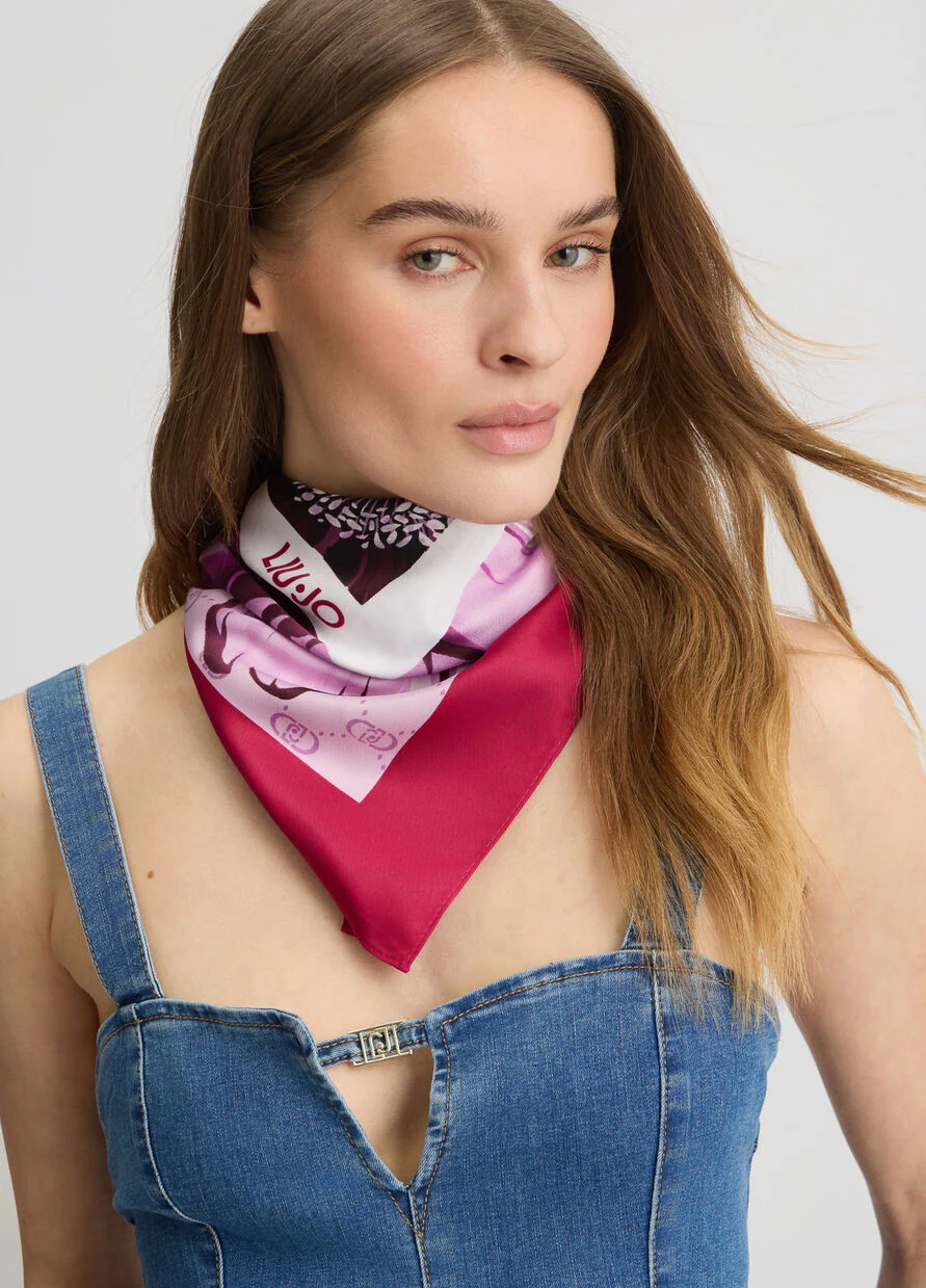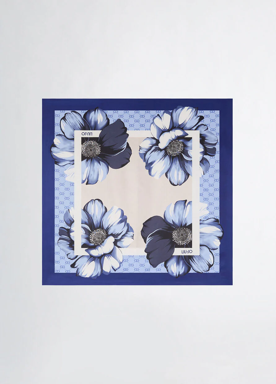Foulard con maxi fiori stampati su un fluido raso con logo