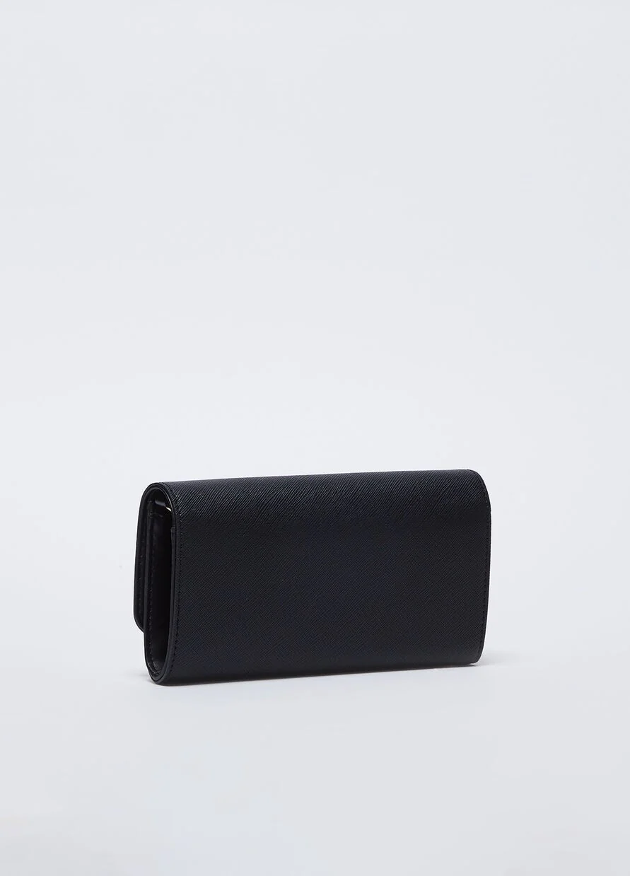 Portafoglio con due scomparti di cui uno chiuso con zip, logo lettering, tracolla removibile in abbinamento, chiusura con bottone magnetico