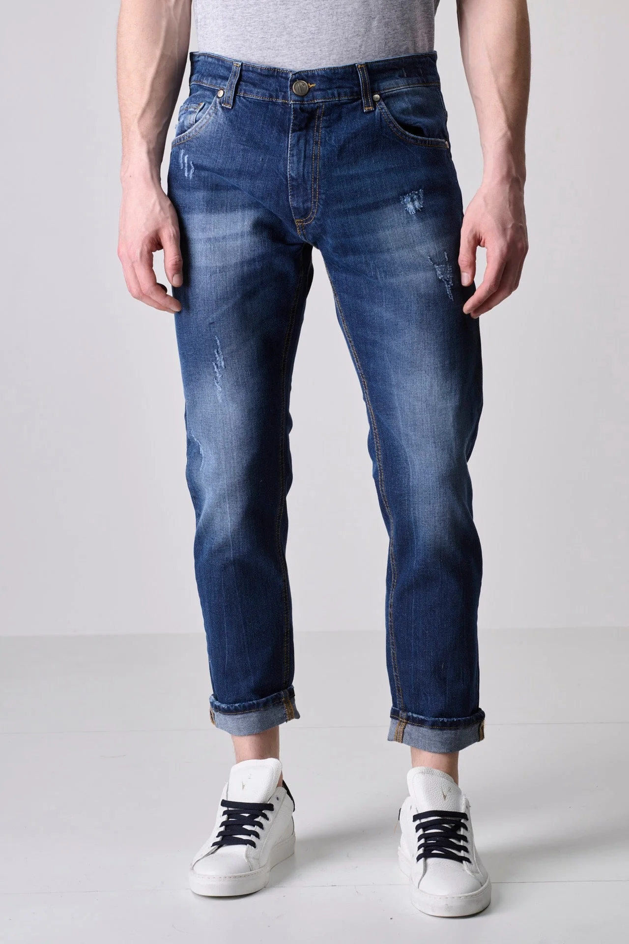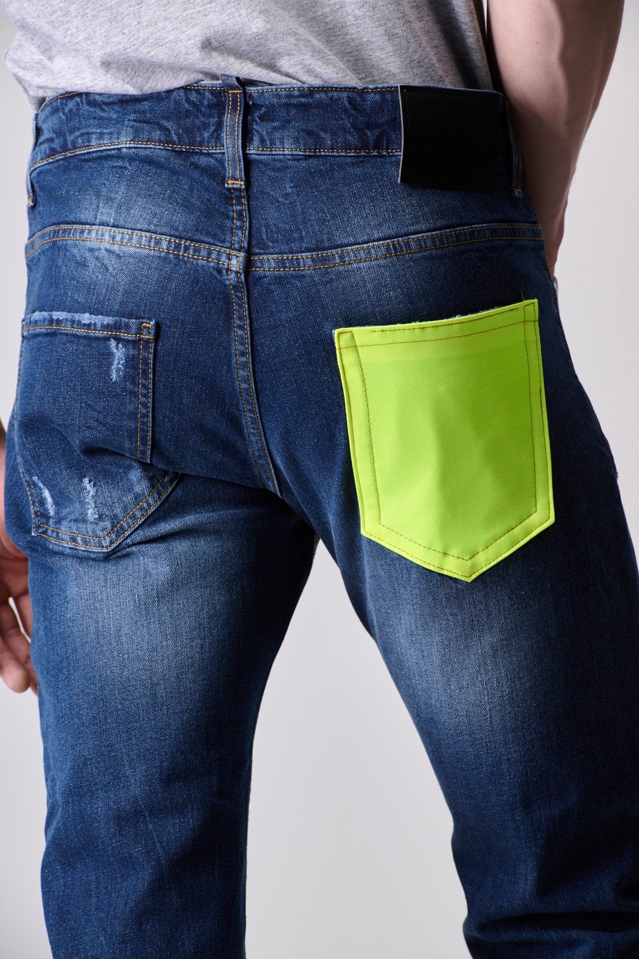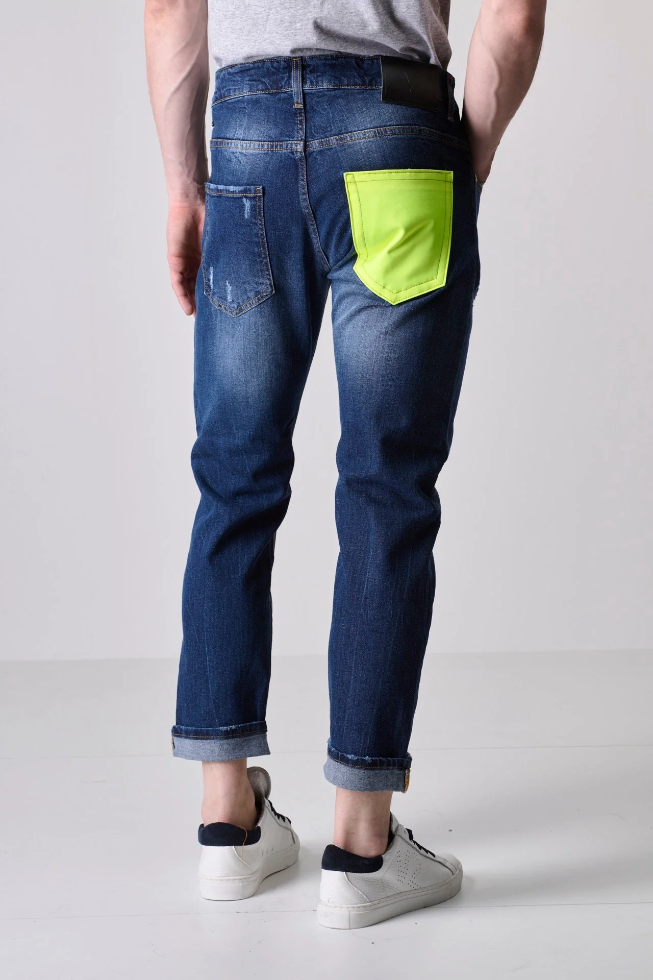 Jeans Azzurro con finitura Stone wash, microabrasioni fatte a mano e tasca posteriore in tessuto V2 Giallo Fluo. Realizzati in cotone al 98%, elasticizzati e con vestibilitร slim.