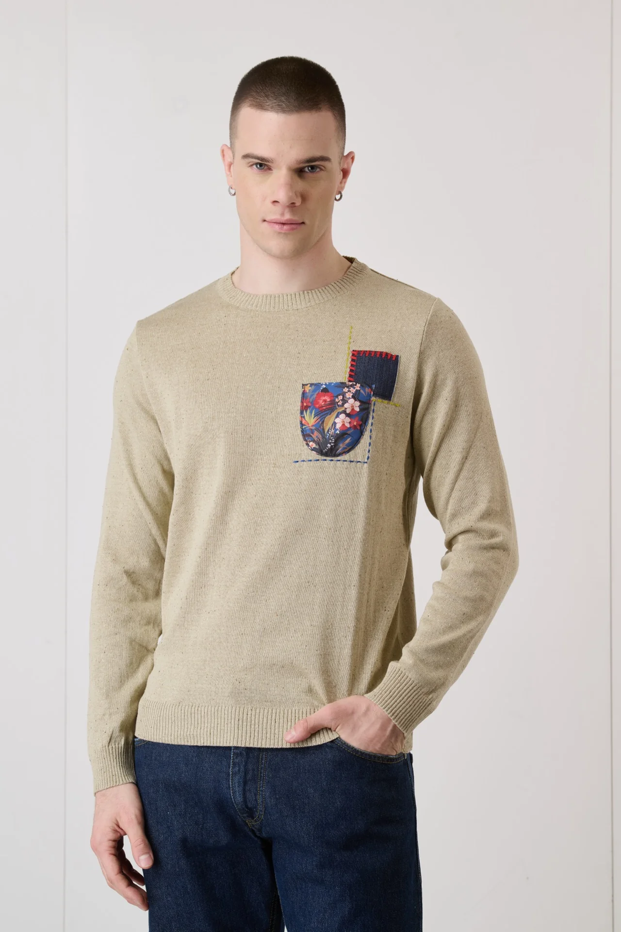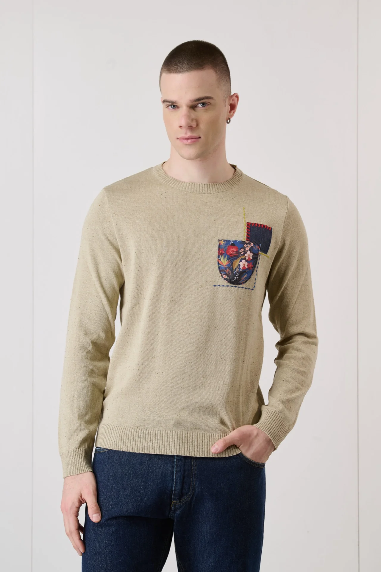 Maglioncino Bottonato Sabbia con Taschino ricamato in tessuto V2
