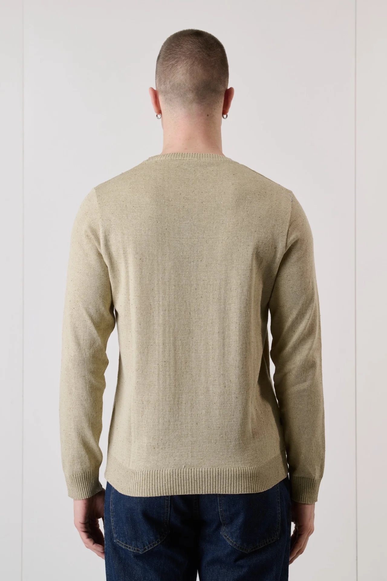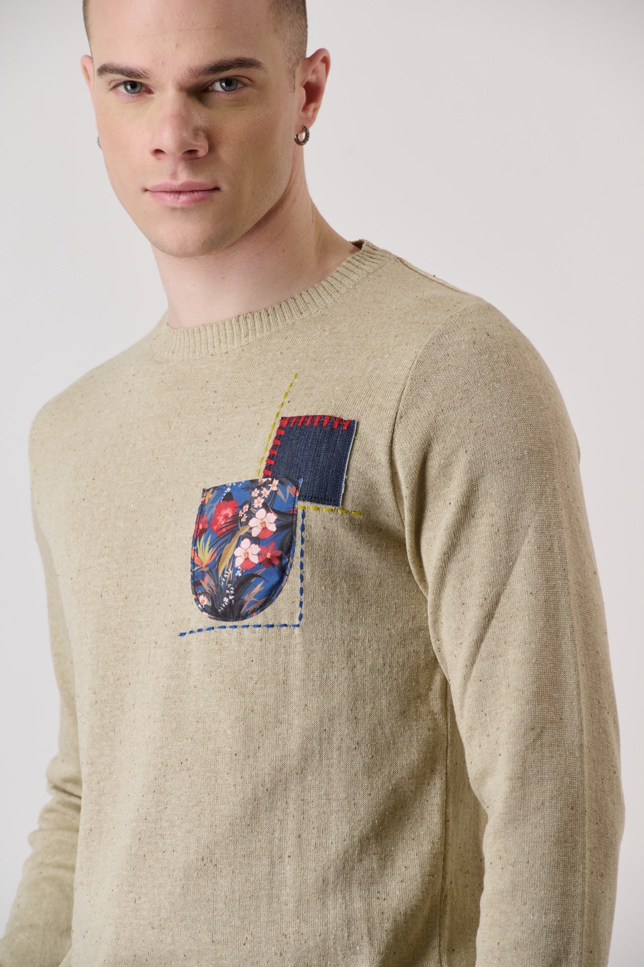 Il design del filato puntinato aggiunge un tocco sofisticato e versatile. Non mancano le personalizzazioni realizzate nel laboratorio creativo V2: taschino, patch e ricami frontali sono applicati a mano su ogni capo.