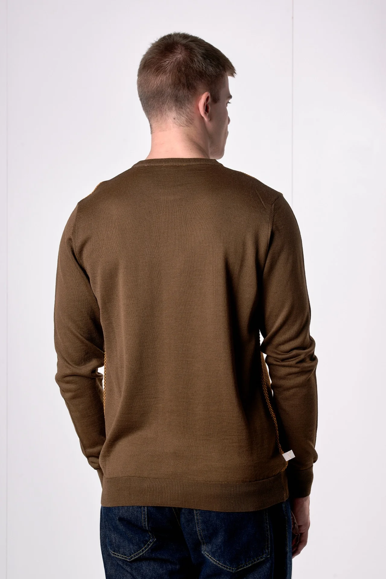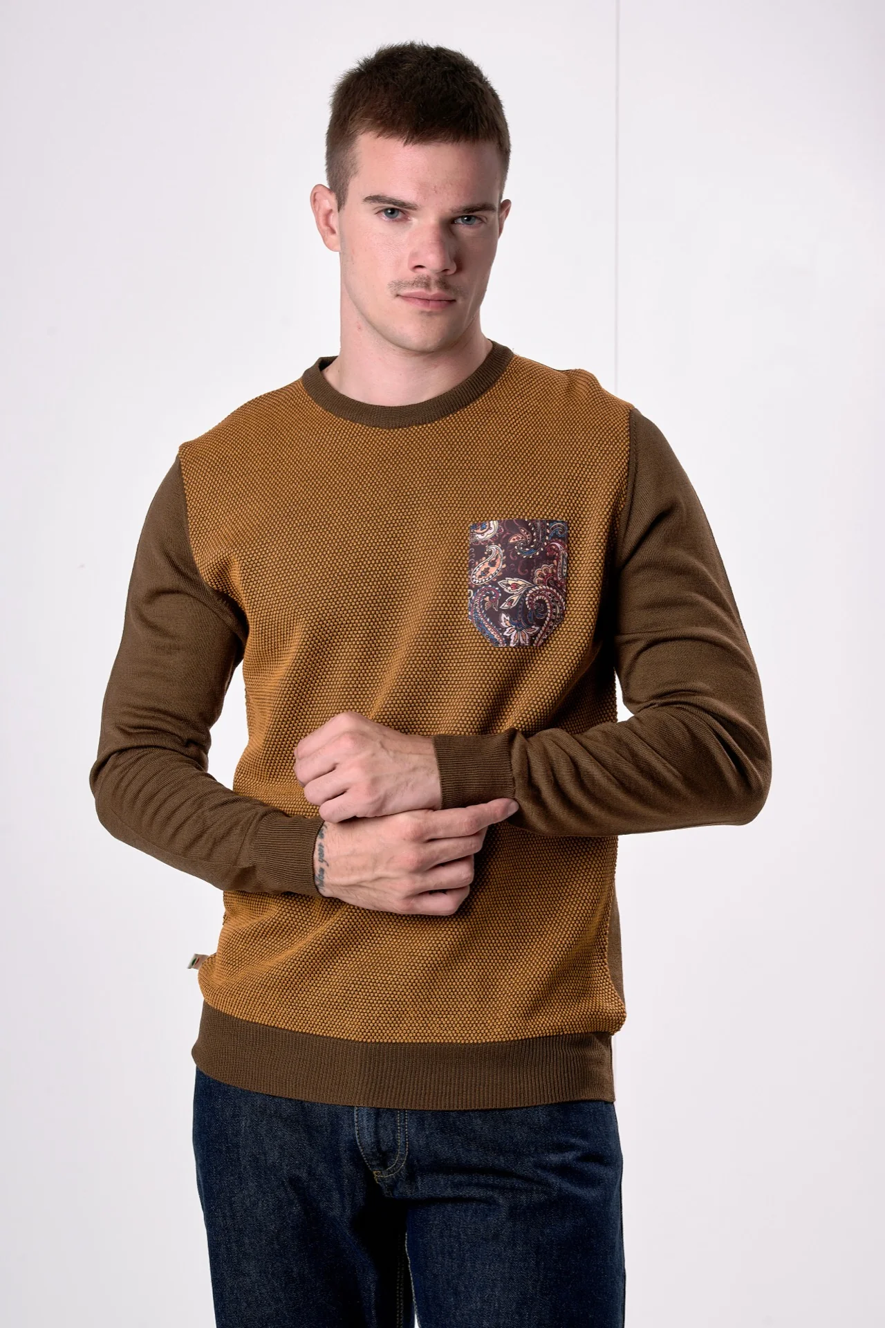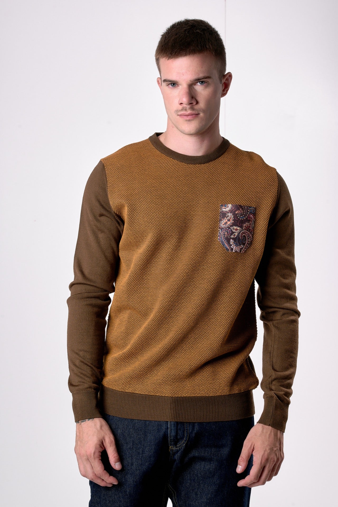 Maglione in lana merino Girocollo punto riso Bicolor Moro con taschino in tessuto V2