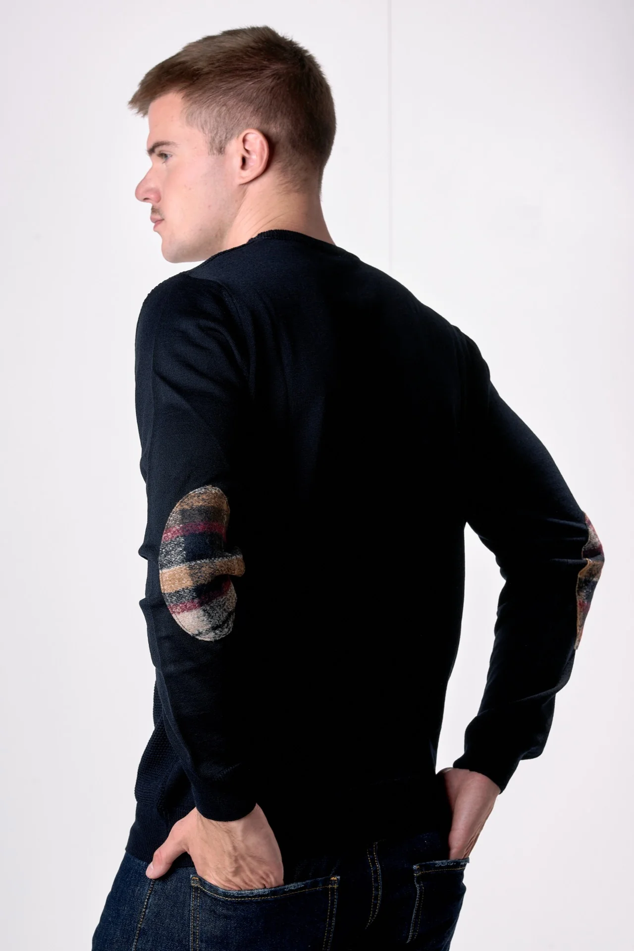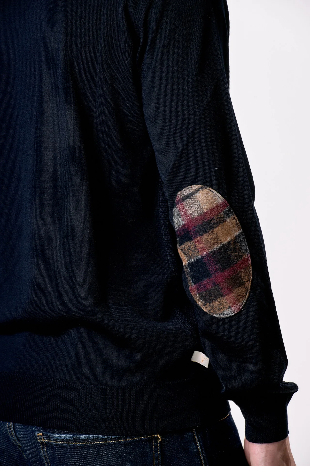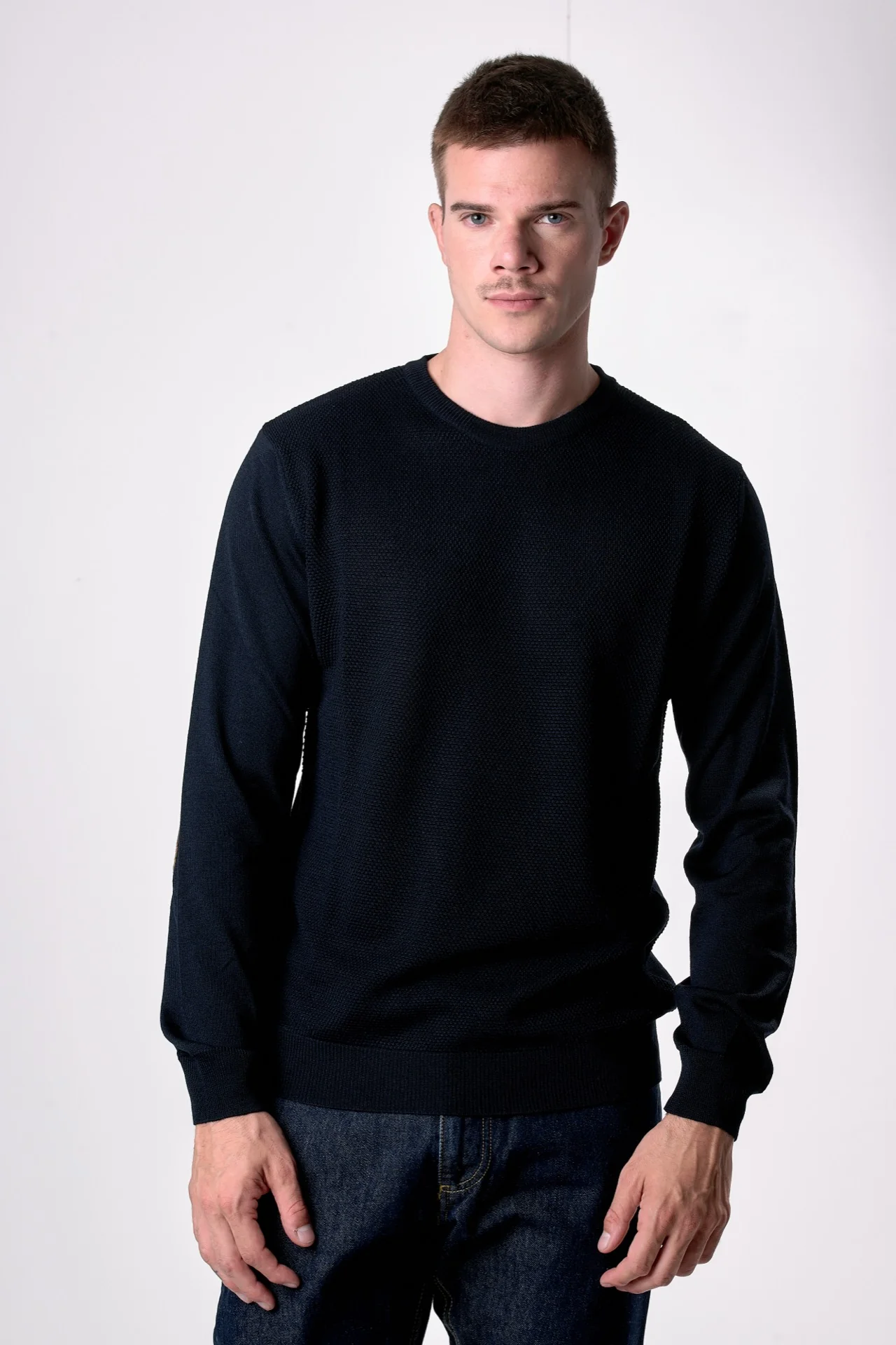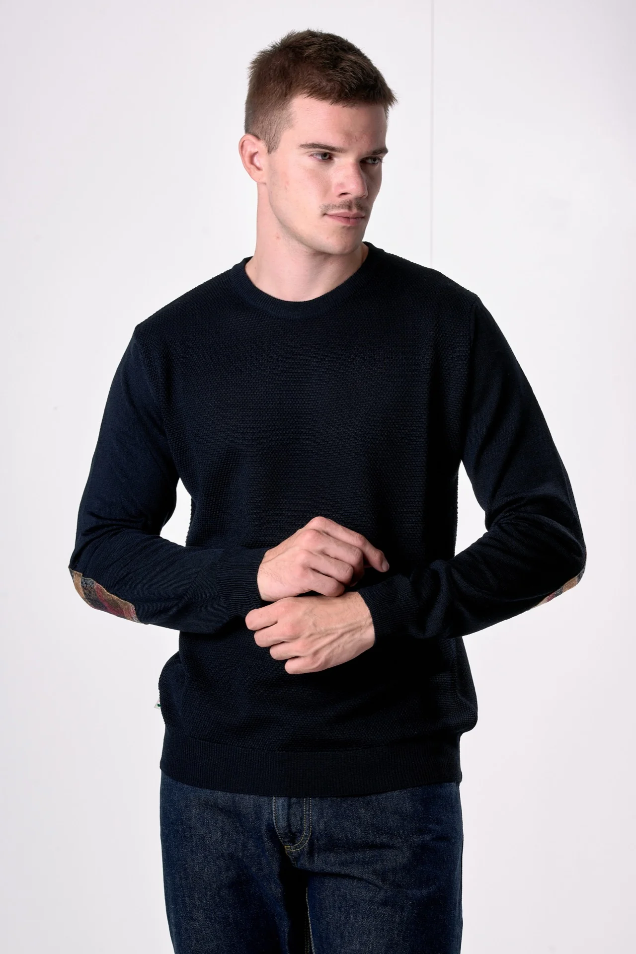Maglione in lana merino Girocollo punto riso Blu con toppe in tessuto V2