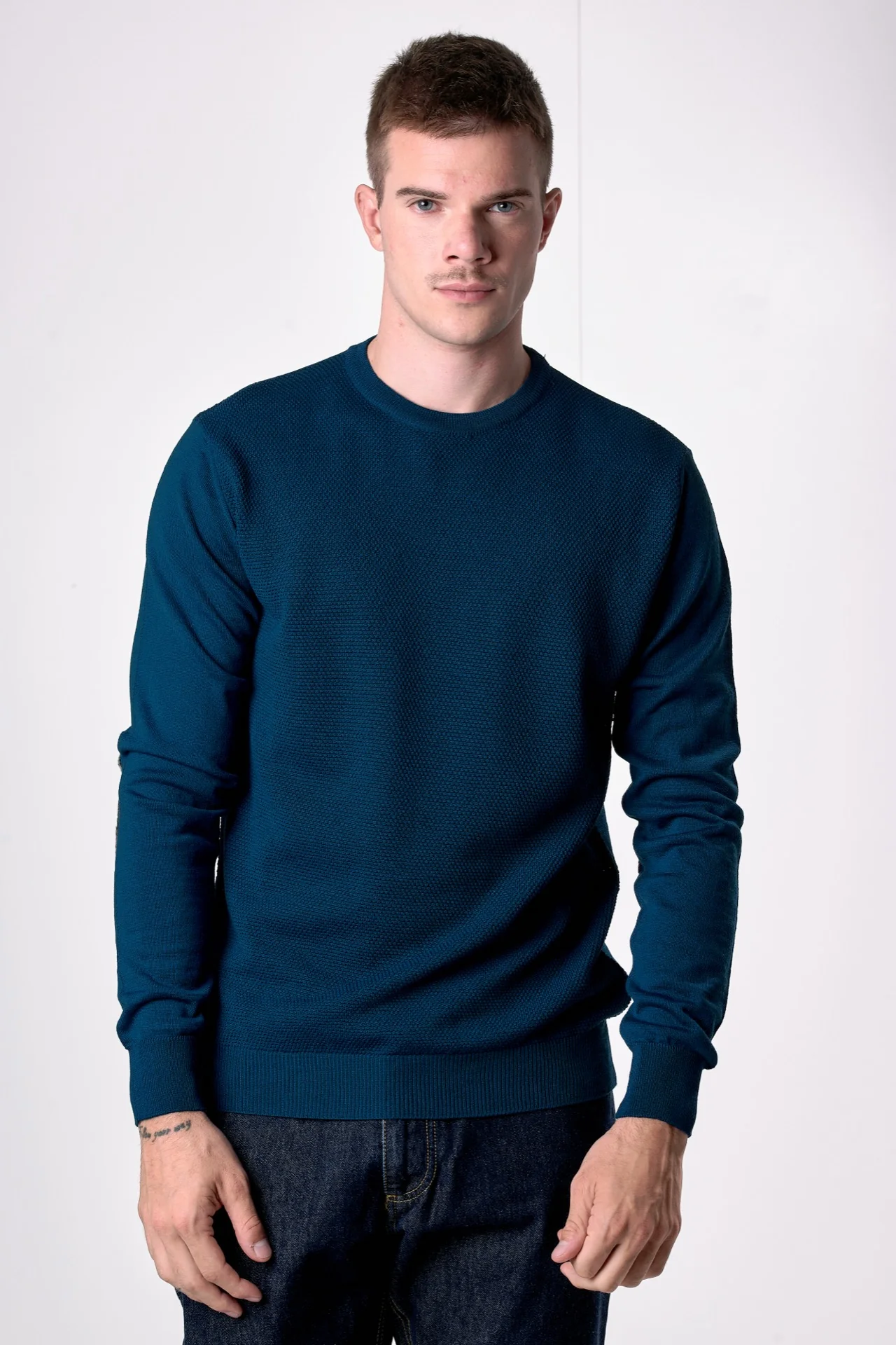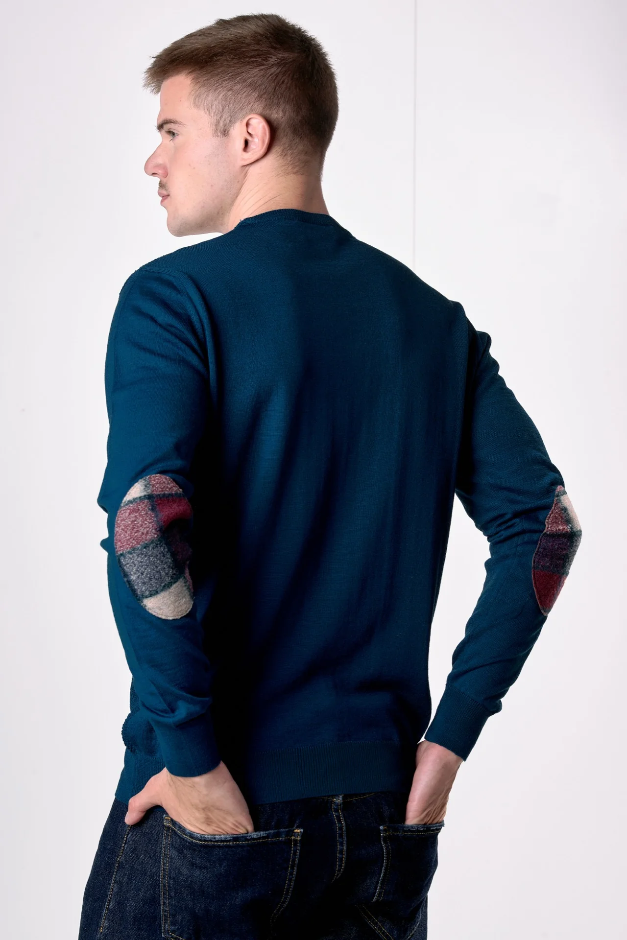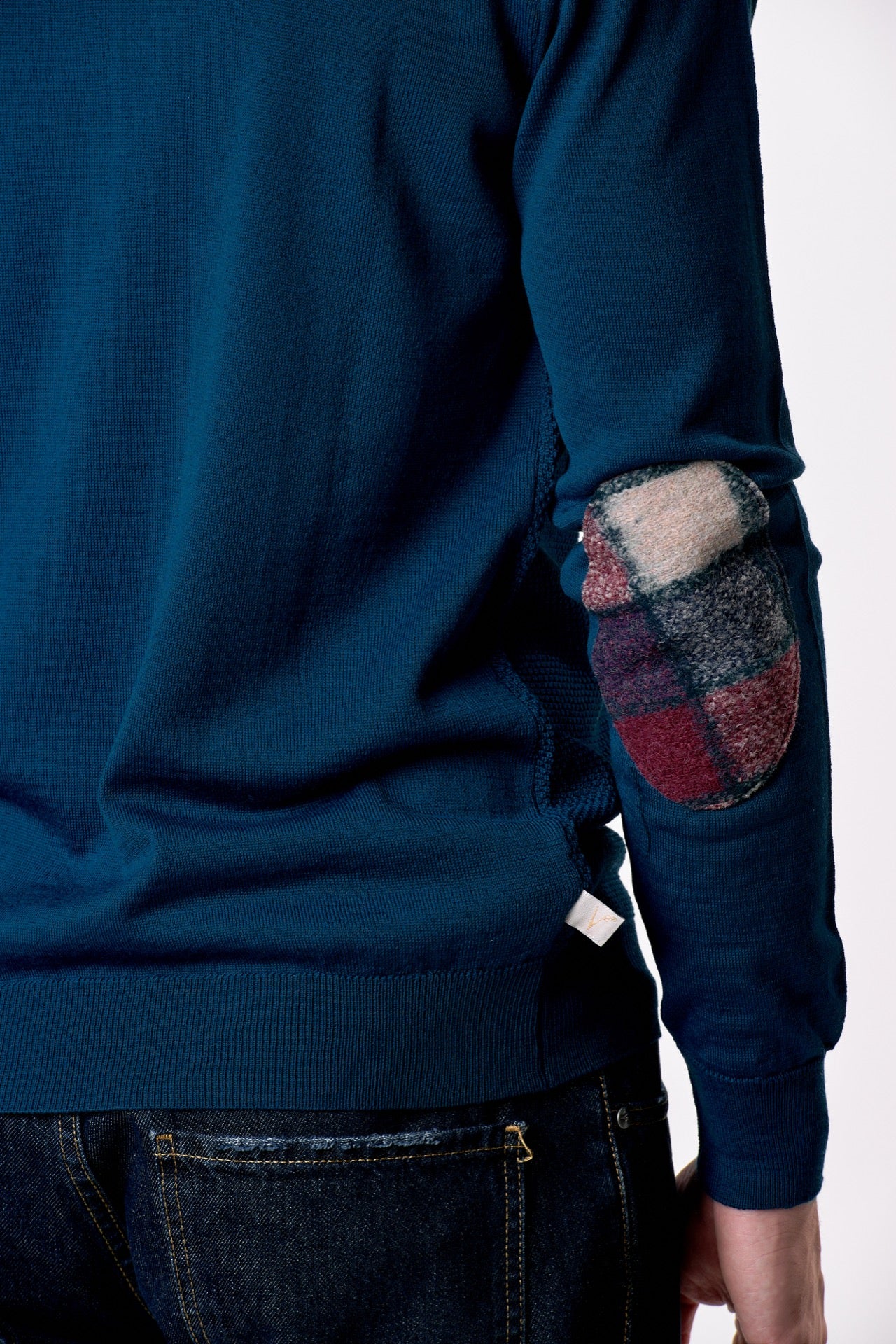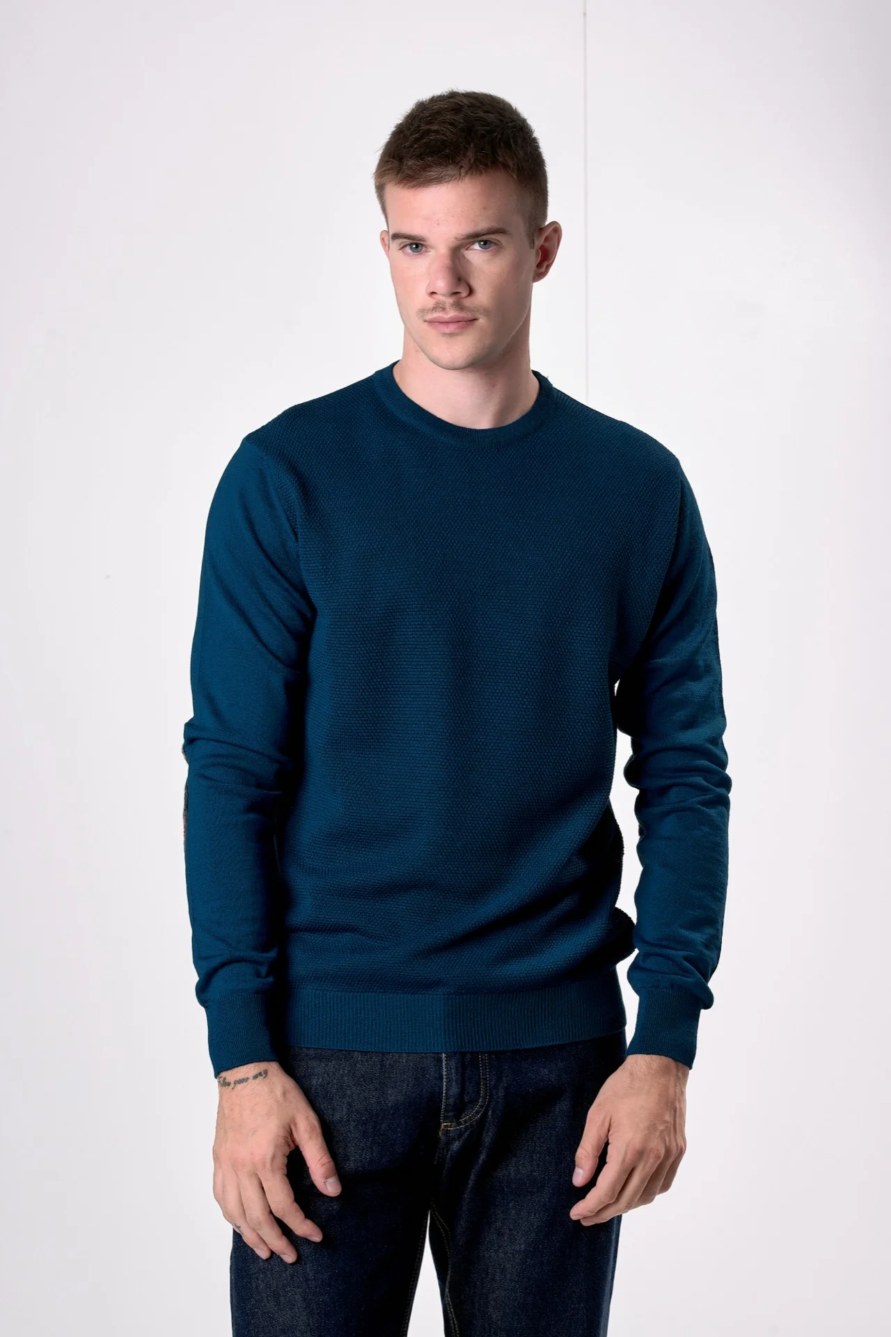 Maglione in lana merino Girocollo punto riso Ottanio con toppe in tessuto V2