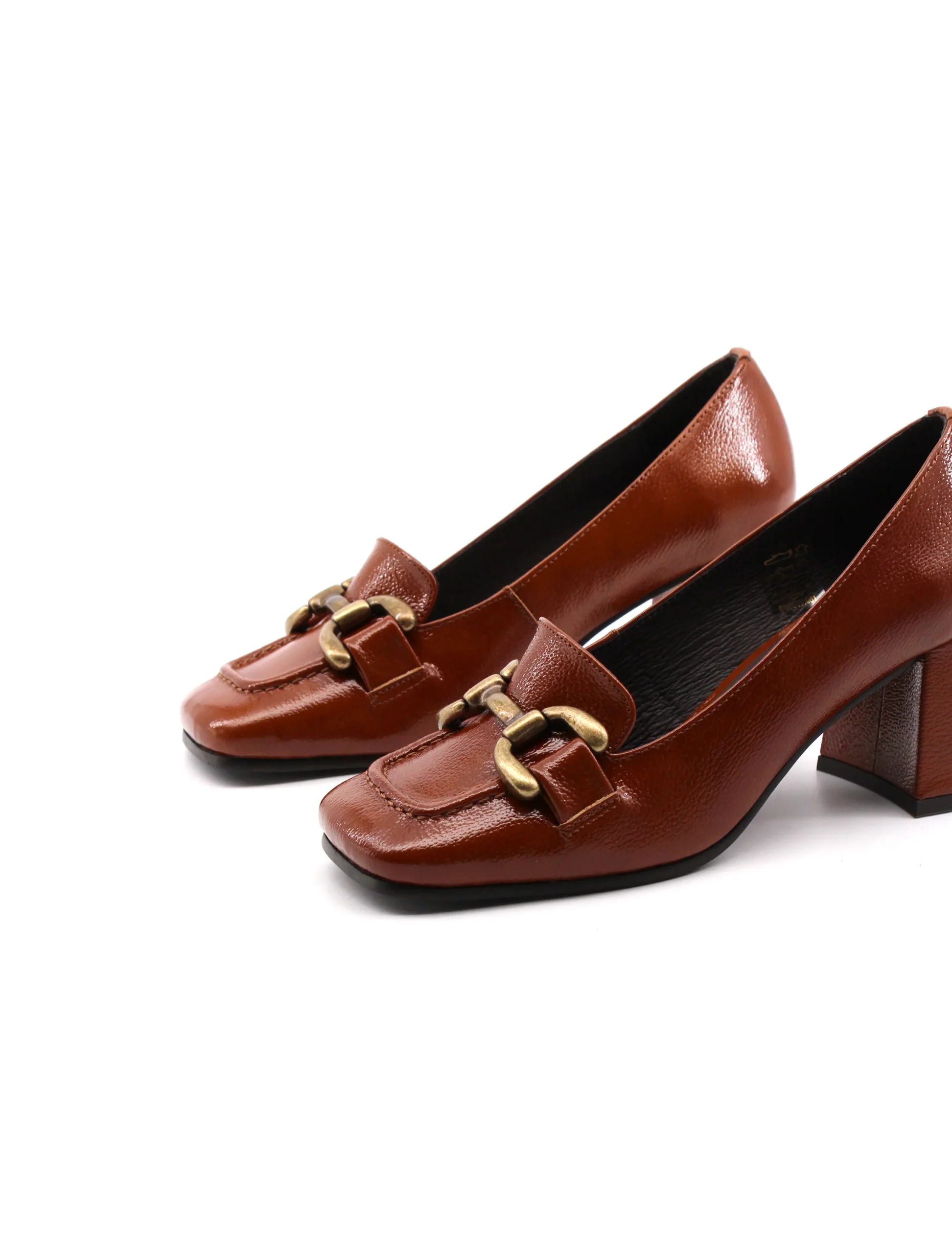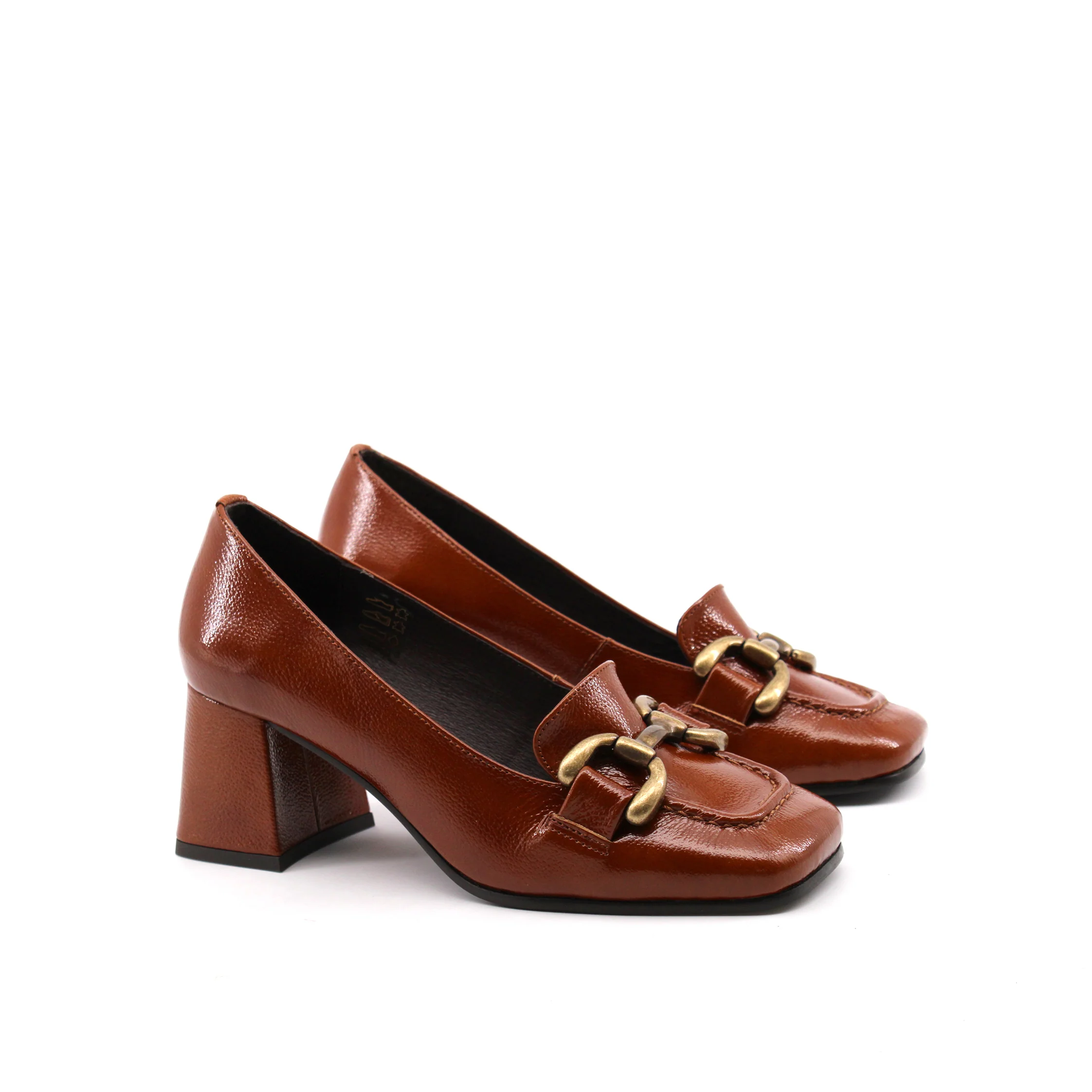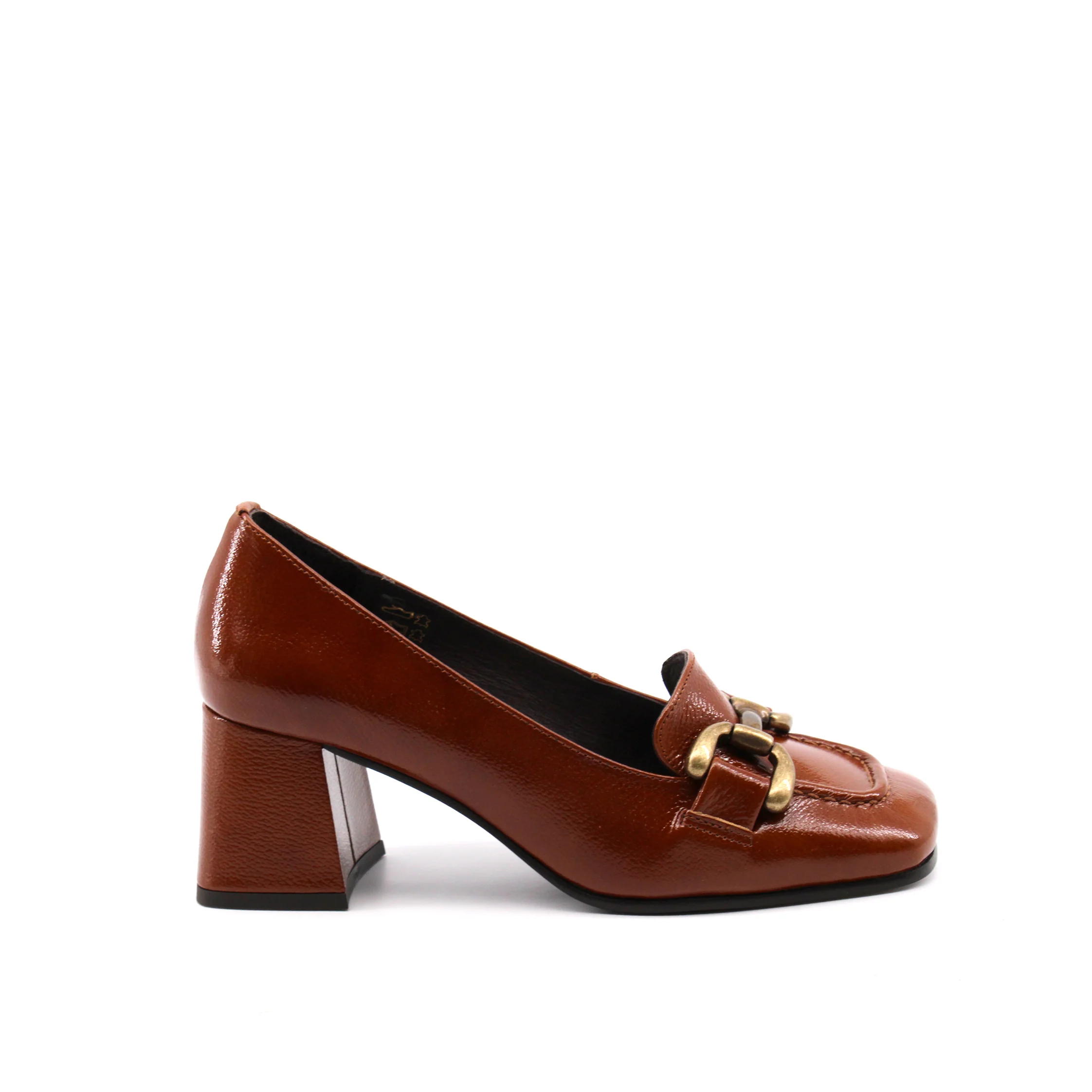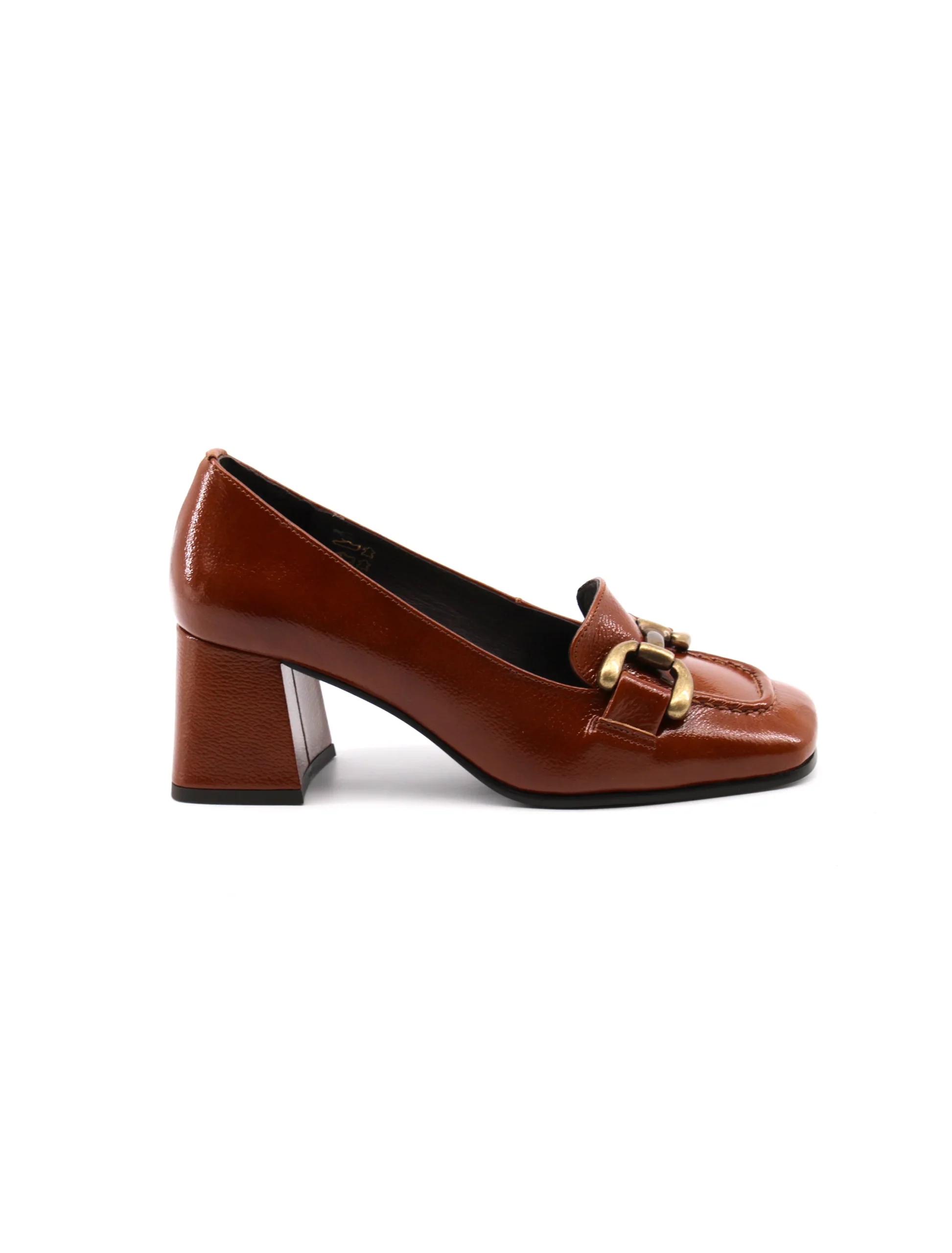 Conte’ mocassino con tacco da donna in vera pelle effetto vernice con morsetto dorato, soffice plantare in vera pelle e suola in gomma. Elegante e versatile. Made in Portugal.