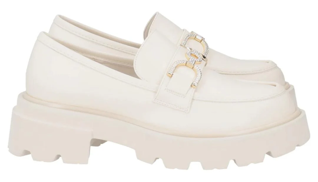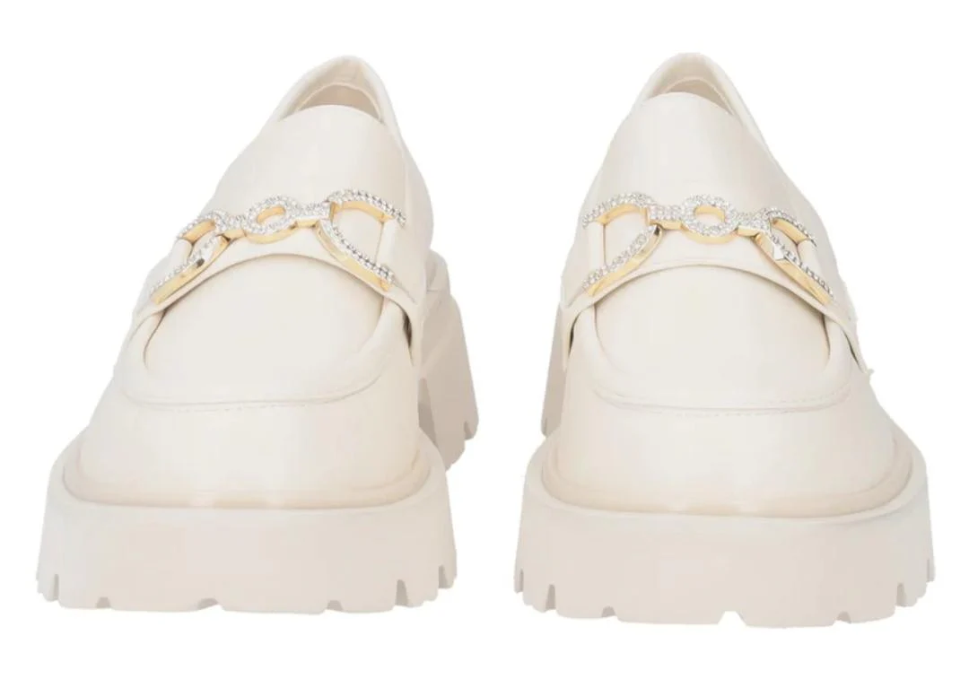 Mocassino con la parte superiore rotonda, dettaglio oro con pietre, altezza tacco 4 cm