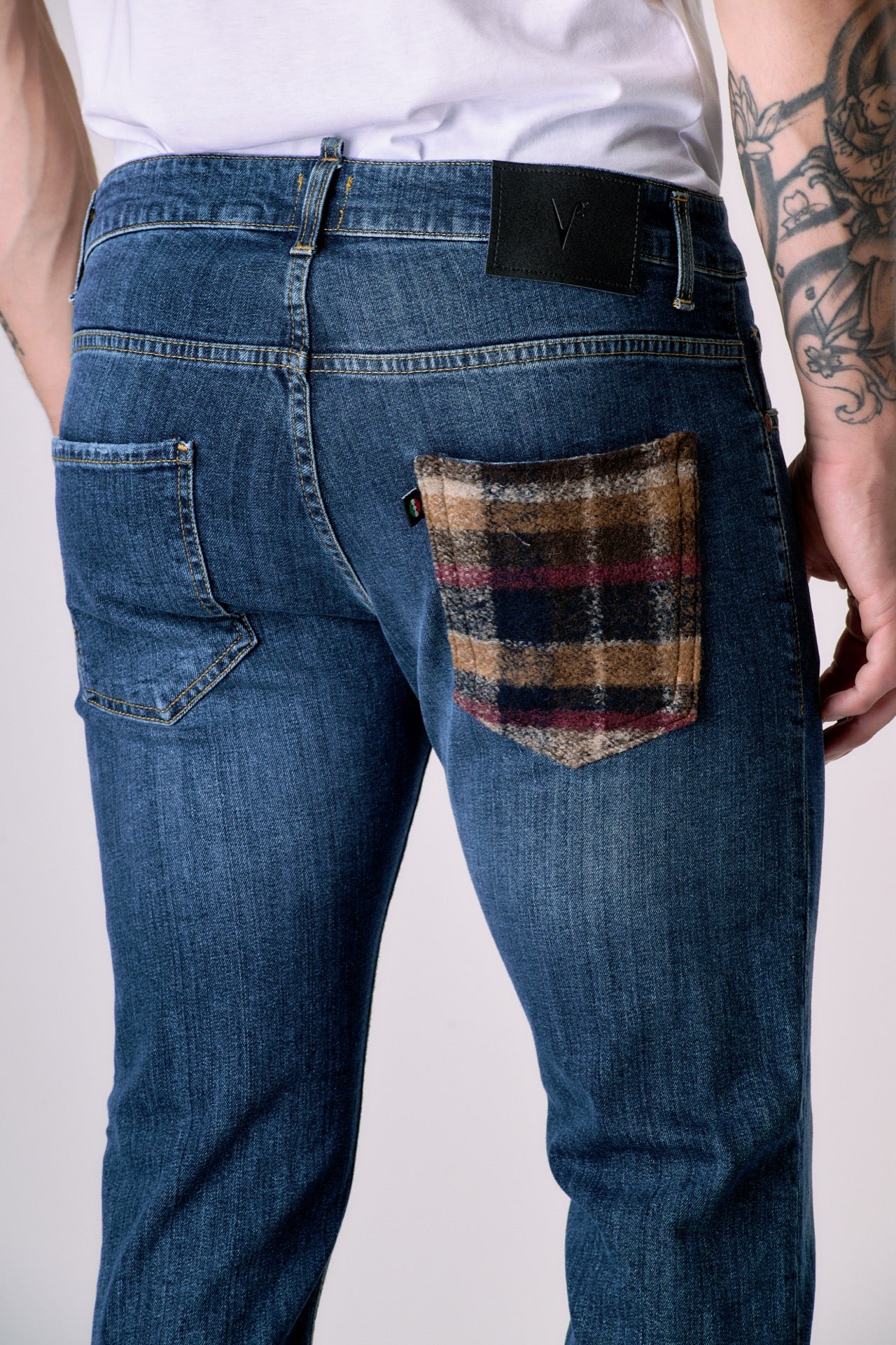 Realizzato in cotone, รจ perfetto da portare con una sneakers o uno stivaletto. La salpa รจ in ecopelle logata V2 e il bottone in metallo viene forgiato a mano e inciso con il logo V2. La tasca posteriore รจ realizzata in tessuto V2, applicata a mano su ogni jeans.