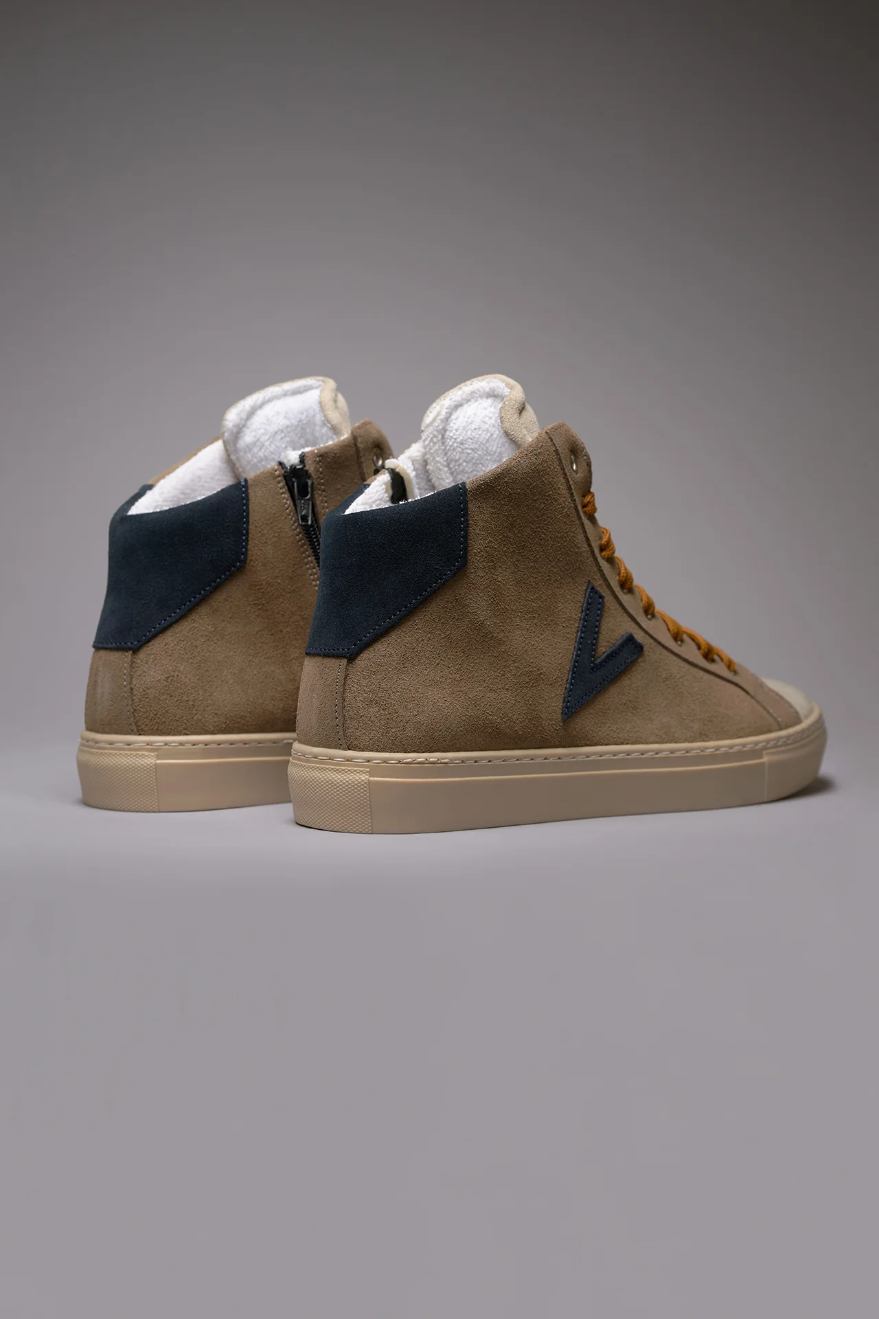 Ancora una volta sono i dettagli a fare la differenza: suola con effetto invecchiato, tomaia Tortora, linguetta Panna, lacci colorati a contrasto e retro e inserto laterale Blu.