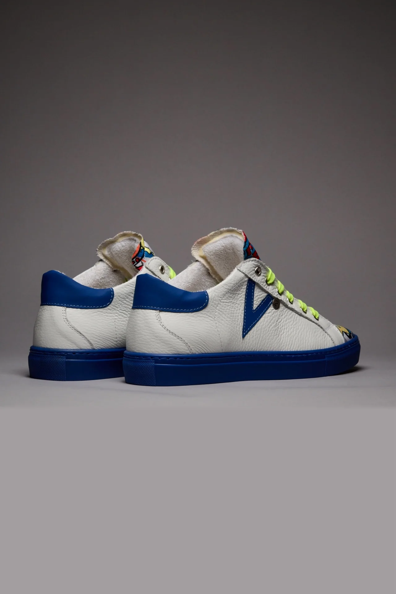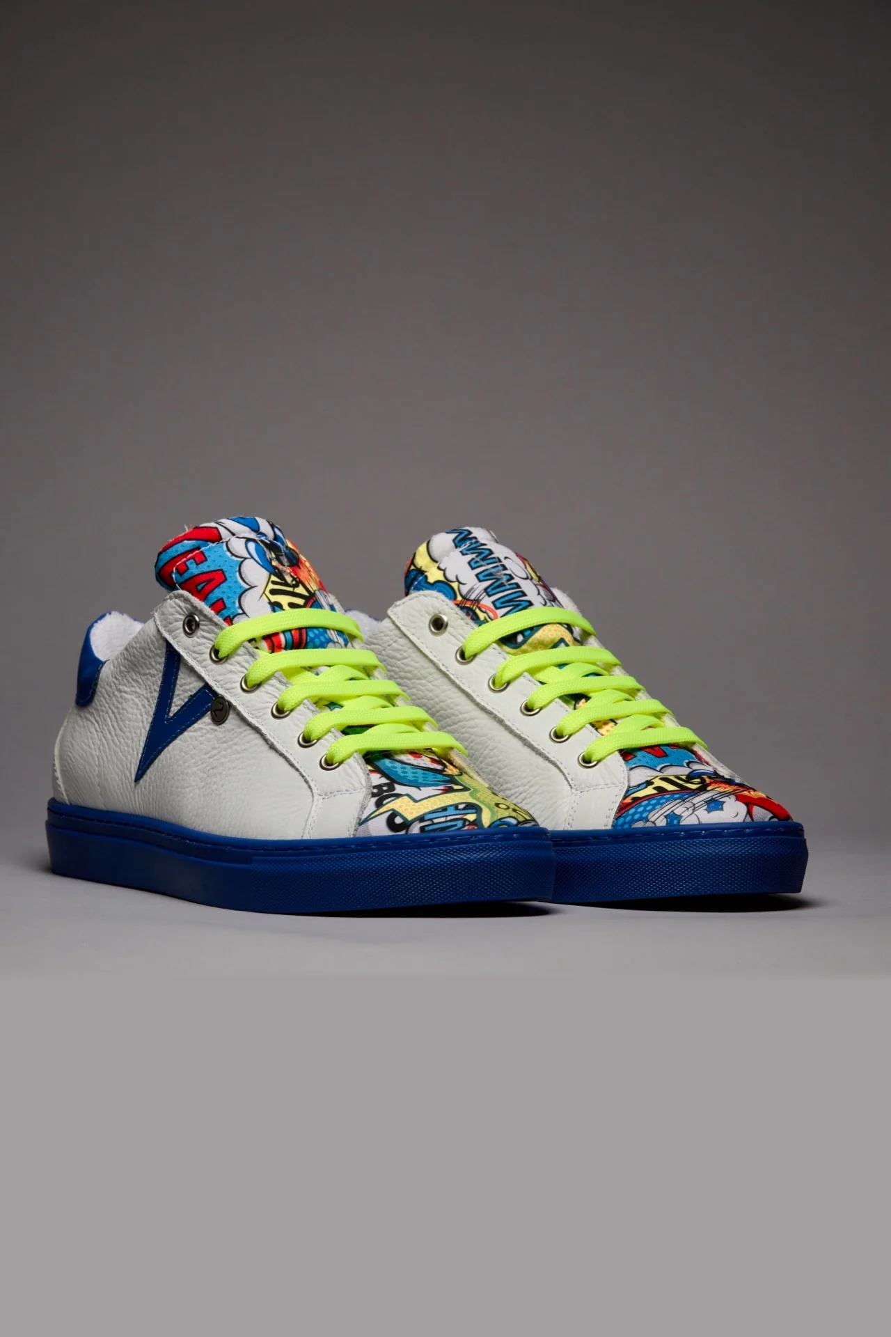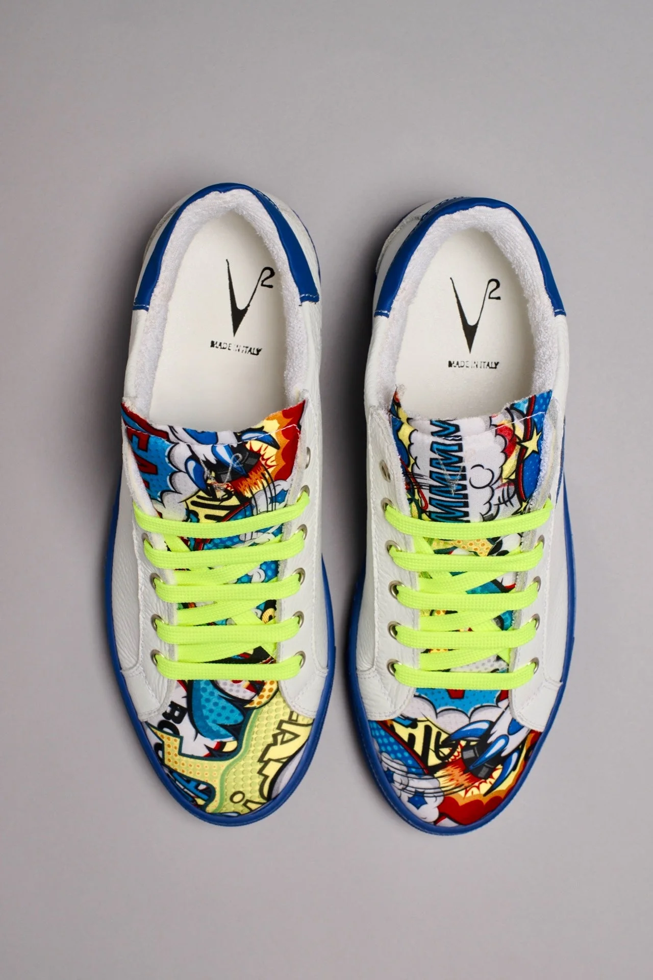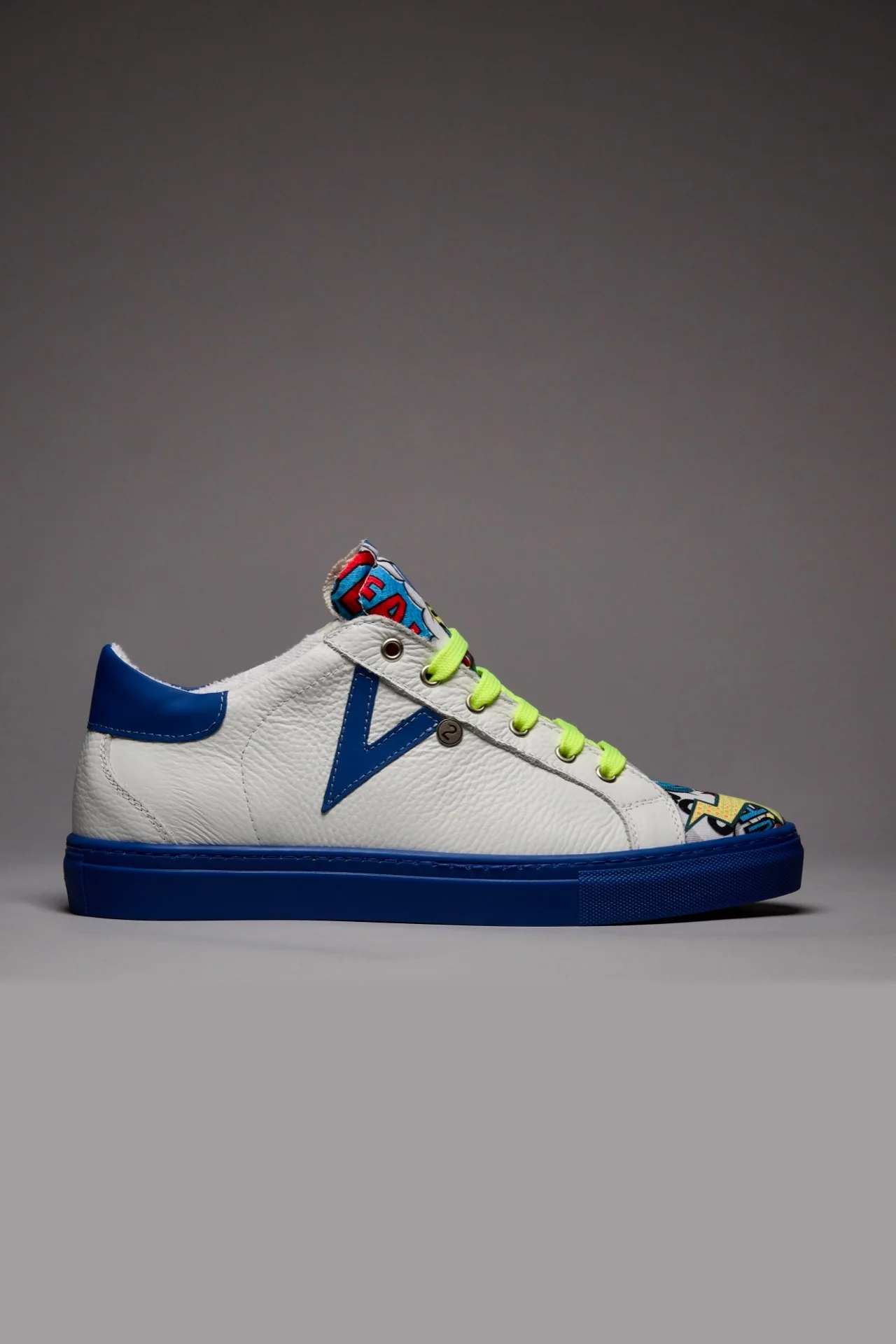 OLYMPIC RAINBOW – Sneakers a suola bassa Bianca con suola Blu Royal e lacci Giallo Fluo e linguetta in tessuto Comics