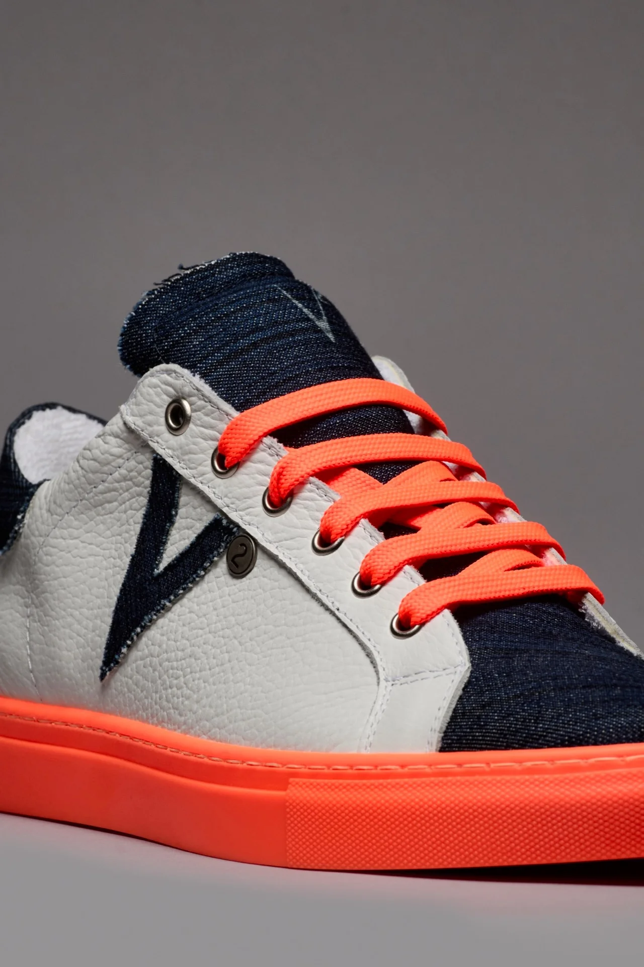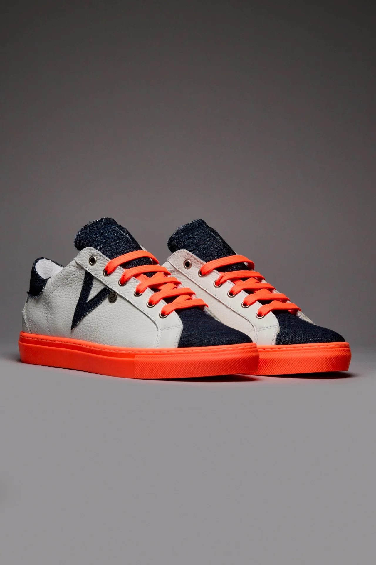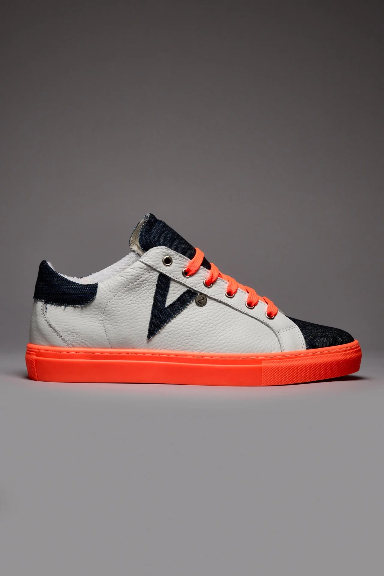 OLYMPIC RAINBOW – Sneakers a suola bassa Bianca con suola e lacci Arancio Fluo e linguetta in tessuto Denim
