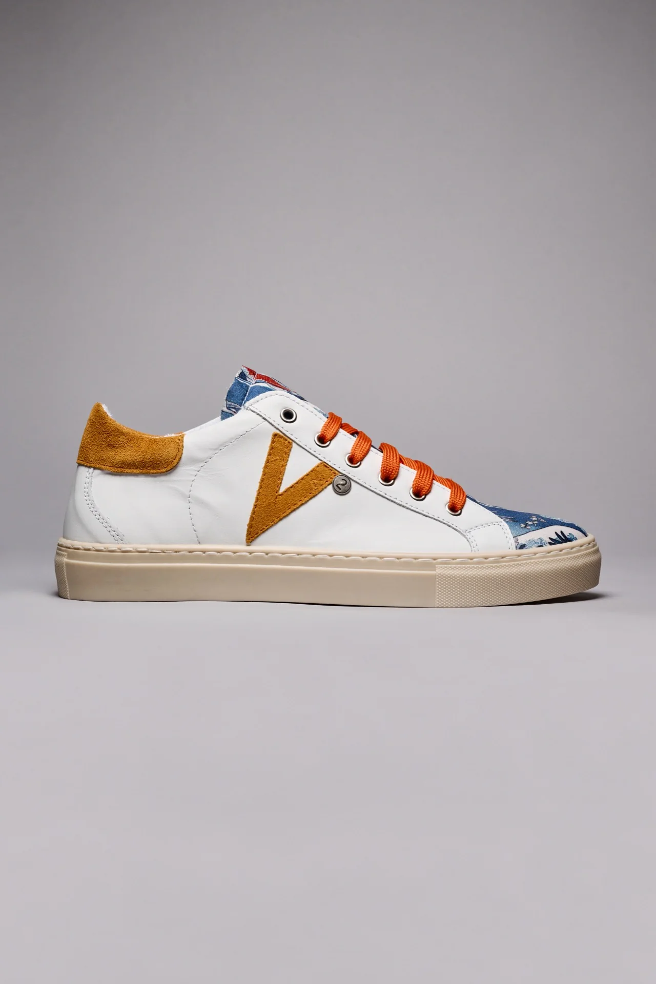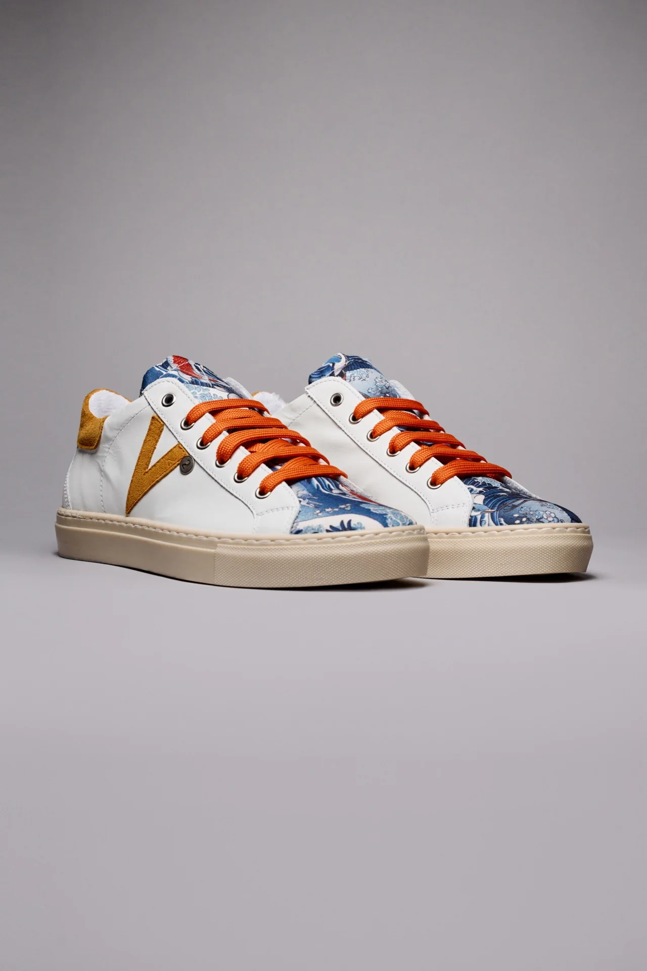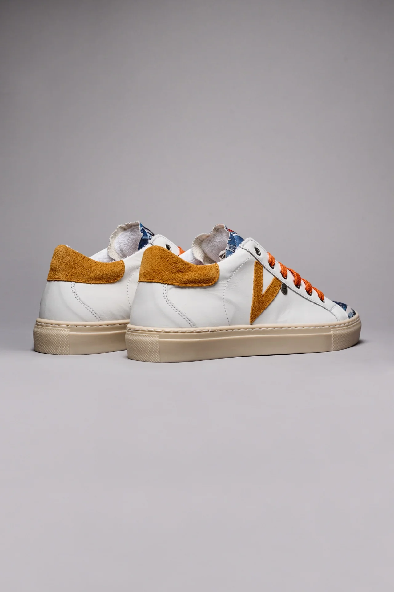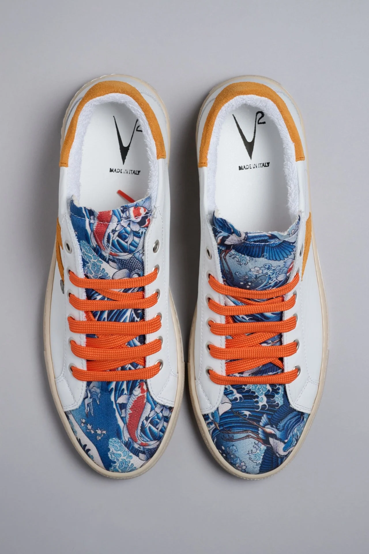 OLYMPIC – Sneakers a suola bassa in pelle Bianca retro e inserto Arancio con linguetta in tessuto Japan Waves