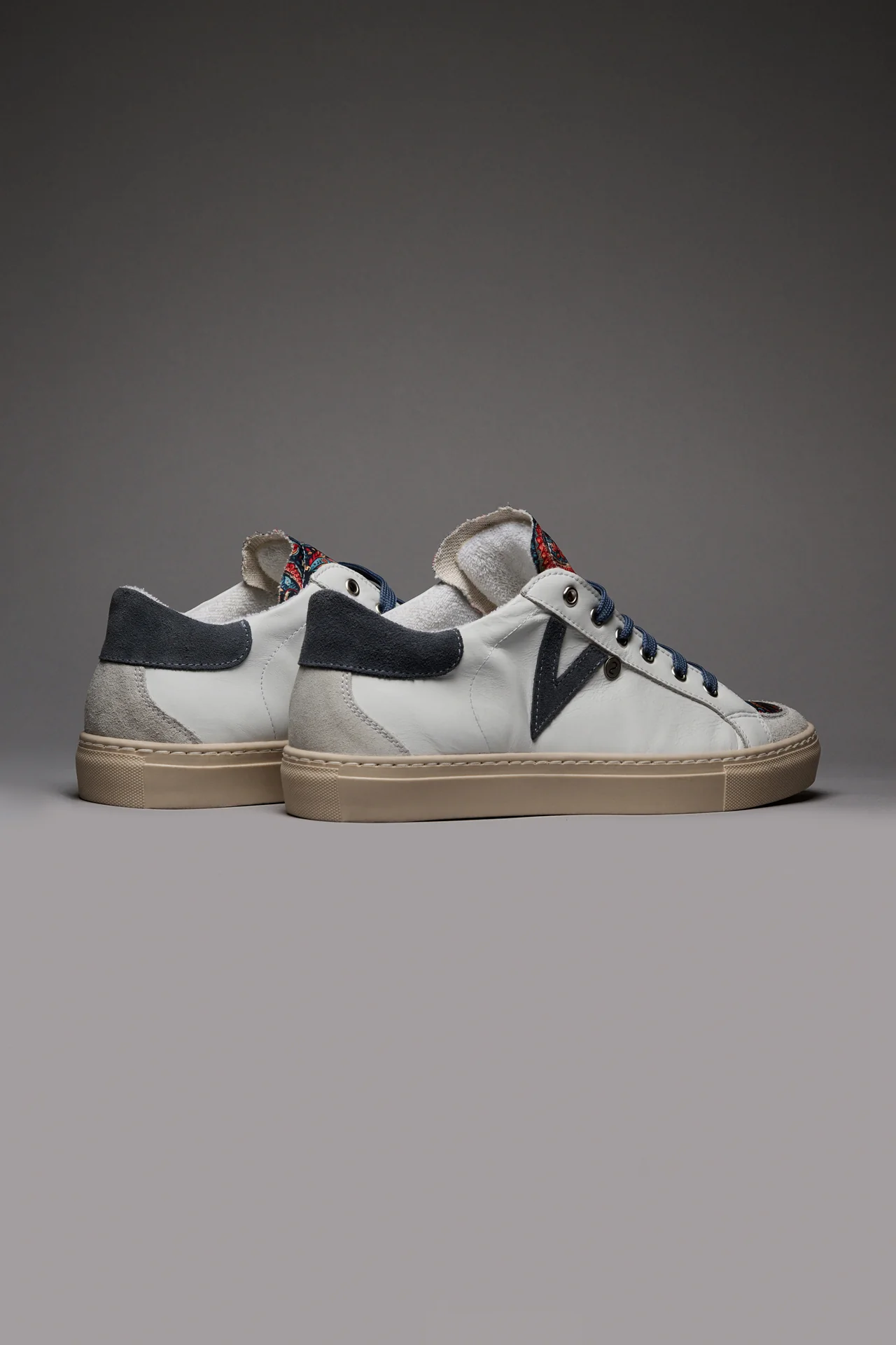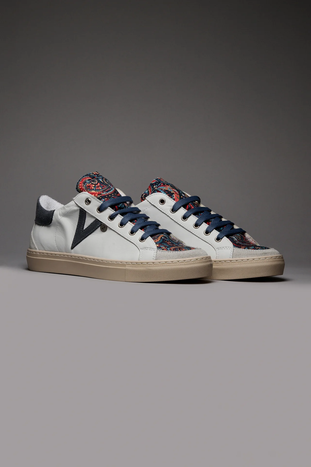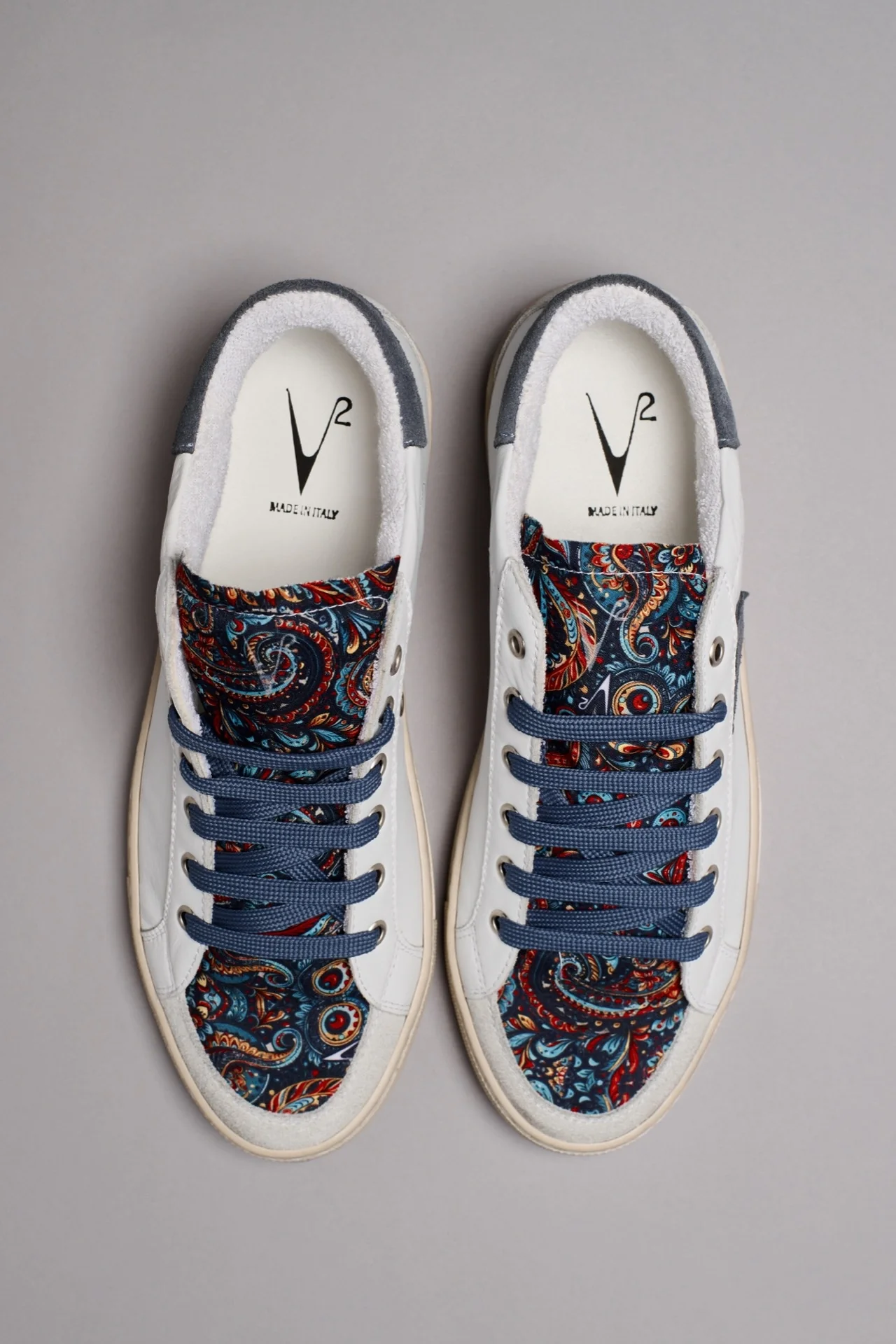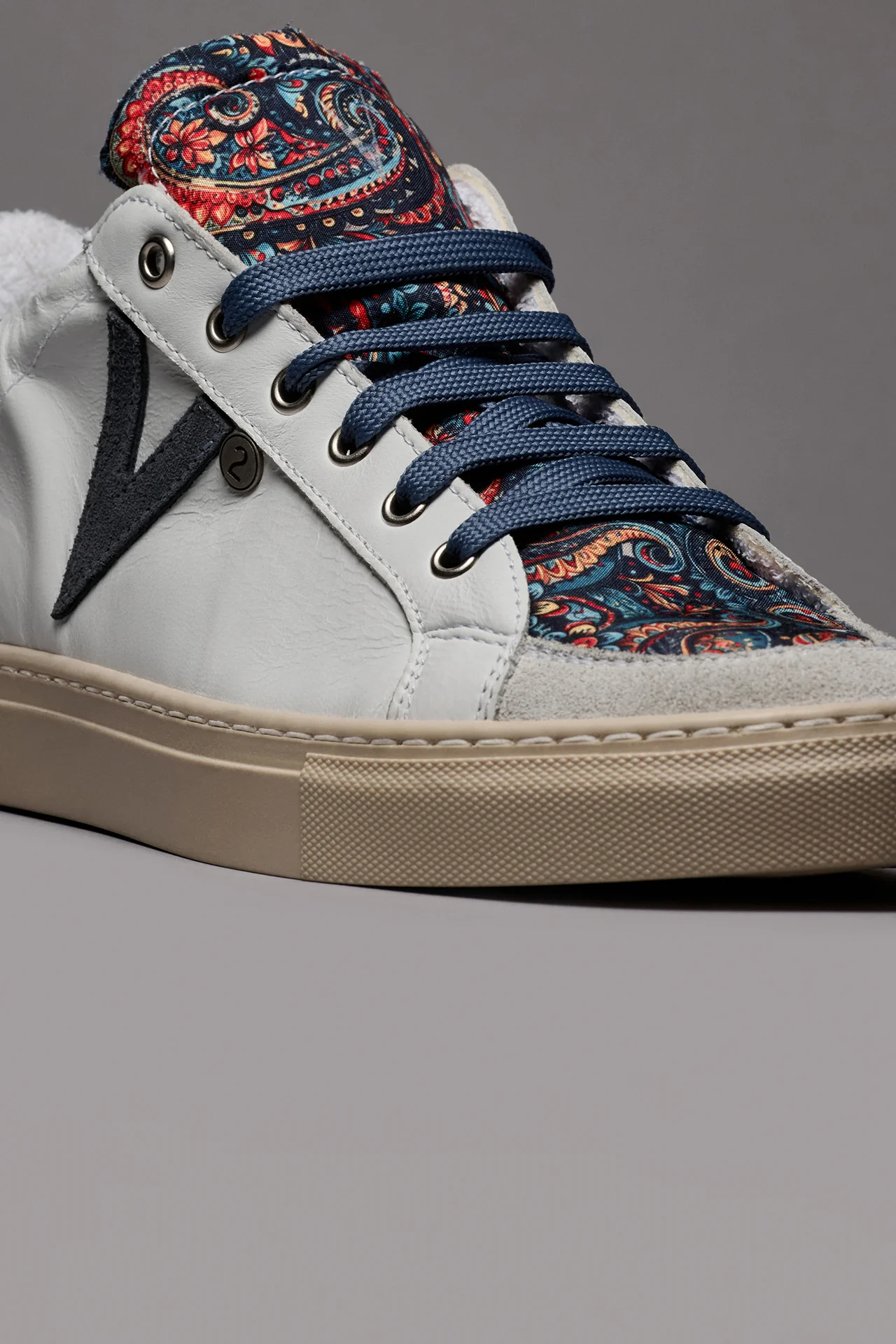 A completare il suo look ci pensano gli immancabili dettagli: lacci colorati, retro e inserto laterale in pelle scamosciata e linguetta in tessuto V2.