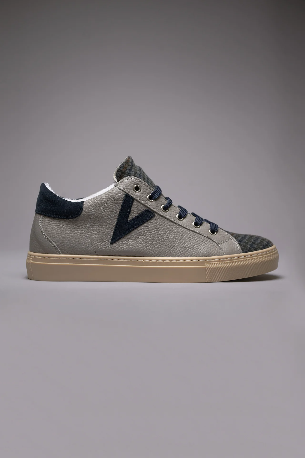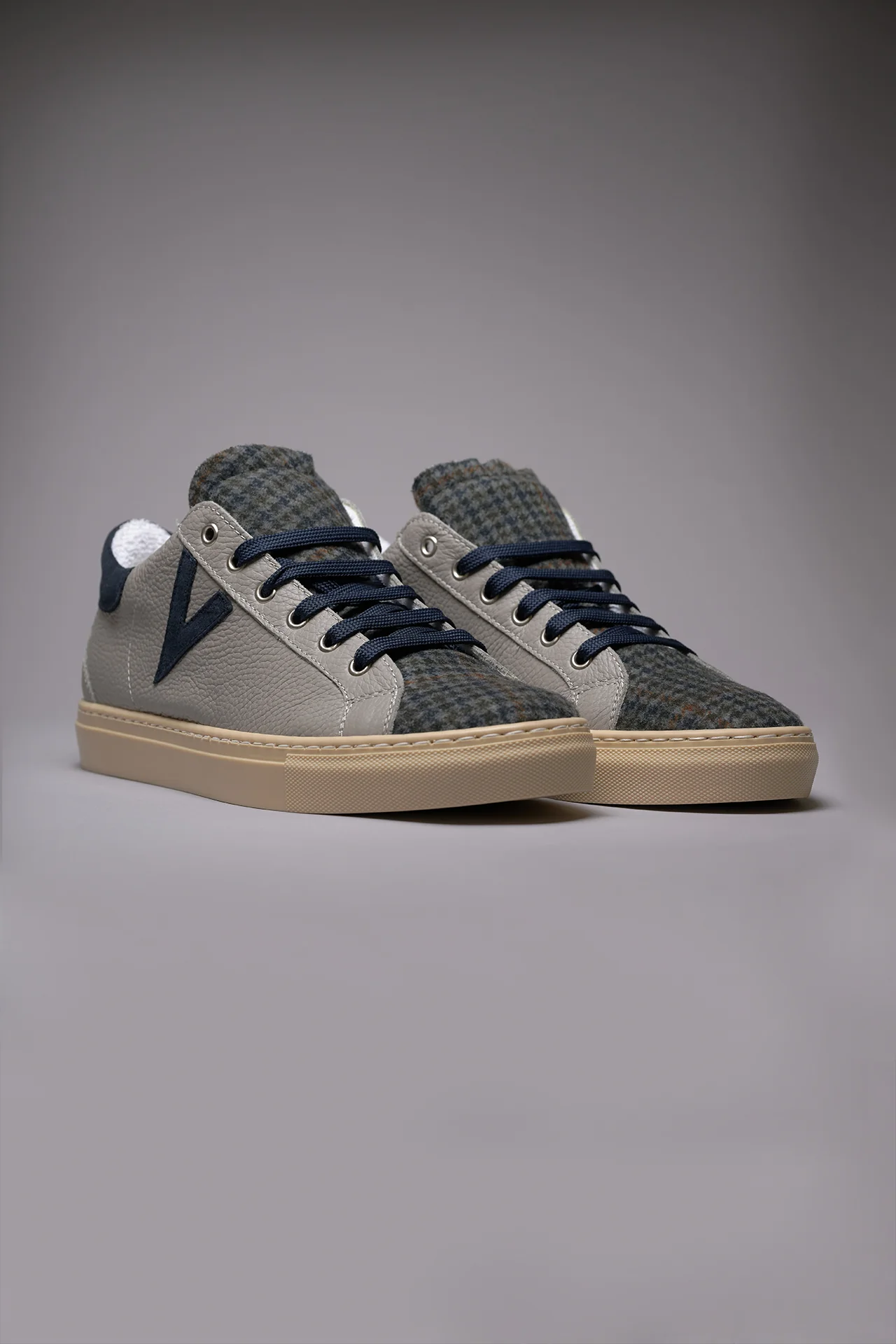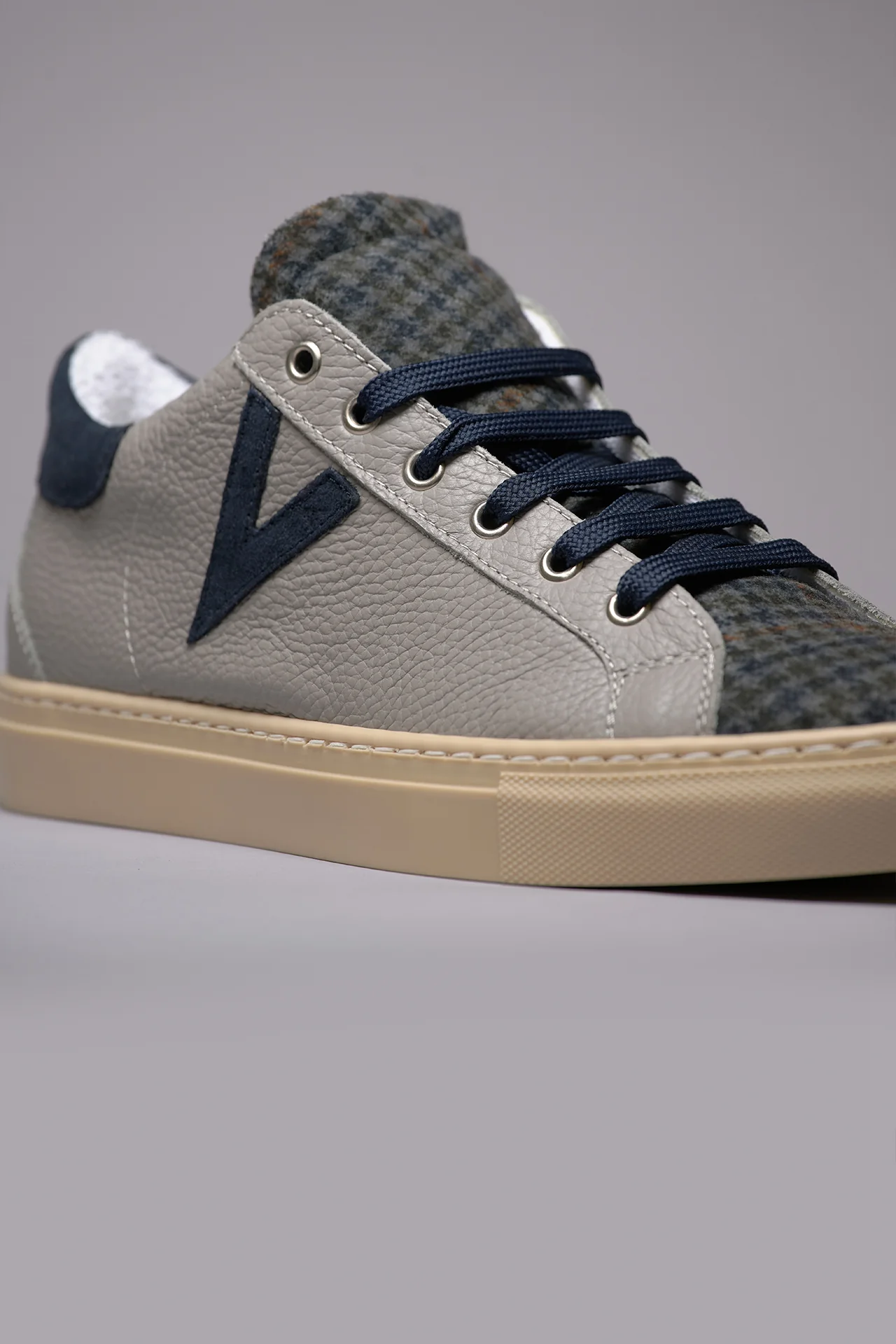 OLYMPIC – Sneakers a suola bassa in pelle martellata Grigia con linguetta in tessuto Pied de Poule