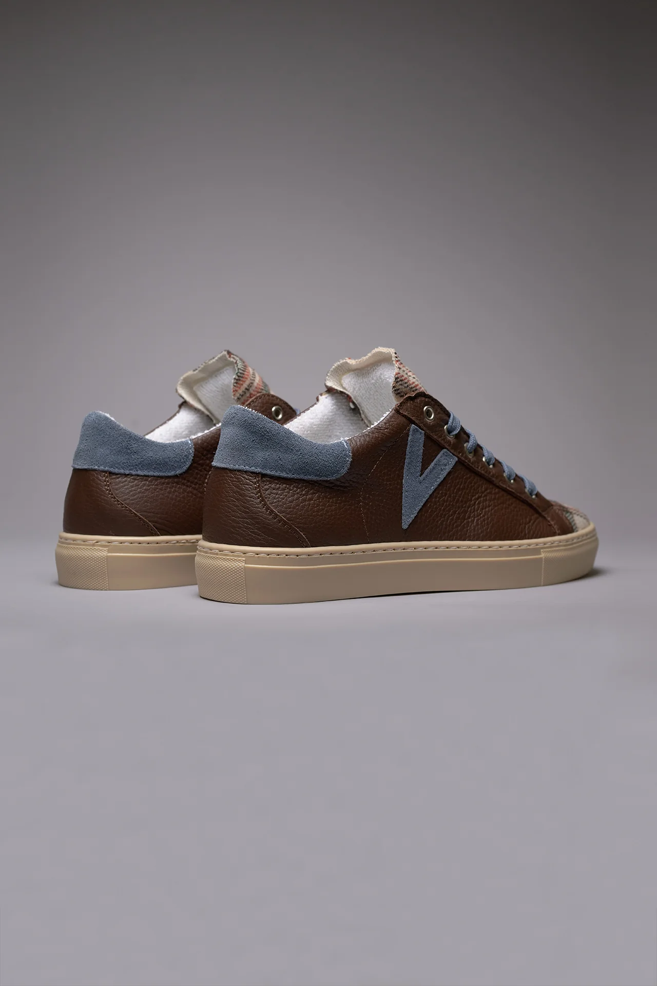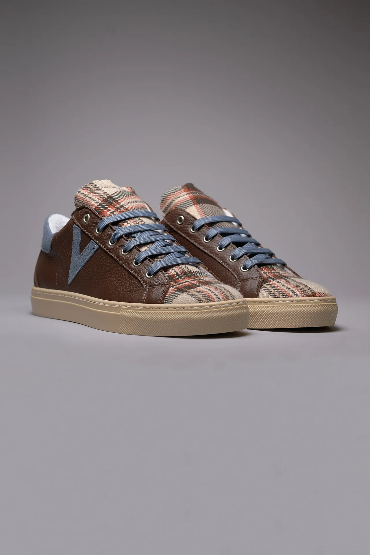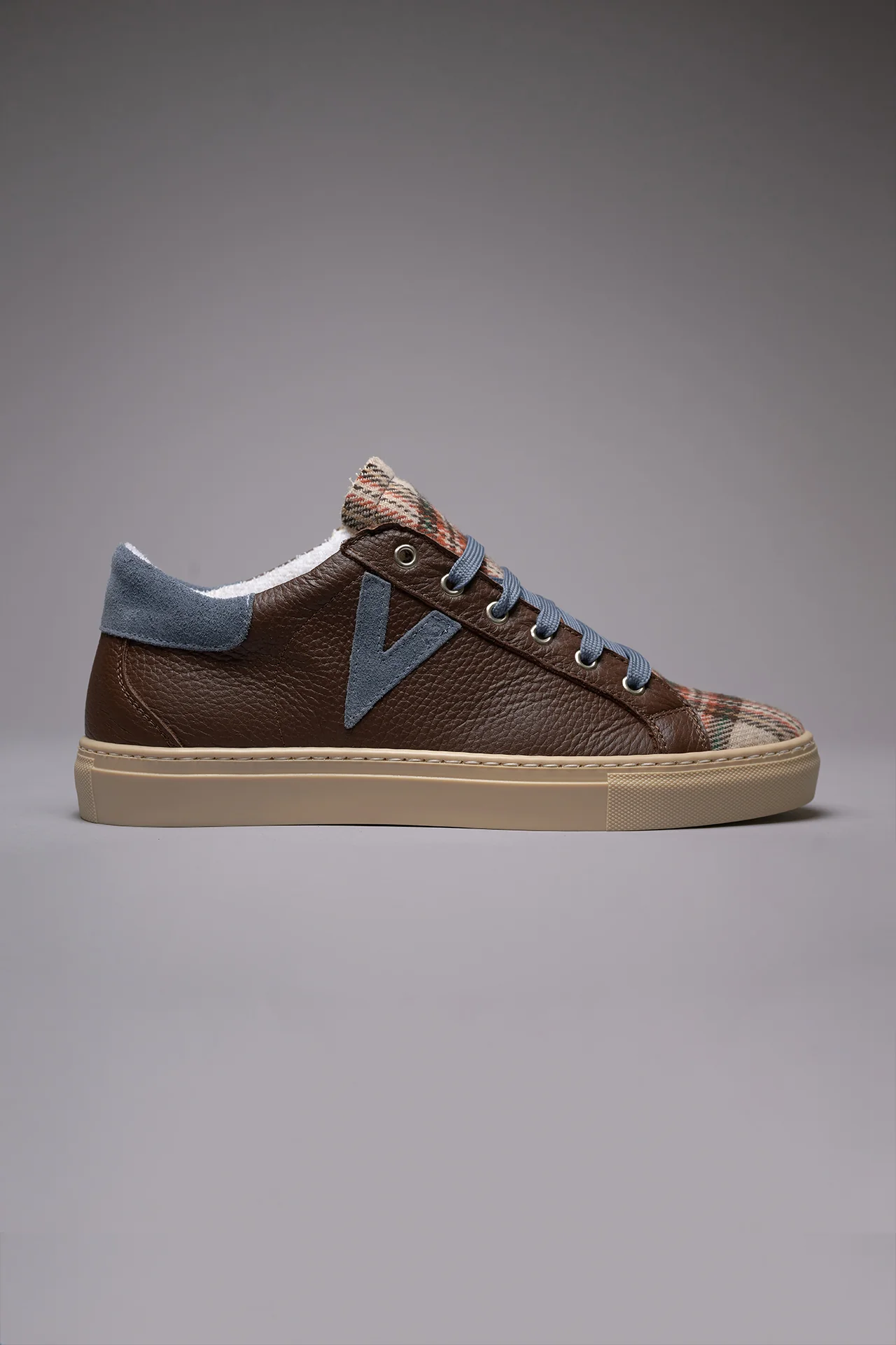 OLYMPIC – Sneakers a suola bassa in pelle martellata Moro con linguetta in tessuto Scozzese