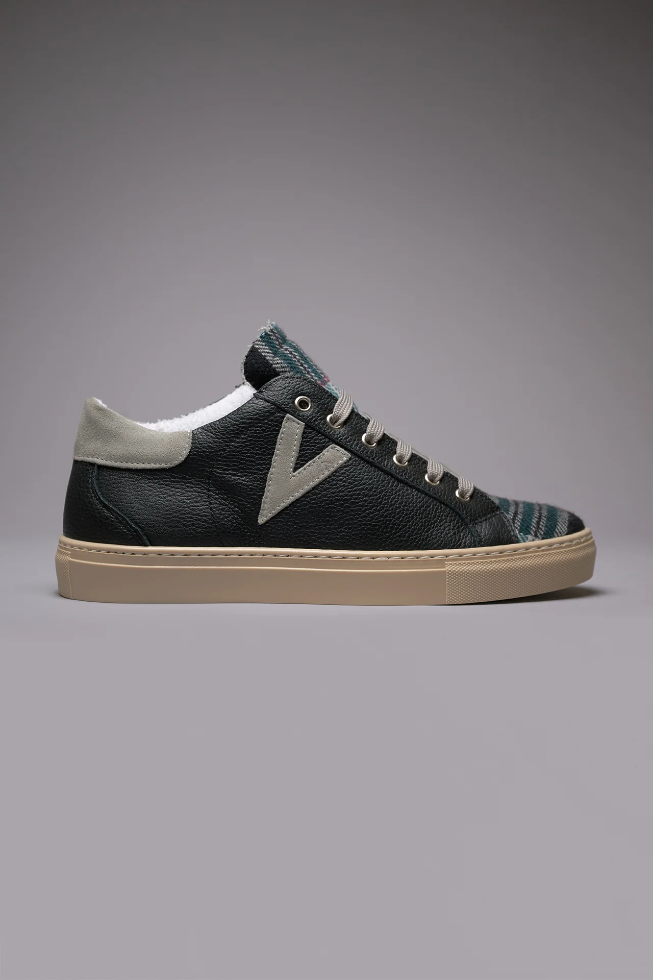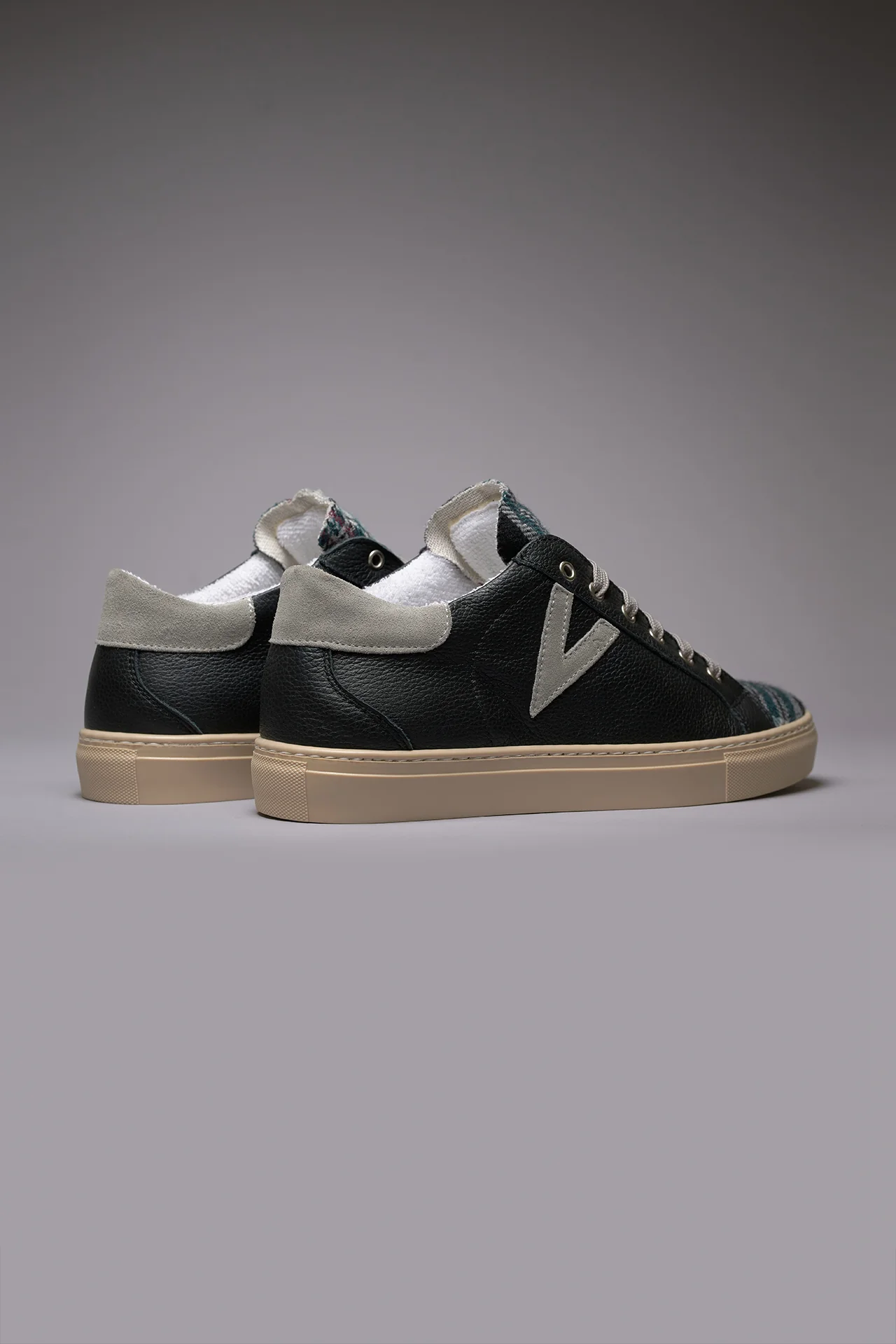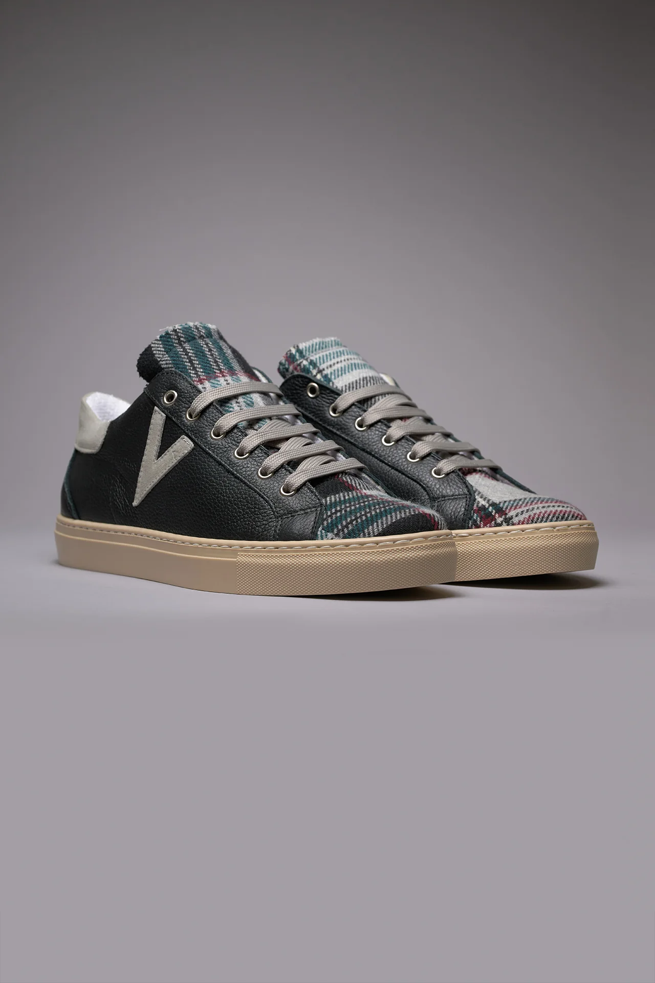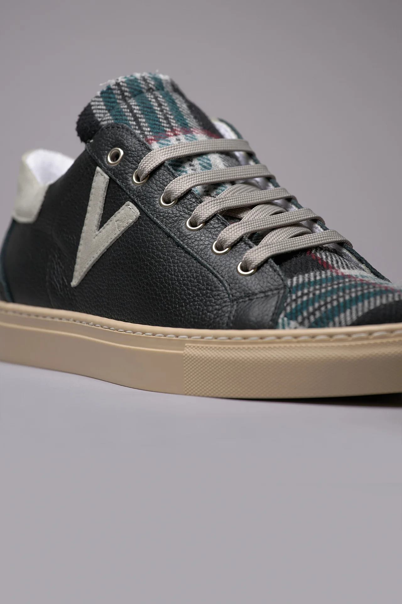 OLYMPIC – Sneakers a suola bassa in pelle martellata Nera con linguetta in tessuto Scozzese Nero